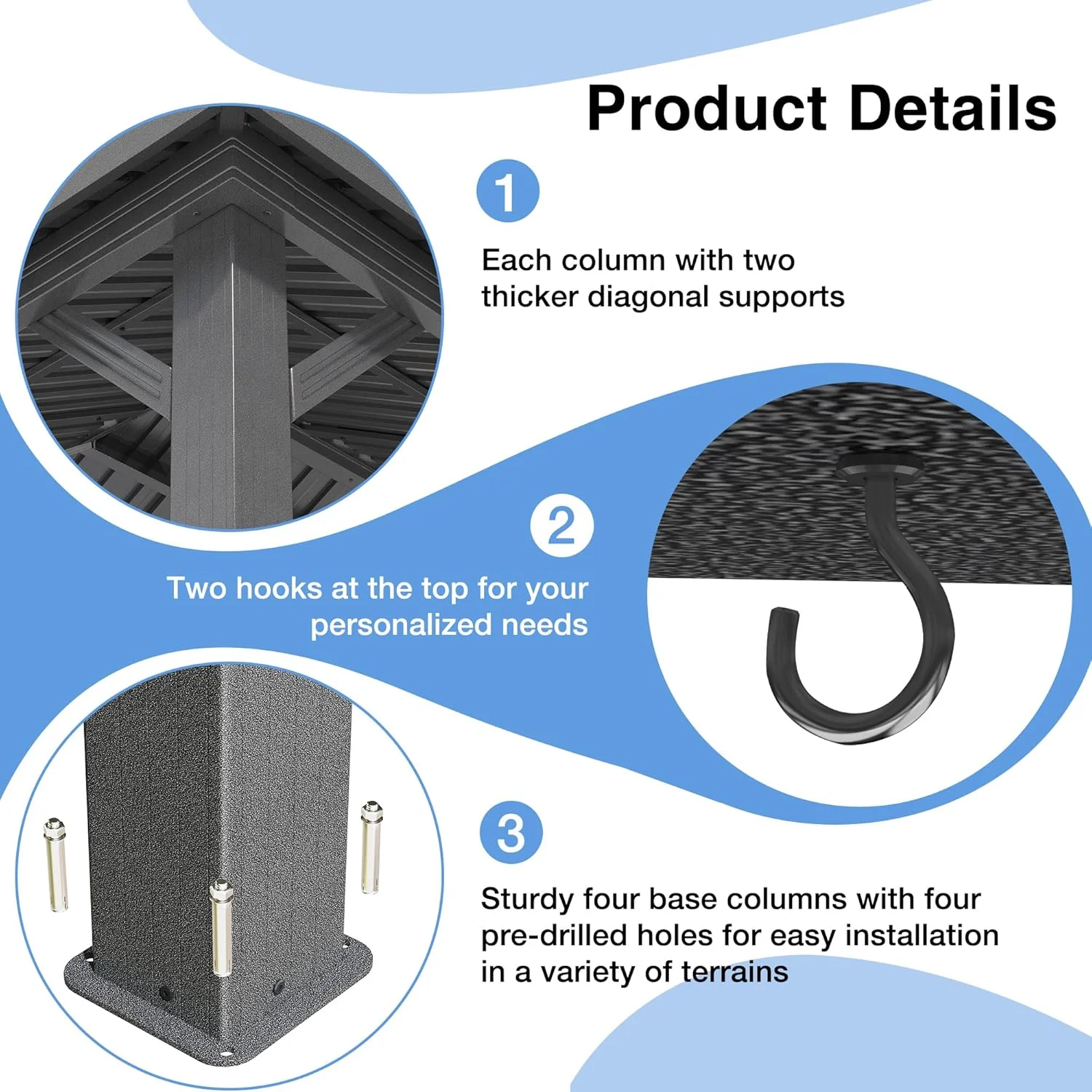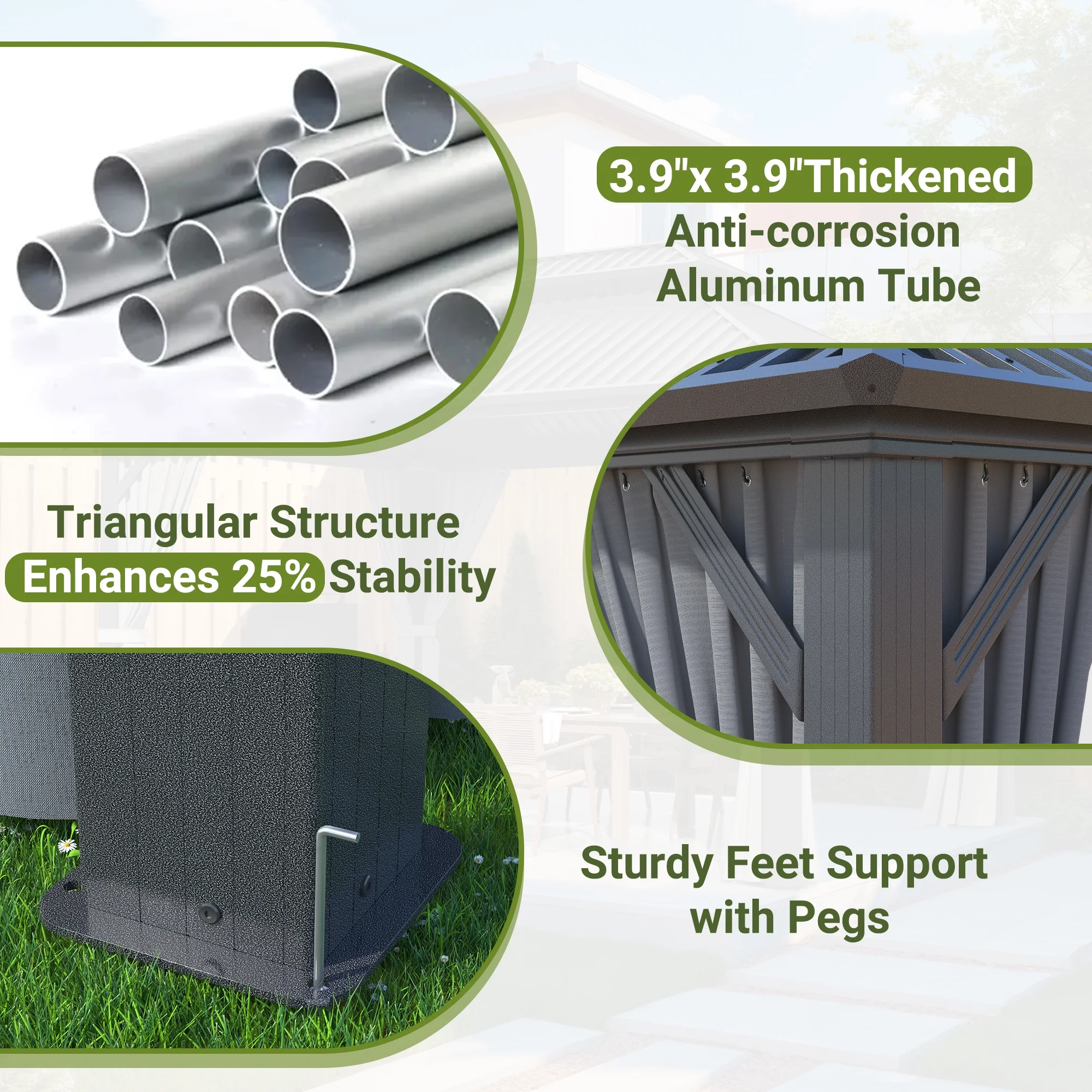 - ��STURDY ALUMINUM FRAME��The frame of the gazebo is made of durable powder-coat aluminum that offers superior rust and corrosion resistance. The triangular structure and pre-drilled base design, combined with the unique 3.9 "wide foot nail reinforcement design, provide a 30% increase in stability, ensuring that the product remains stable even in uneven outdoor environments.