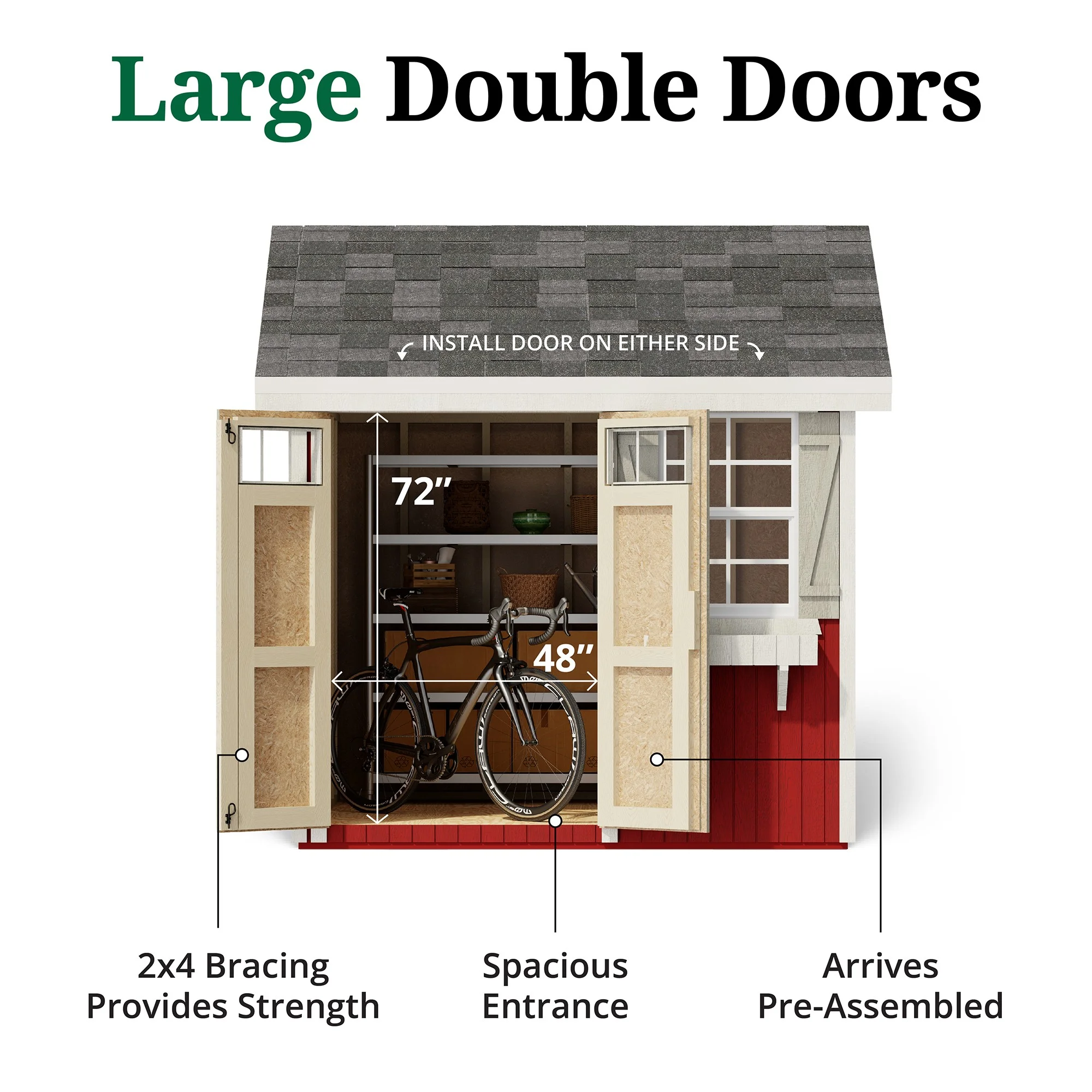 - Pre-assembled 48 in. W x 72 in. H double doors with locking door handle, large colonial hinges, and 2x4 bracing to prevent sagging