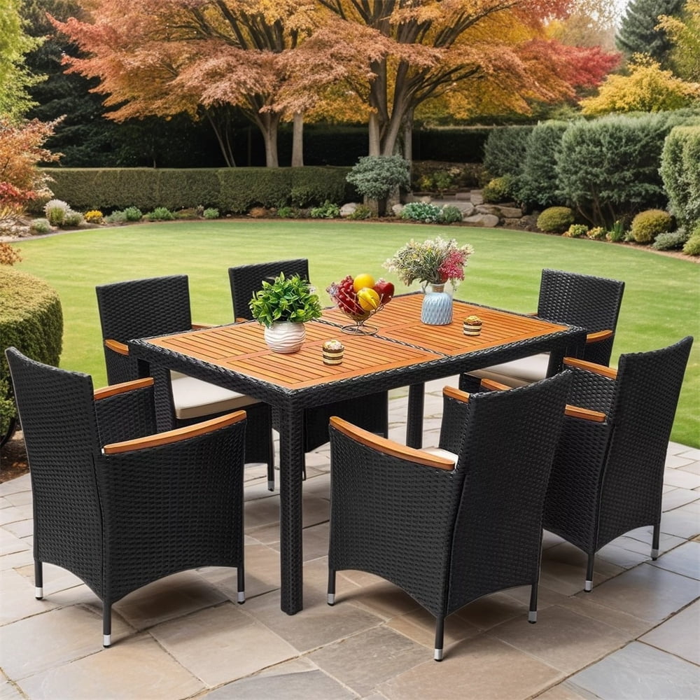 PRACTICAL PATIO DINING TABLE AND CHAIR SET: The classic nature-inspired patio table and chair set is the perfect addition to your outdoor space. The dining table and chairs with a table and 6 chairs are perfect for gathering with family and friends in the garden and patio for a relaxing time.