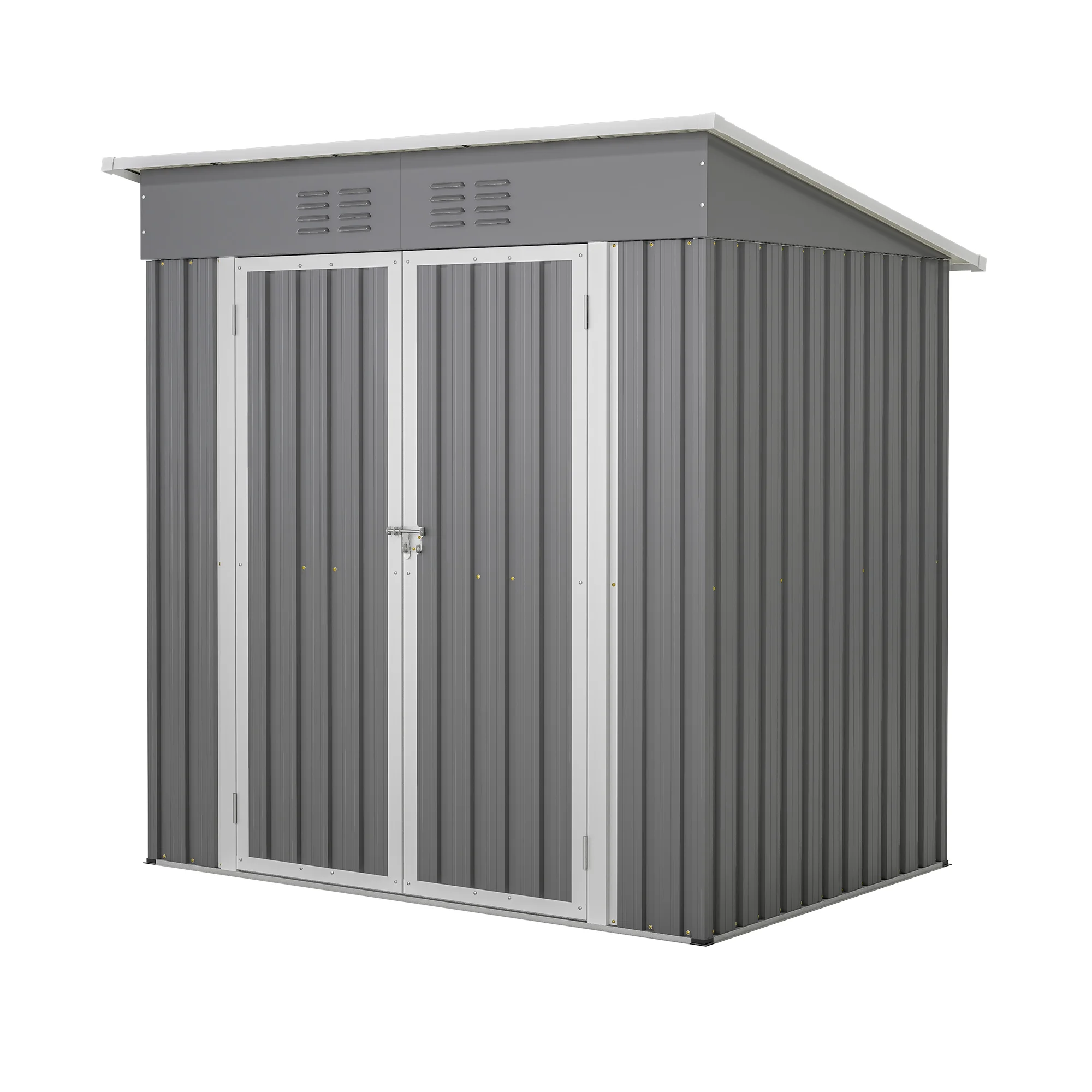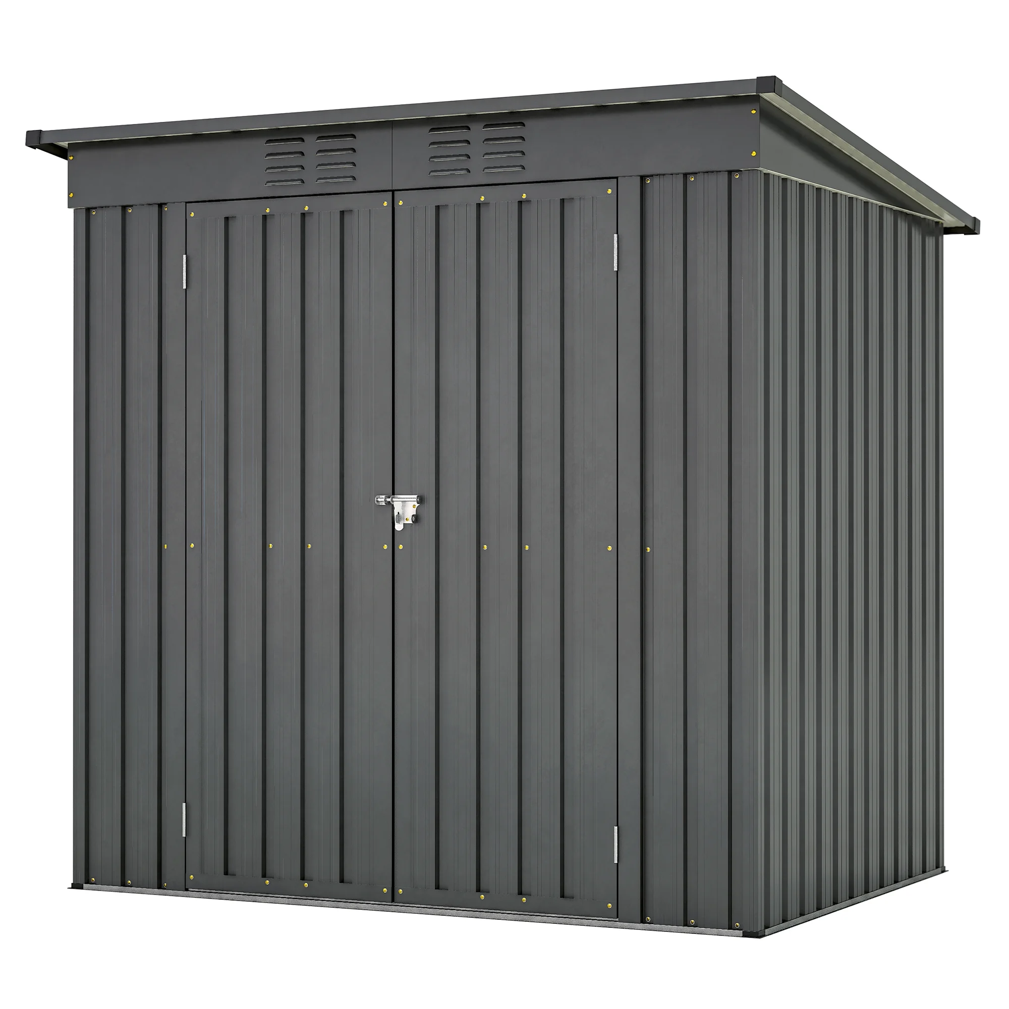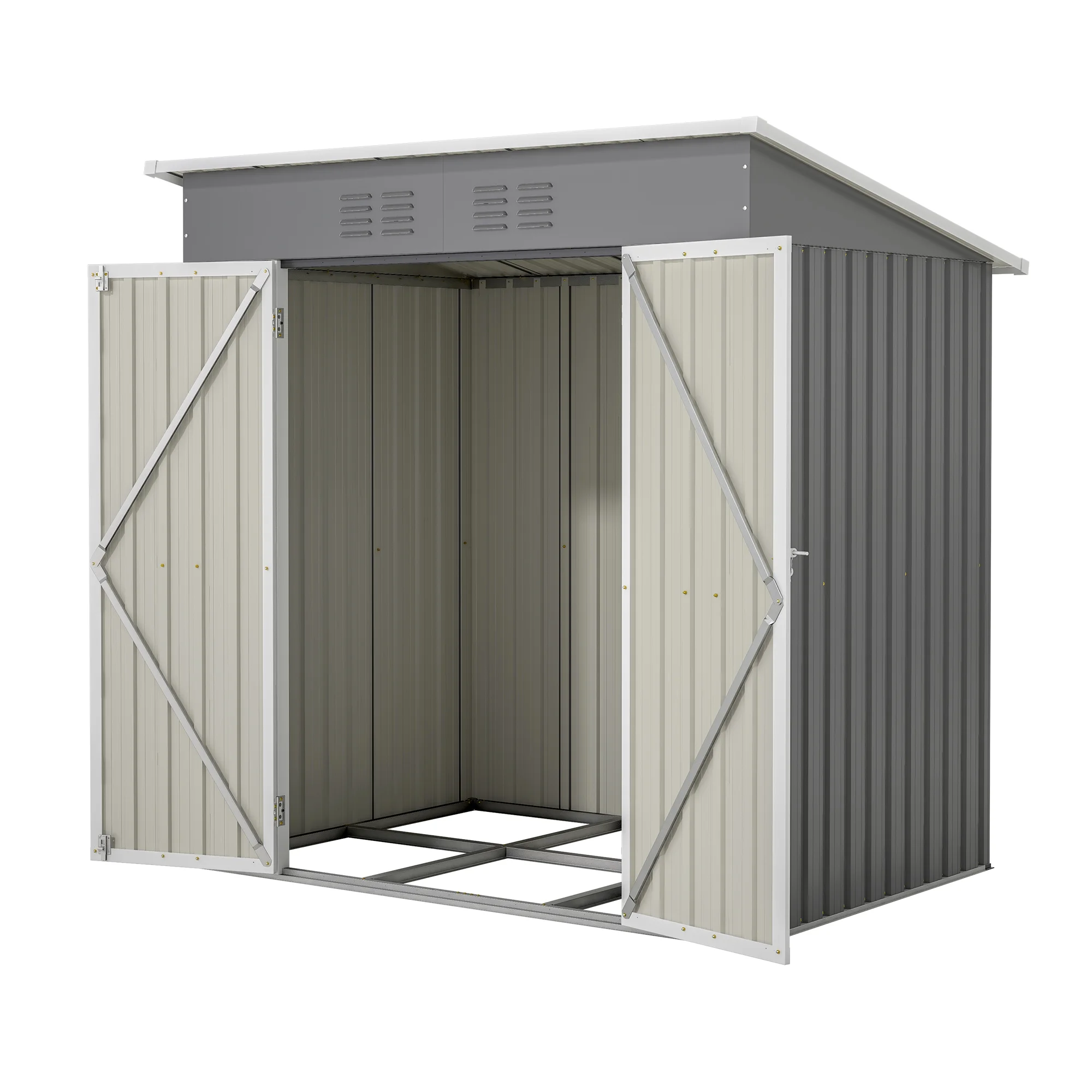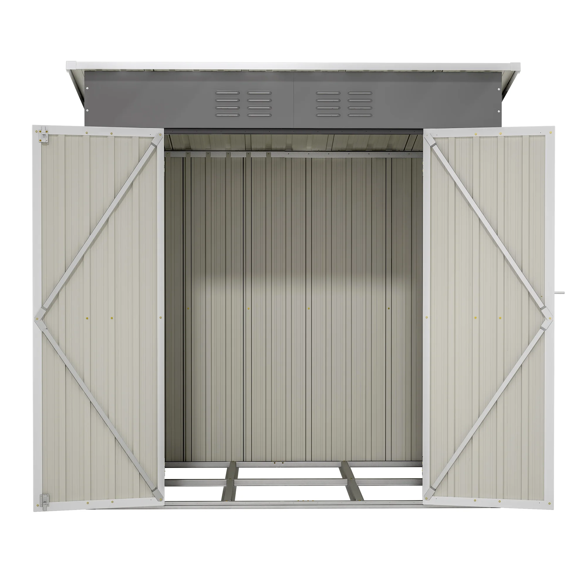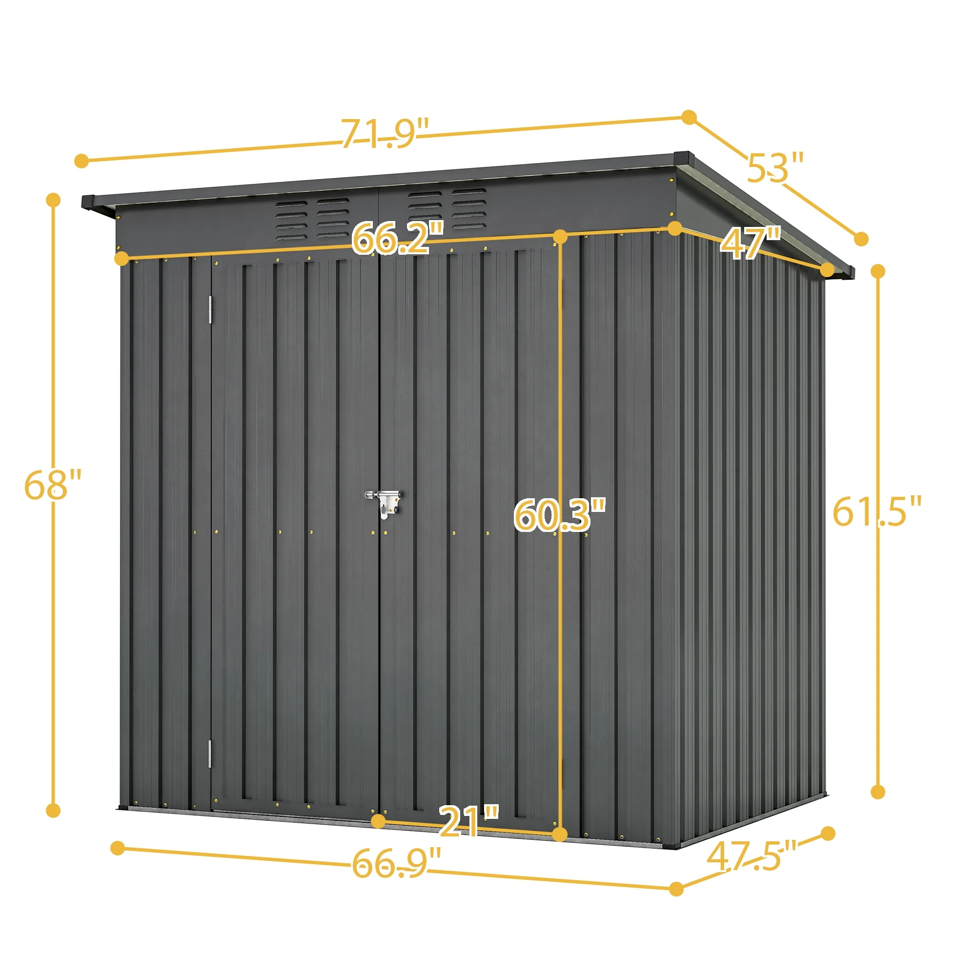 Constructed with sui generis aluminum frames and galvanized steel panels coated with eco-friendly paint. It can withstand harsh weather conditions for at least 10 years, providing long-lasting use and peace of mind. Unlike typical sheds with plastic vents, ours features two integrated punched vents that won't deteriorate against sunlight. This design enhances air circulation and light, helping to prevent sweltering in summer and trembling in winter. The double-hinged doors offer more customization opportunities than a sliding door, while a heavy-duty complimentary padlock ensures extra safety. We've upgraded the product height for your comfort. With a door height of 60.3" and an overall height of 68", you can enter the shed without feeling cramped. The uniquely designed aluminum frames provide extra sturdiness and a smooth assembly process, requiring no prior experience. We also include two pairs of gloves to facilitate your installation. This versatile outdoor metal storage cabinet can be used as a tool shed, a pet house, a storage room for boxes, or even a garbage collection room to tidy your backyard. This is the ideal shed house for your backyard!