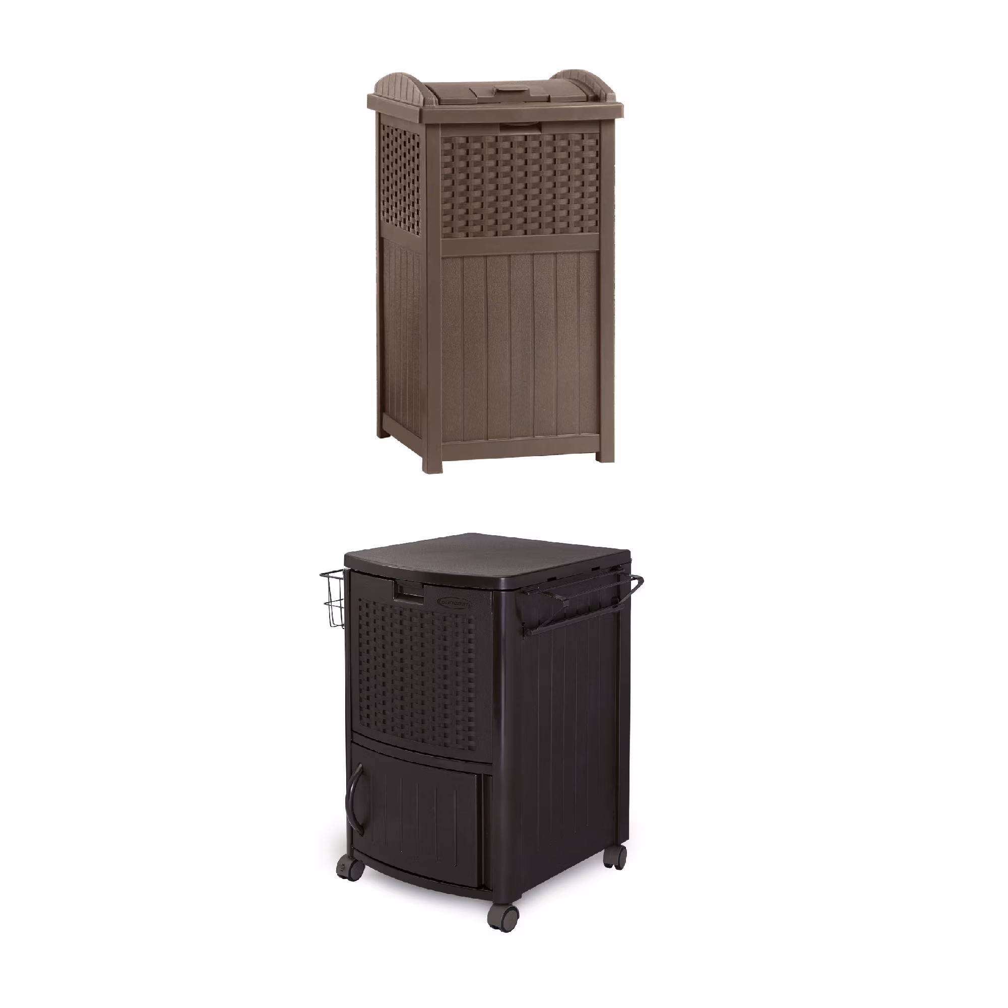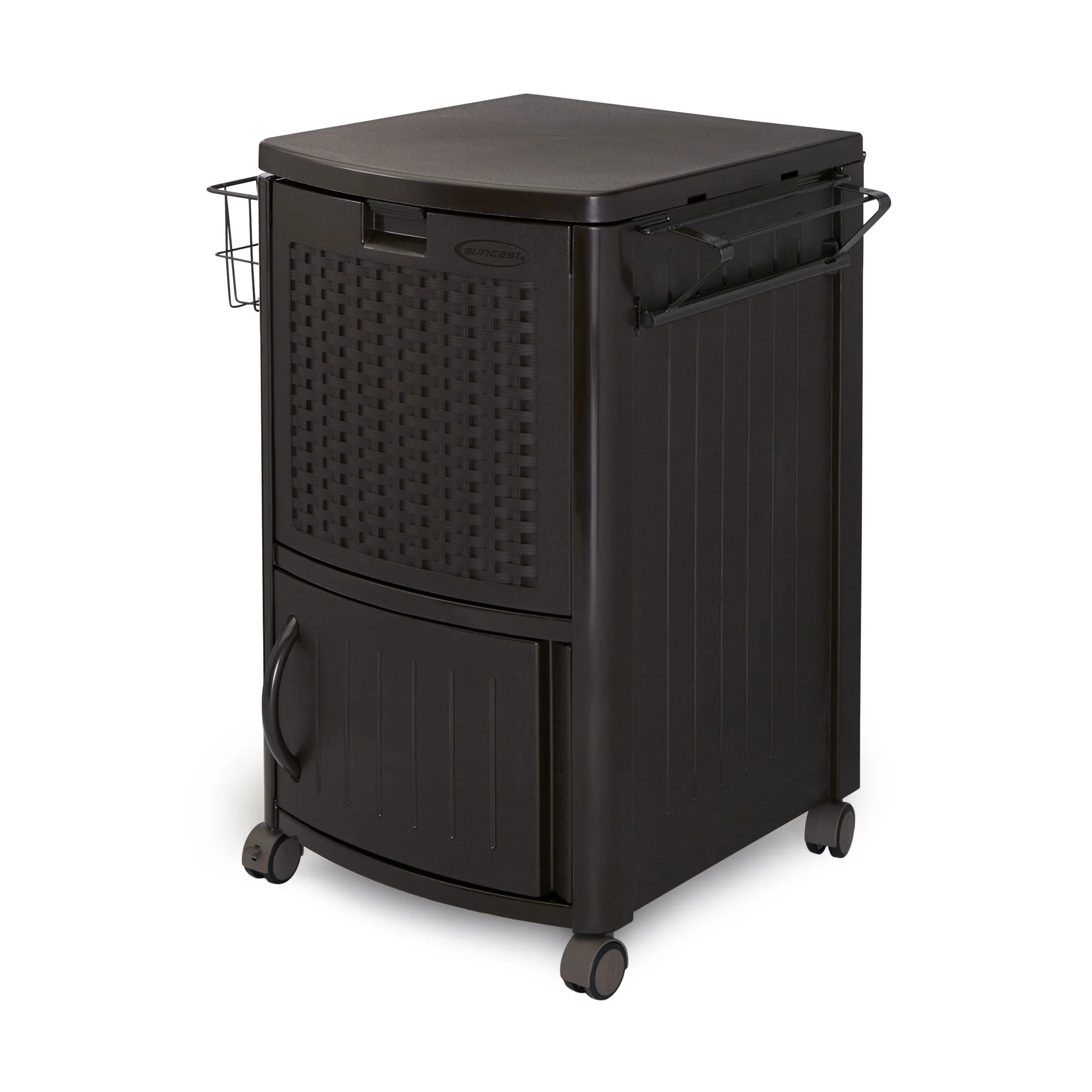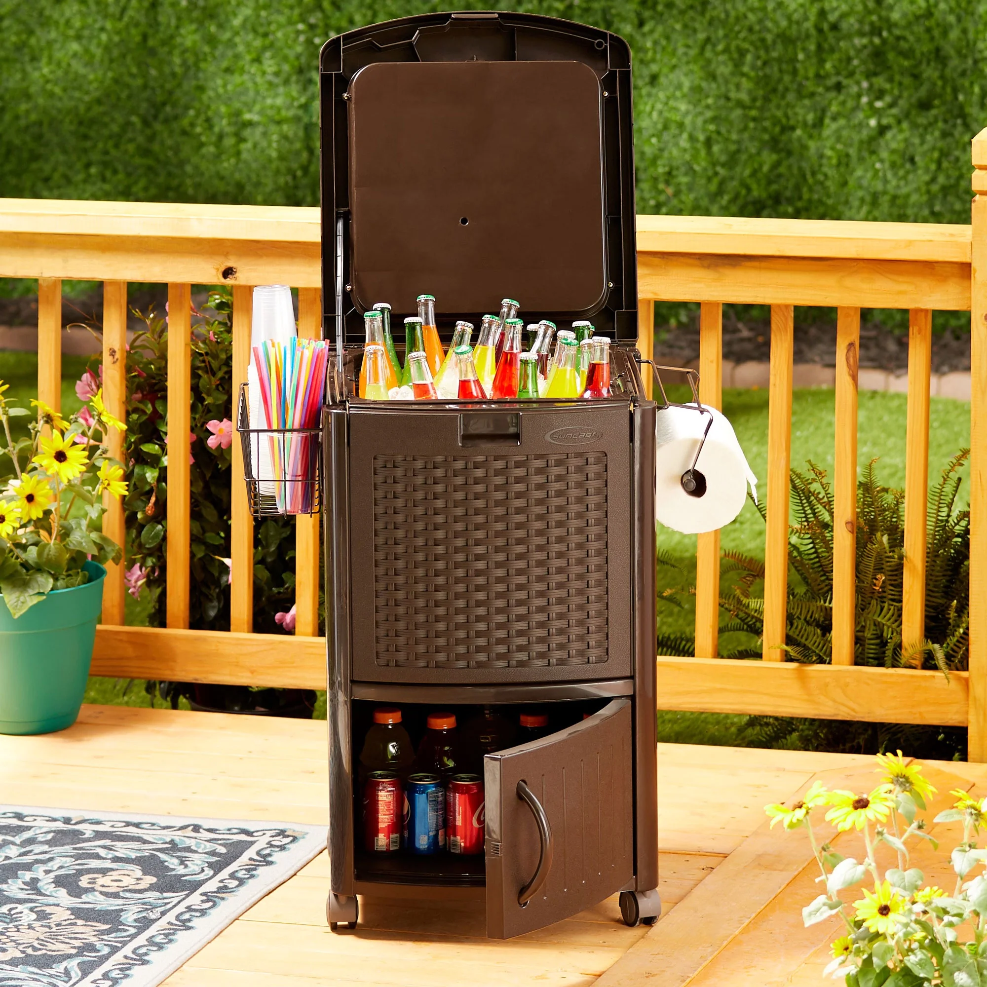 - Suncast 77 Quart Resin Wicker Patio Cooler with Cabinet and Wire Basket, Java