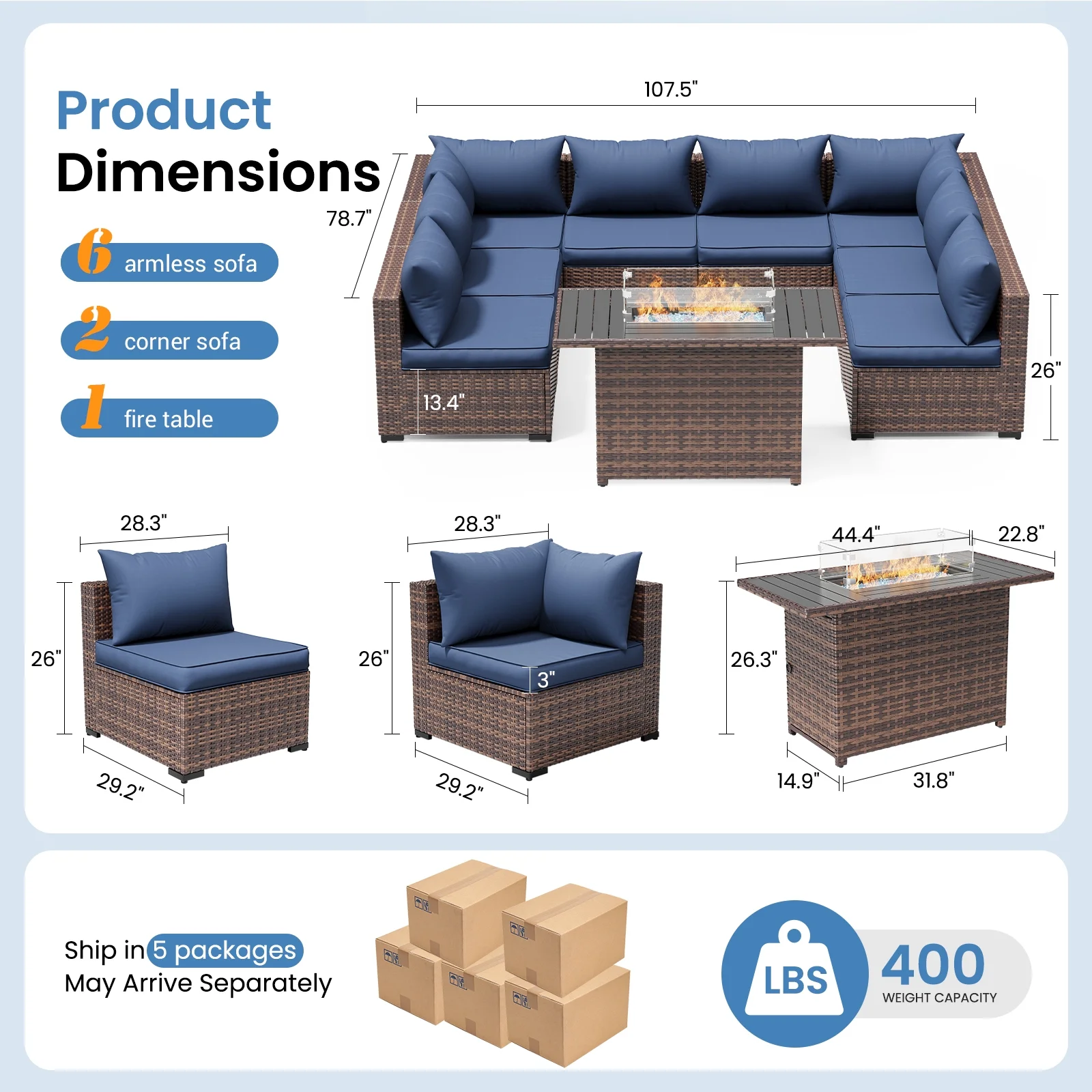 - Center sofa: 28.3"x 29.2"x 26"(W x D x H)