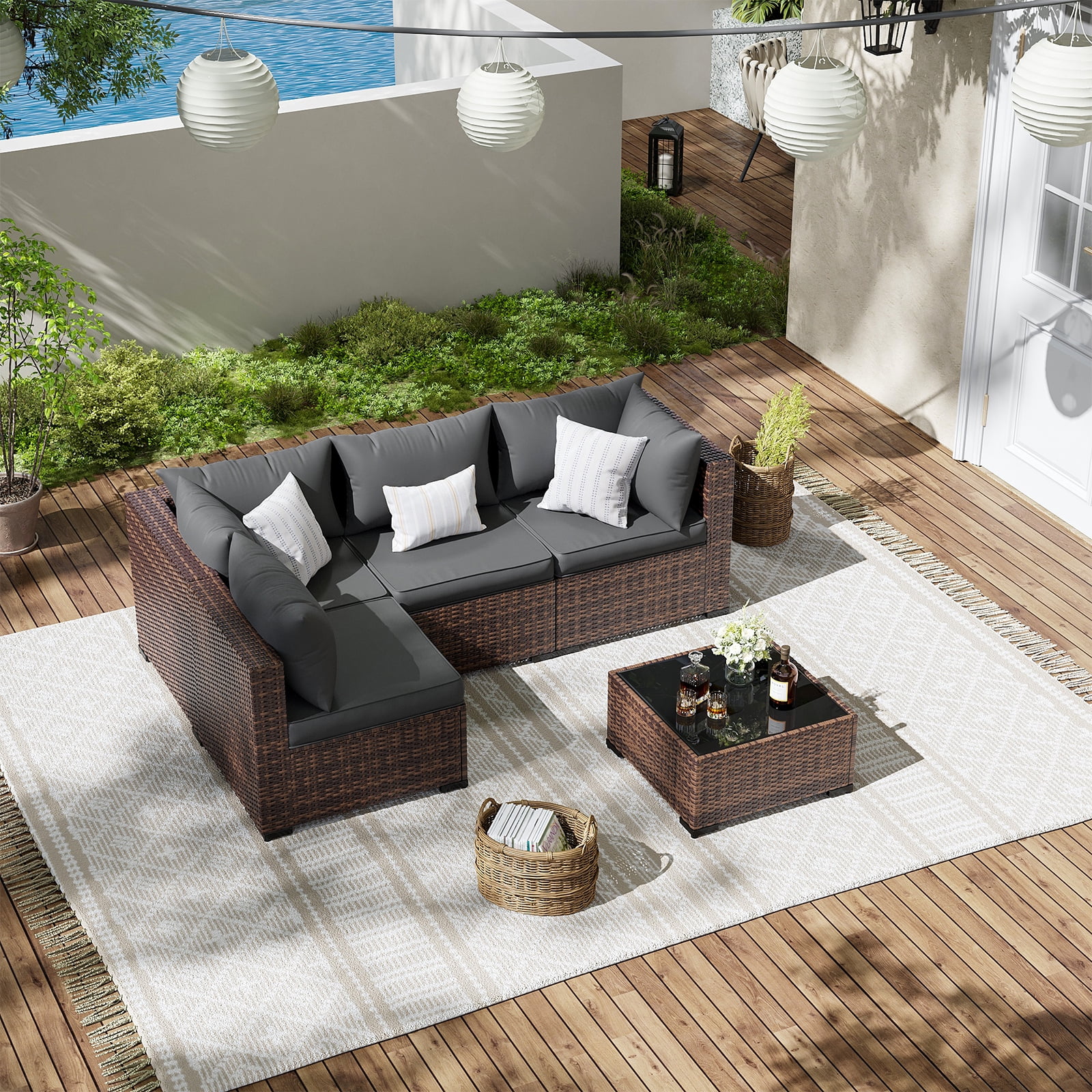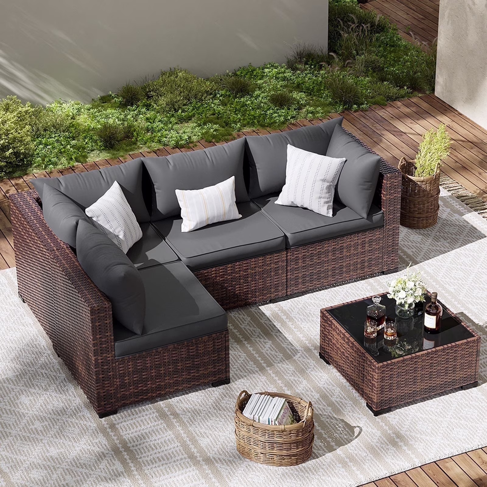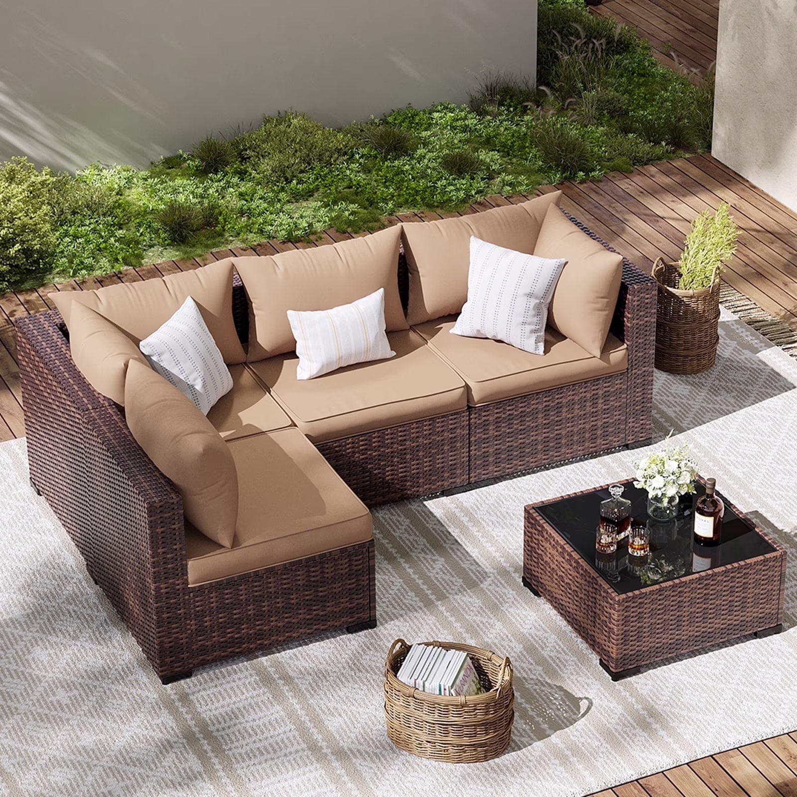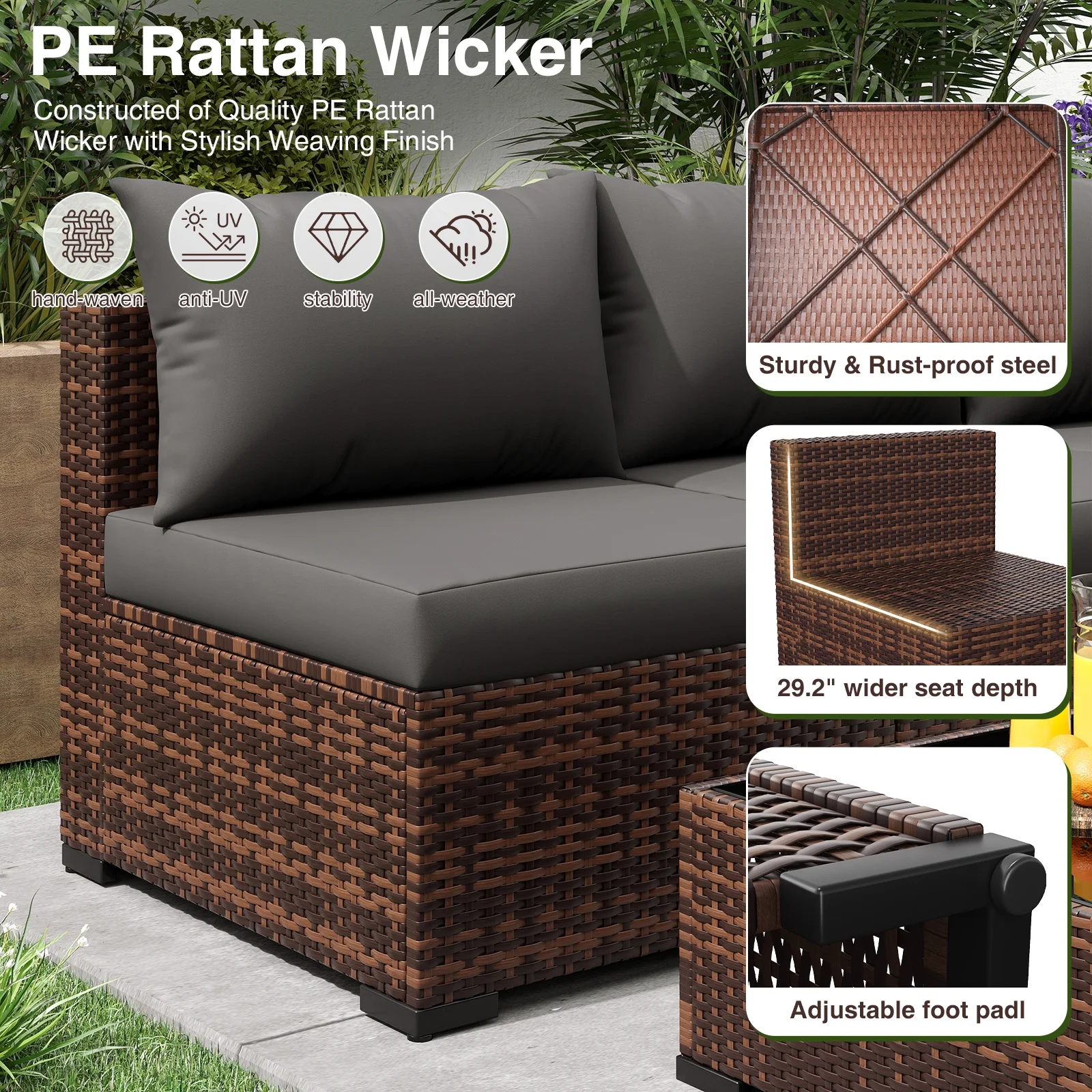 - Wicker Patio Furniture Set: The Sectional outdoor sofa is made of hand-woven Brown PE rattan wicker and sturdy steel frame. This high quality outdoor furniture set, water-resistant and sun-proof. The patio sectional adjustable feet prevent rain damage, making the backyard furniture more sturdy. Suitable for porch, balcony, backyard, garden.