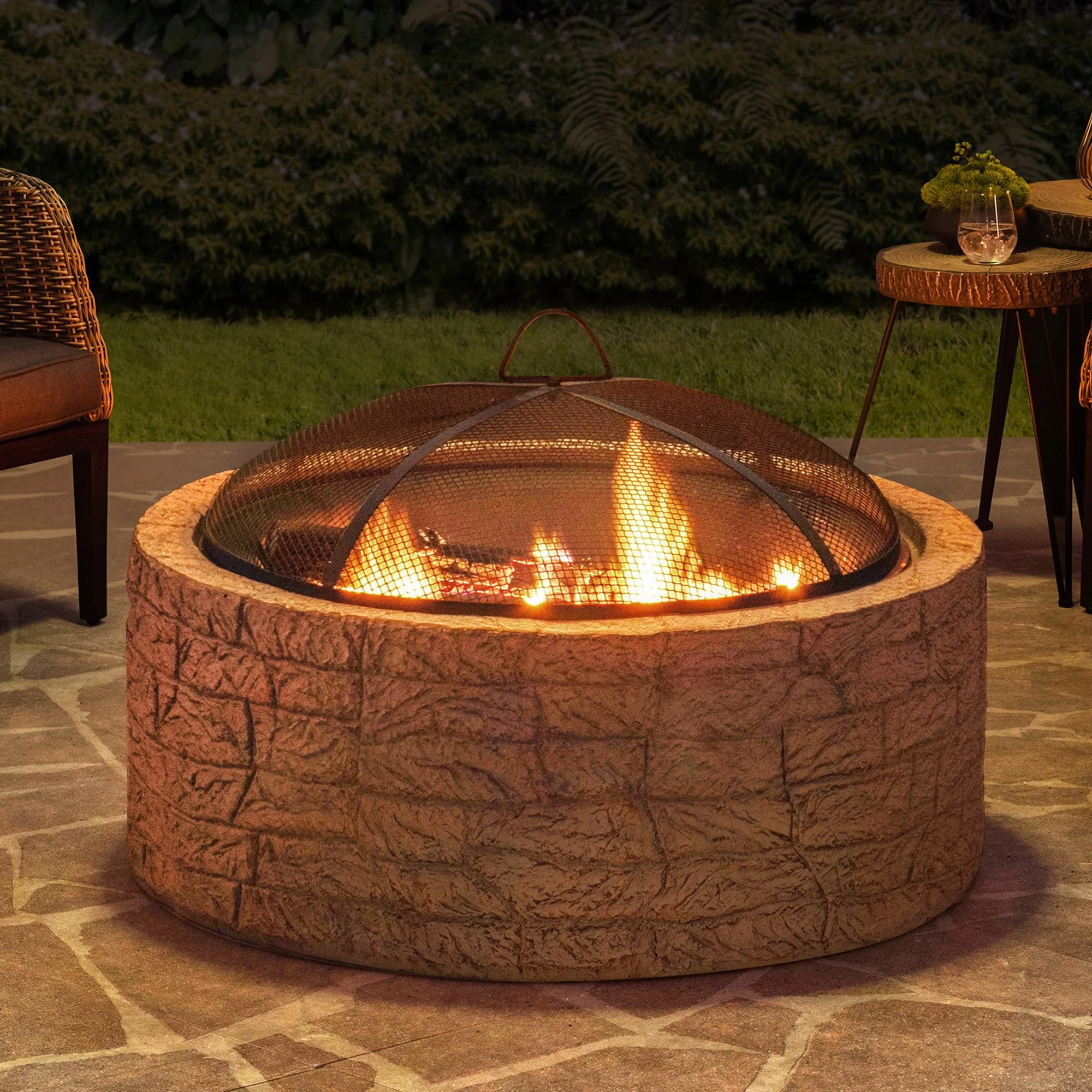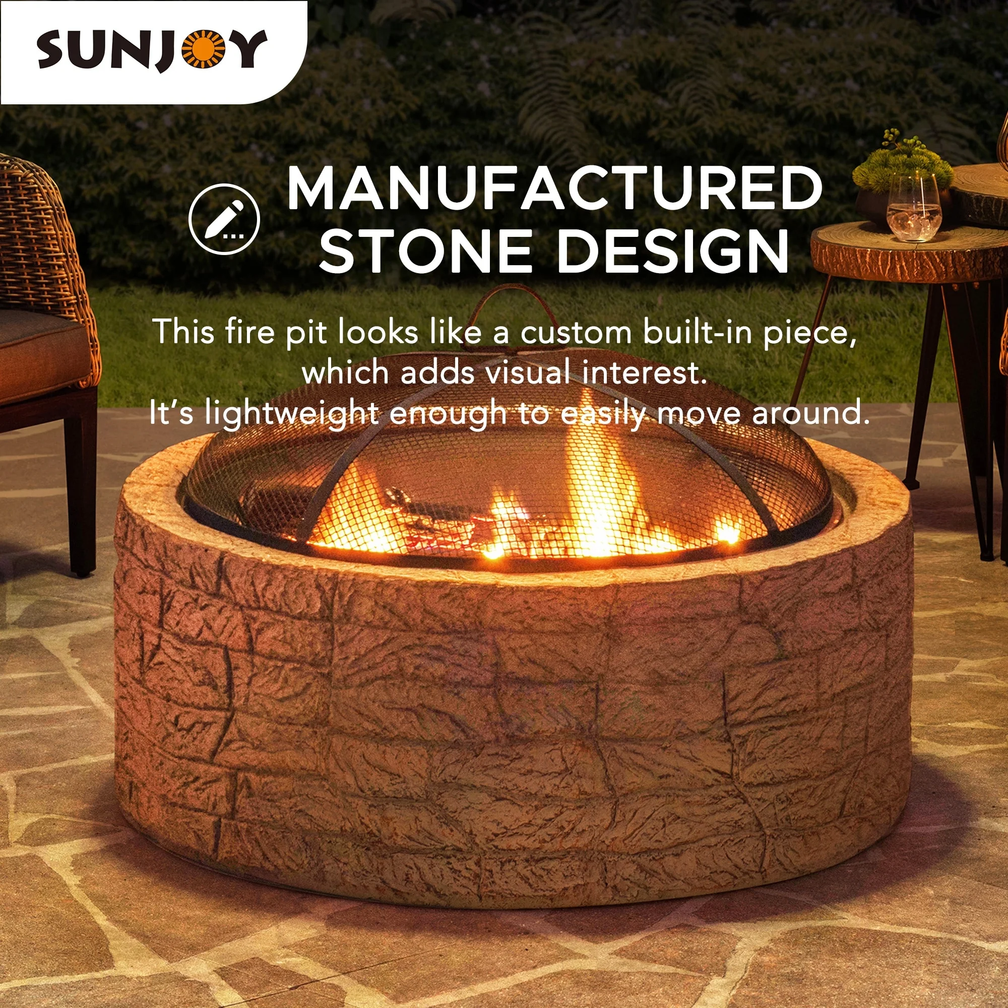 - Fire Poker Included: A fire poker is provided for this stone fire pit to stir the firewood and to easily lift the mesh cover.
