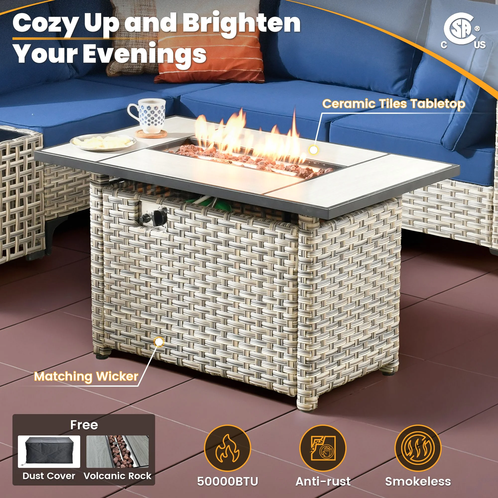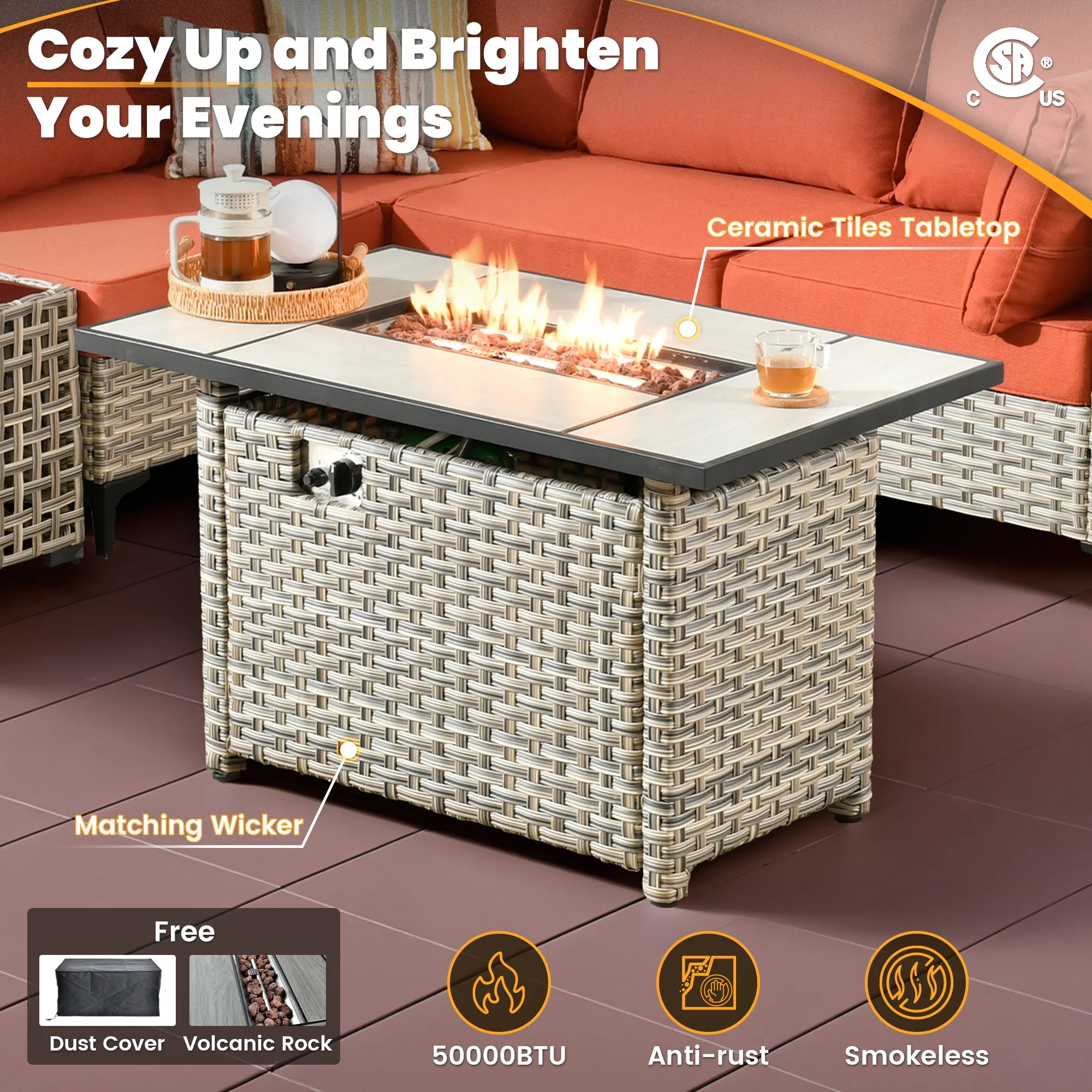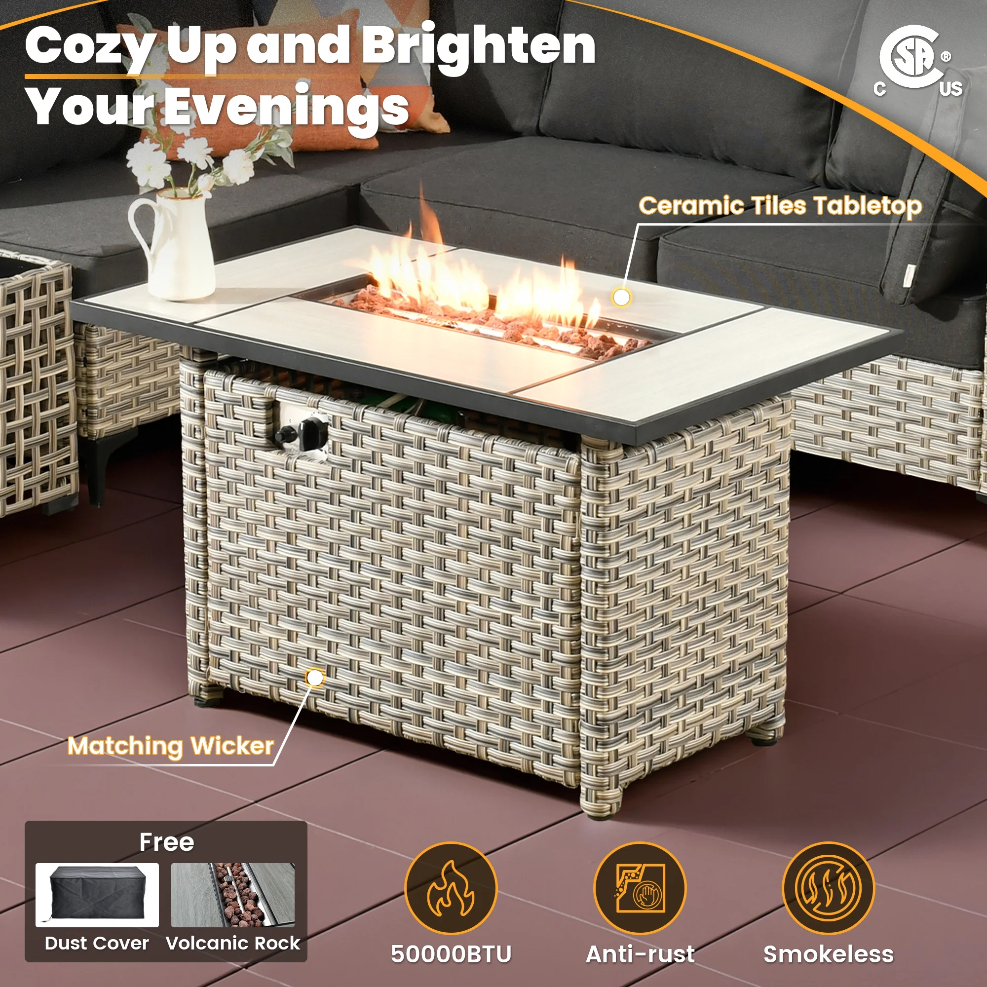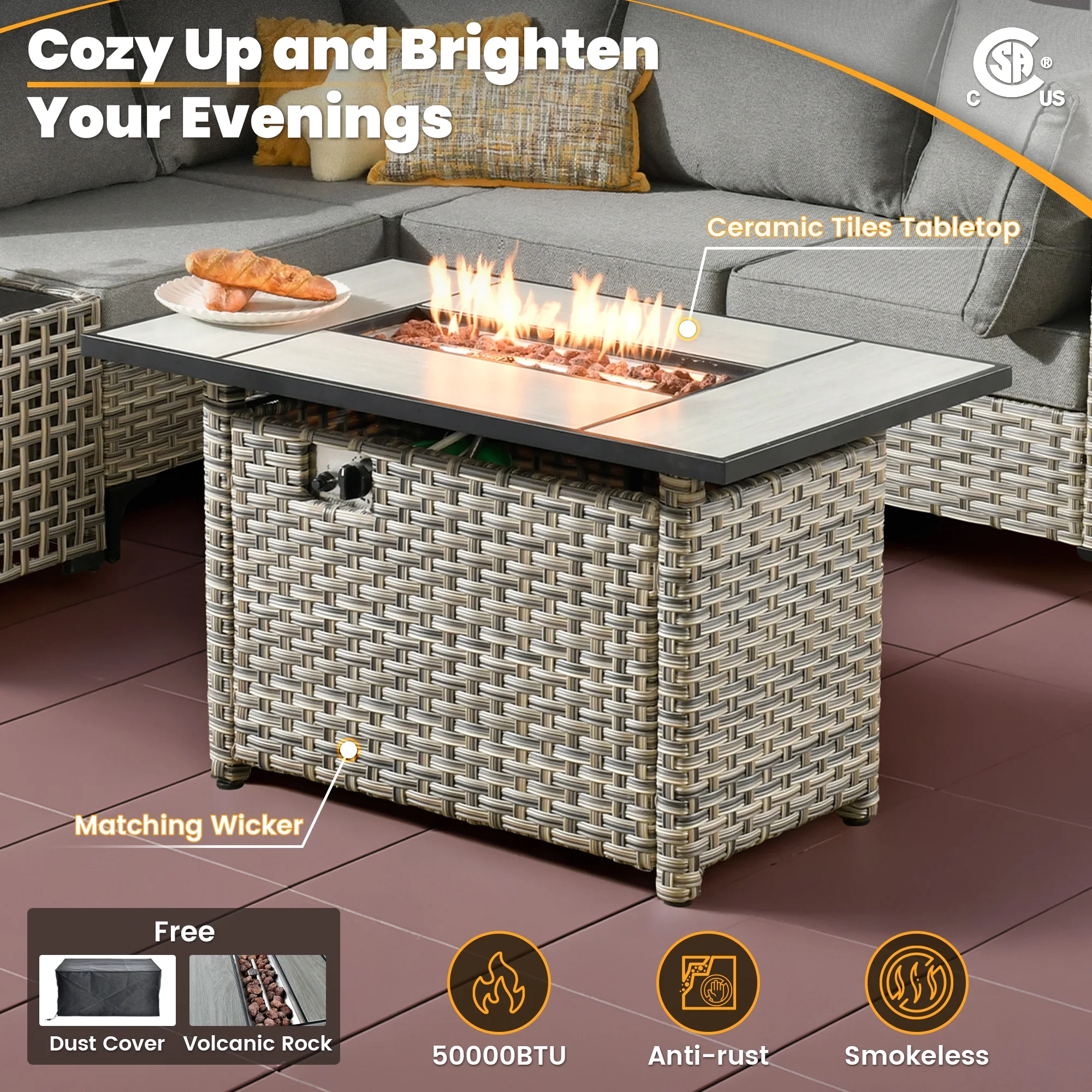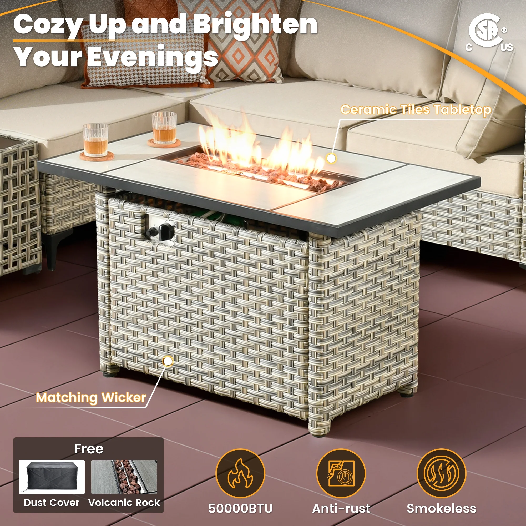 - CSA-certified Fire Pit : With a powerful 50,000 BTU burner, this CSA-certified fire pit ensures warmth for cool evenings. In addition to its heating capabilities, the table's elegant surface is perfect for drinks and snacks, creating an inviting atmosphere for outdoor gatherings