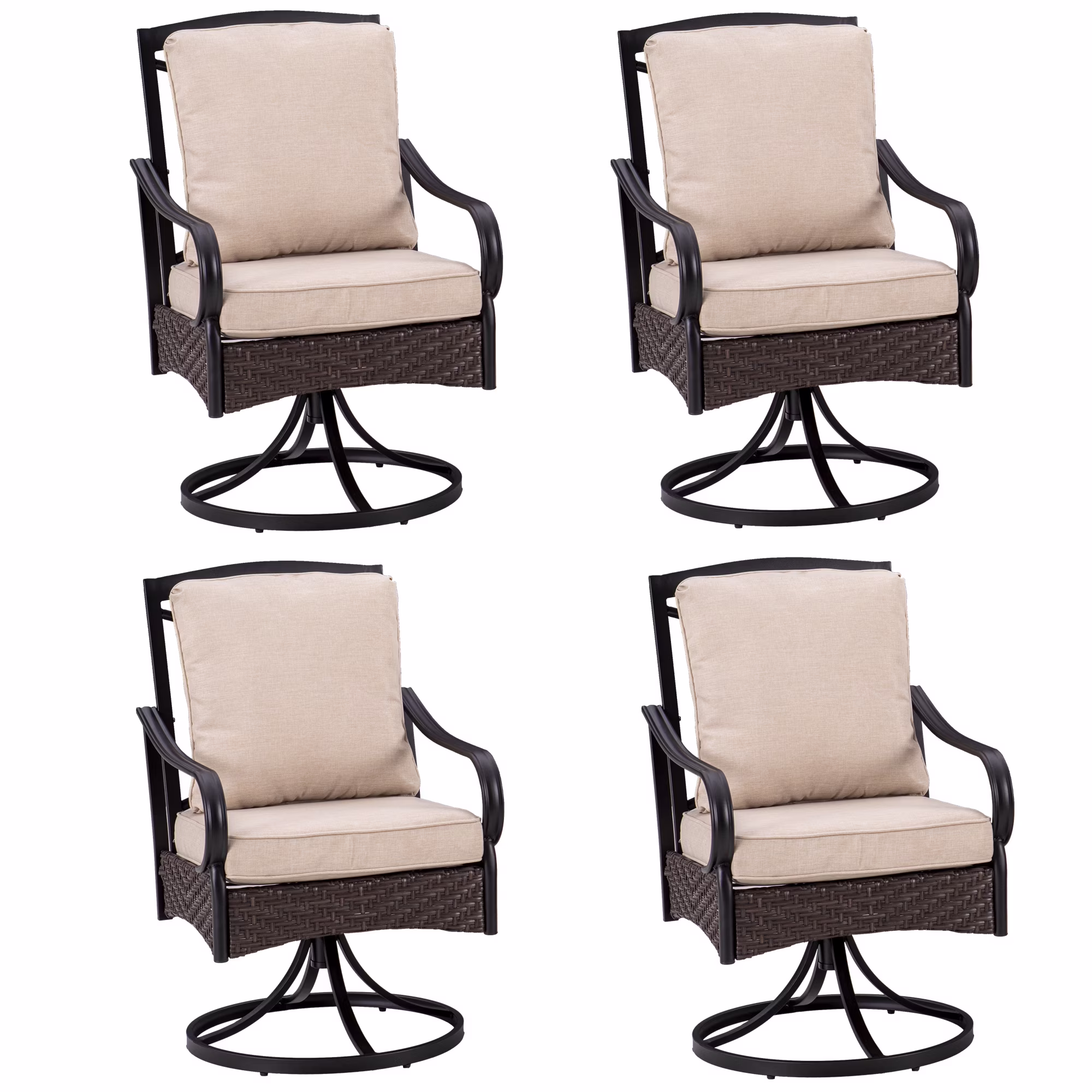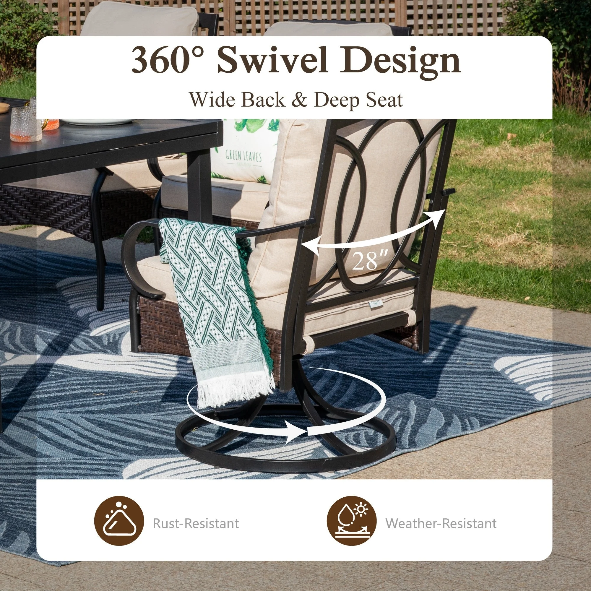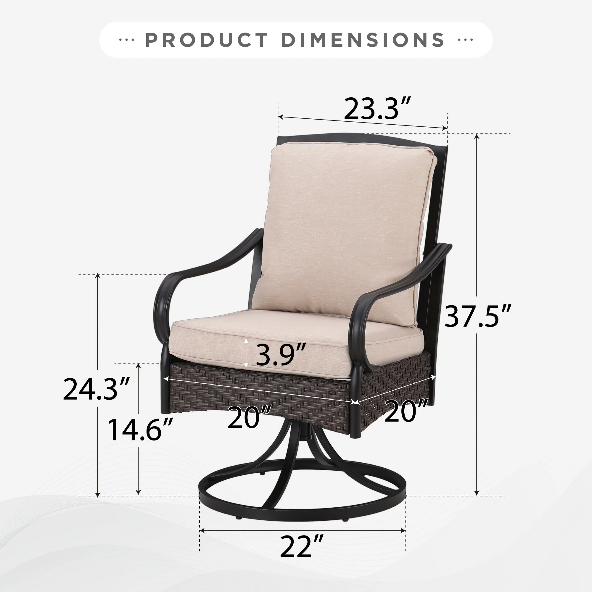 If you're looking for some patio set to enjoy your relaxing and dining time with your family, these wicker chairs might just be the ones for you. The chairs are made of thickened steel frame and premium PE rattan, which is duable to withstand snow, rain, wind and high temperatures well for long time using. This cushions are made of durable spun polyester with waterproof coating and thick sponge, featuring removable zippered cover, easy to clean and maintain. Features a round, swivel base and a comfortable specially designed seat, 360-degree swivel and slightly gentle rocking, ergonomic back support, curved smooth arms. Our chairs offer you ultimate comfort and support to make you relaxed. You'll surely enjoy this with your family in any time.