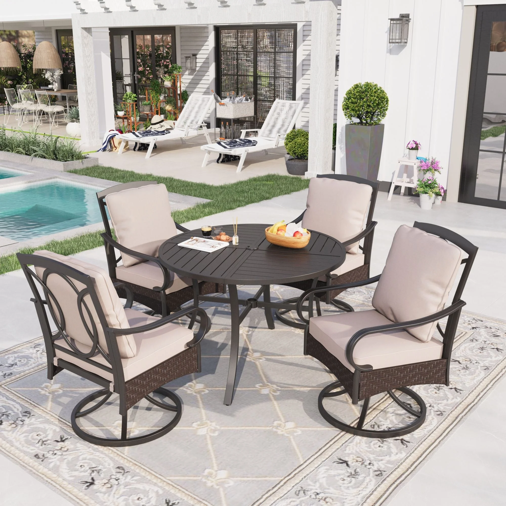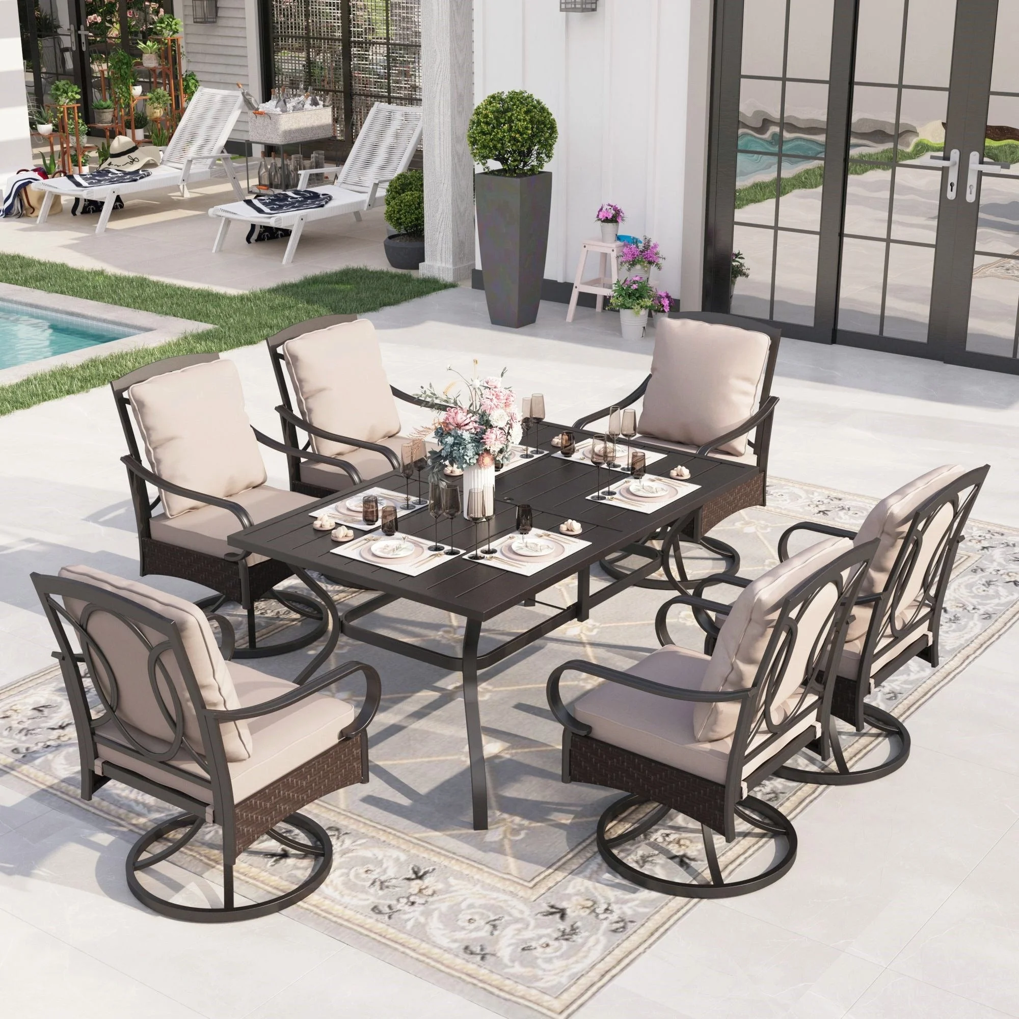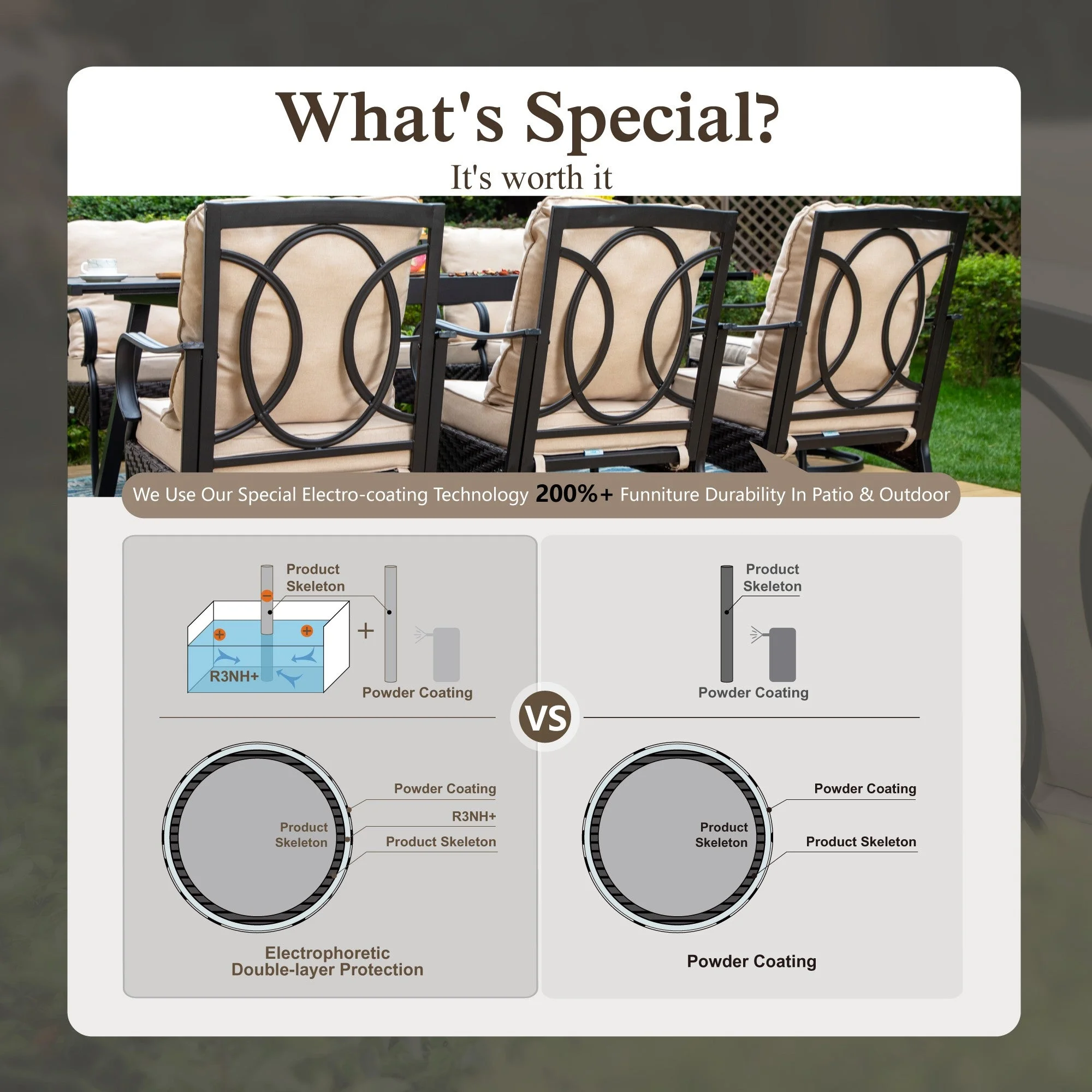 If you're looking for some patio set to enjoy your relaxing and dining time with your family, these wicker chairs might just be the ones for you. The chairs are made of thickened steel frame and premium PE rattan, which is duable to withstand snow, rain, wind and high temperatures well for long time using. This cushions are made of durable spun polyester with waterproof coating and thick sponge, featuring removable zippered cover, easy to clean and maintain. Features a round, swivel base and a comfortable specially designed seat, 360-degree swivel and slightly gentle rocking, ergonomic back support, curved smooth arms. Our chairs offer you ultimate comfort and support to make you relaxed. You'll surely enjoy this with your family in any time.