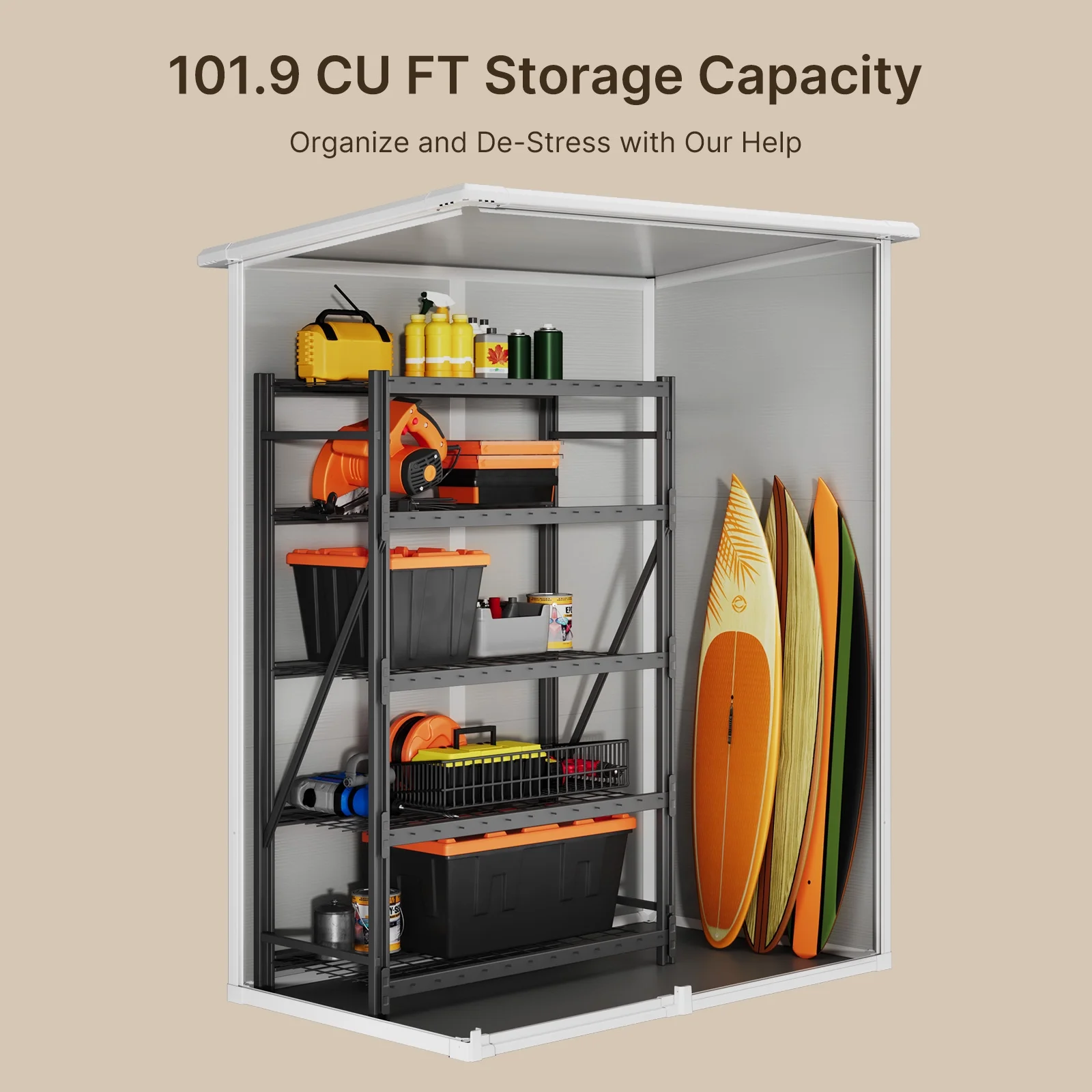 ?? Spacious and Versatile: With a generous capacity of 135.6 cu ft, this storage shed provides ample space to store gardening tools, lawn equipment, patio furniture, and other outdoor essentials. The versatile design allows for easy organization and accessibility of your belongings.
