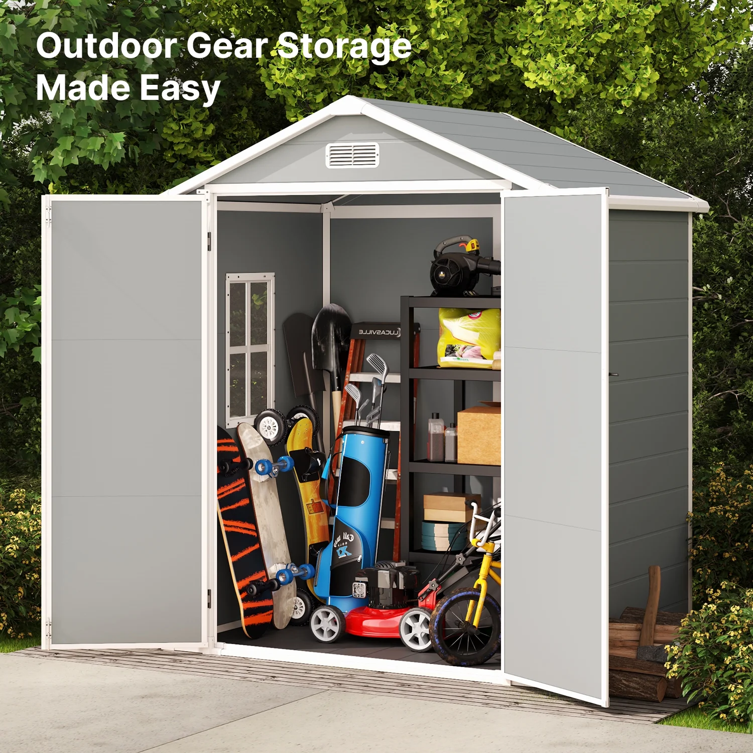 ��Spacious Storage: Large 6' x 4' capacity to store bikes, lawnmowers, grills, trash cans, garden tools, patio cushions, pool supplies, and more.