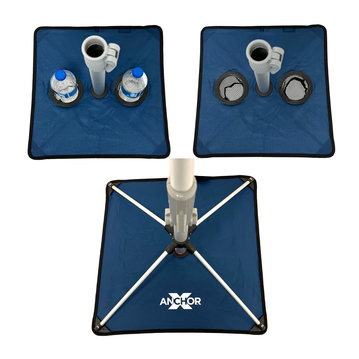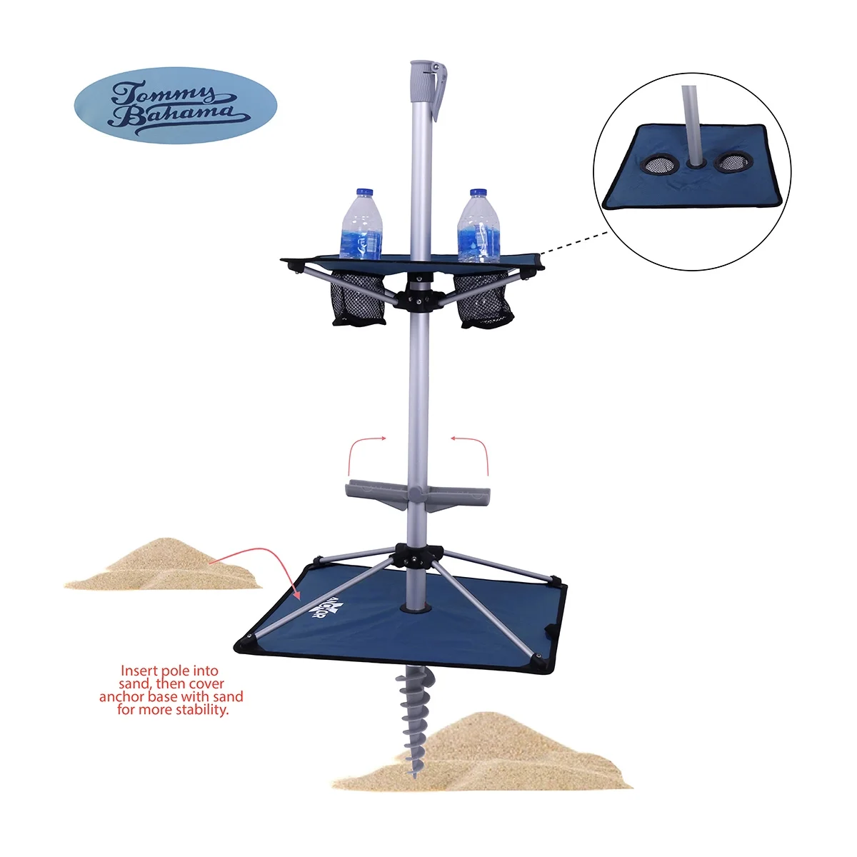 - INTEGRATED SIDE TABLE INCLUDED: Non-corroding 32 mm diameter bottom pole and 29mm dia top pole, two-piece aluminum pole (rust resistant) ; The pole is telescopic type for height adjustment upto 13 inches. INTEGRATED / FOLDING Umbrella Base with cross bar mounted on 8.5 inch Built-in Strong Plastic Sand Anchor on Bottom Pole to secure the umbrella and more stability in windy conditions.