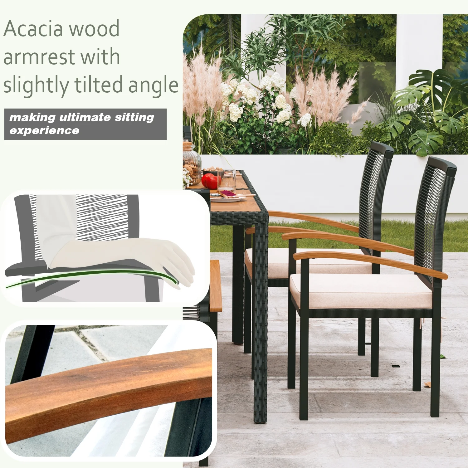 - ????��Acacia Wood Table Top�� The treated acacia wood table top of patio dining sets has strong anti-corrosion ability and is not easy to crack and deform. Due to the high quality wood, our backyard furniture has a smooth and textured surface. Outdoor furniture set with 35*35inch table not only provides enough space to place food but also provides appropriate conversation distancing.