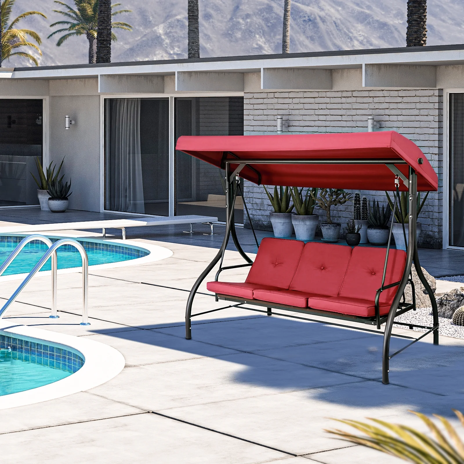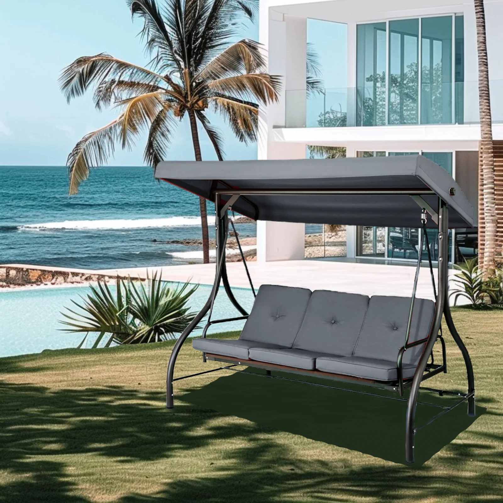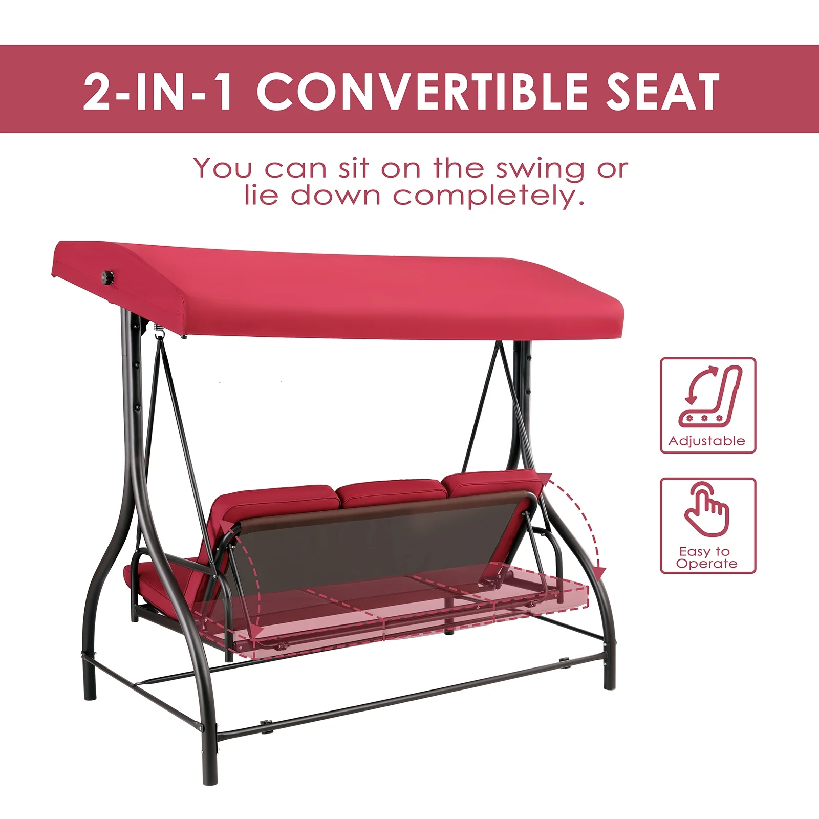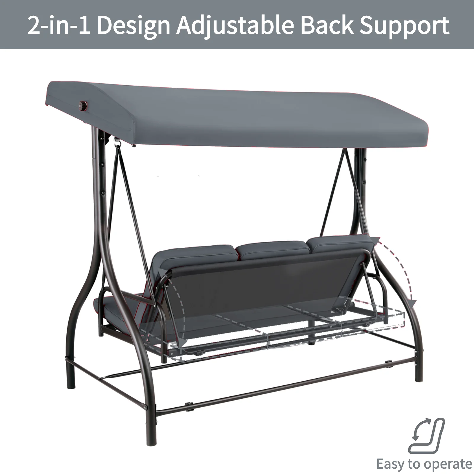 - 2-in-1 Convertible Design: Arlopu Patio Swing��s backrest has a 2-in-1 design. Pull tabs to lower and lock it flat for flexible seating/lounging.