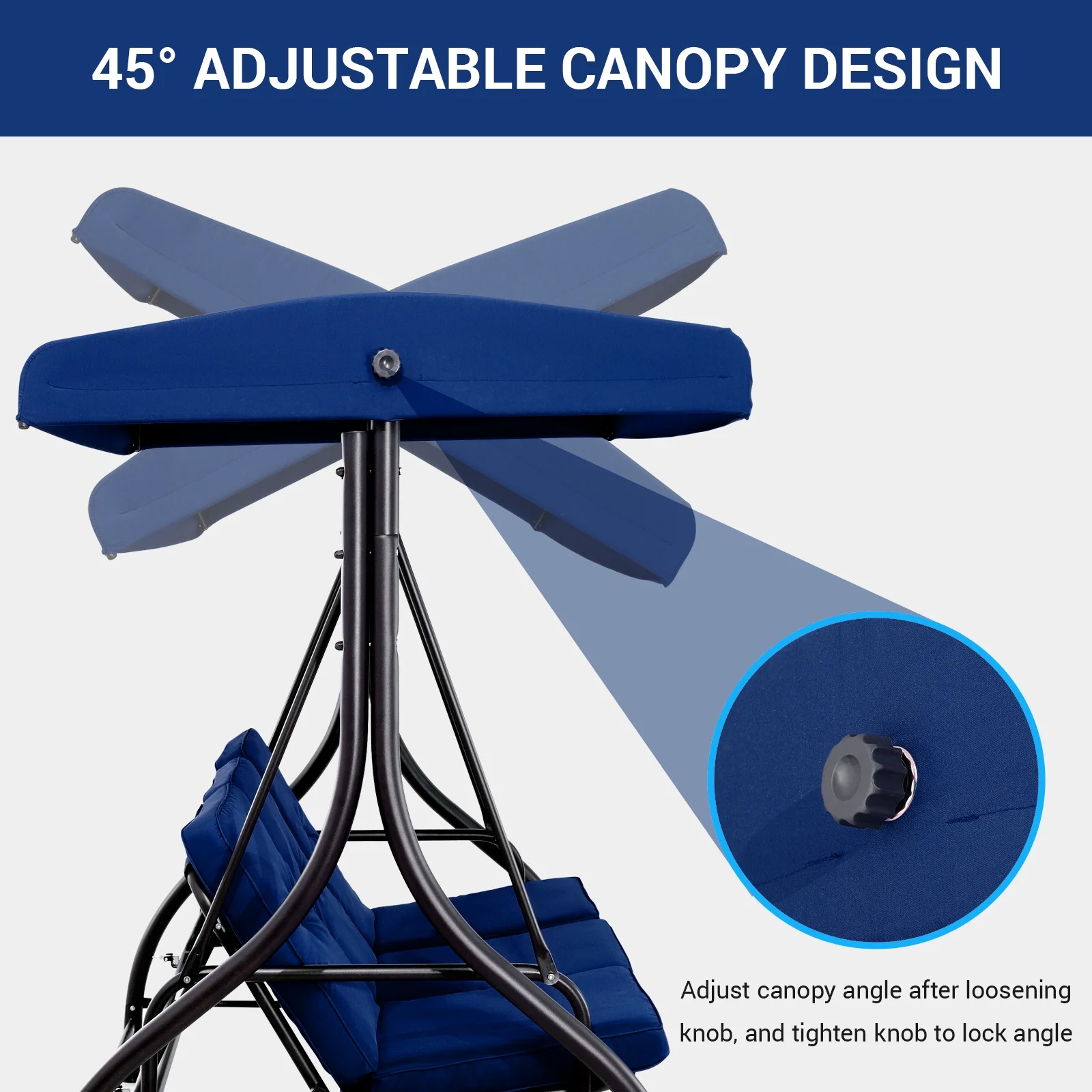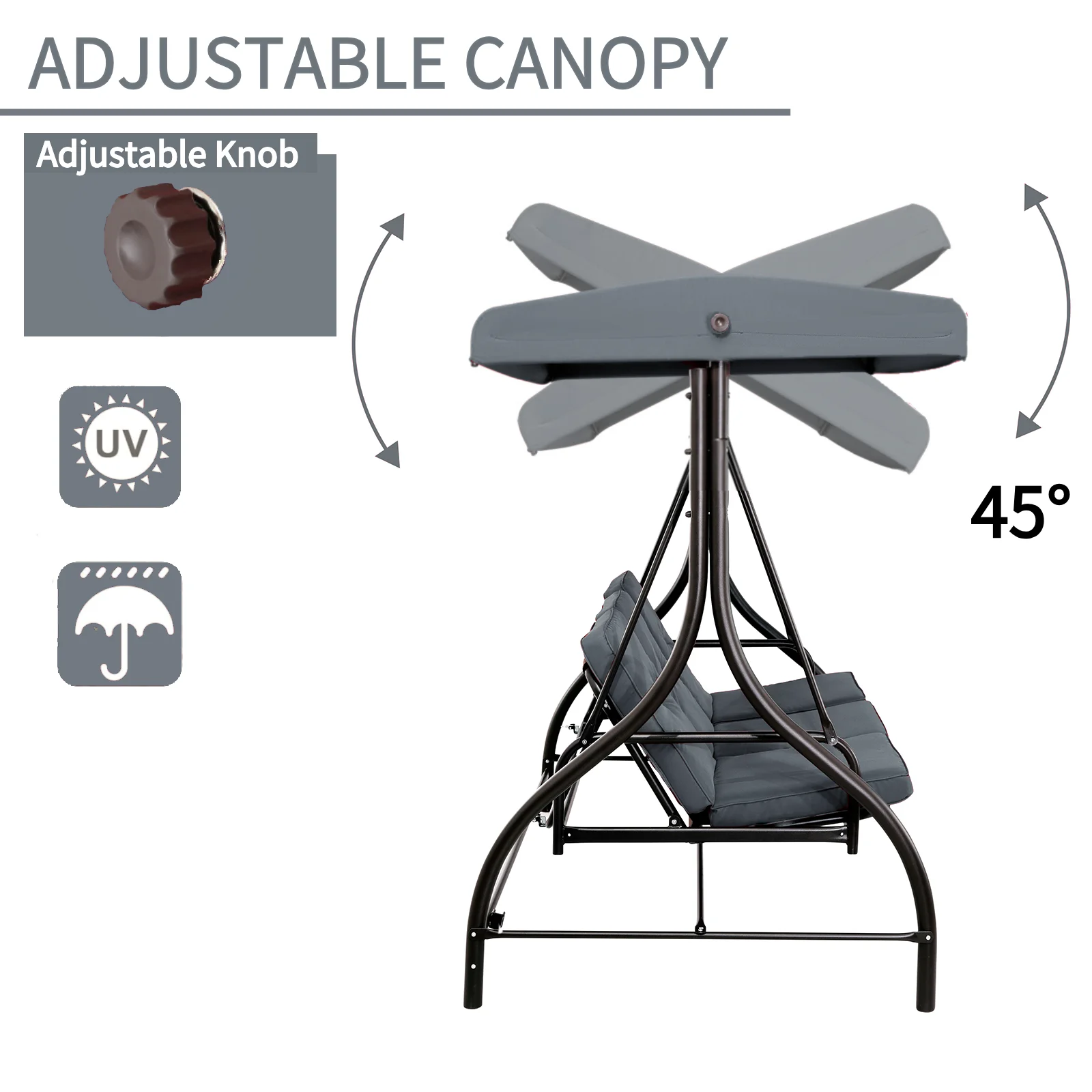 - 45�� Adjustable Canopy: Loosen/tighten the knob to angle the high-quality polyester canopy. Blocks sunlight for a cool, shaded area.