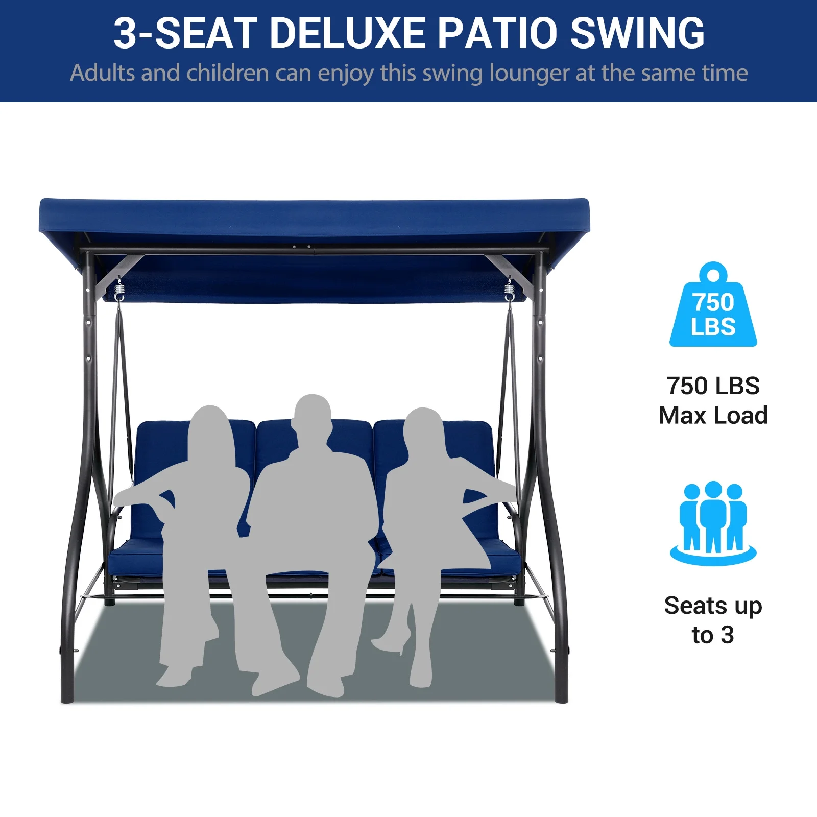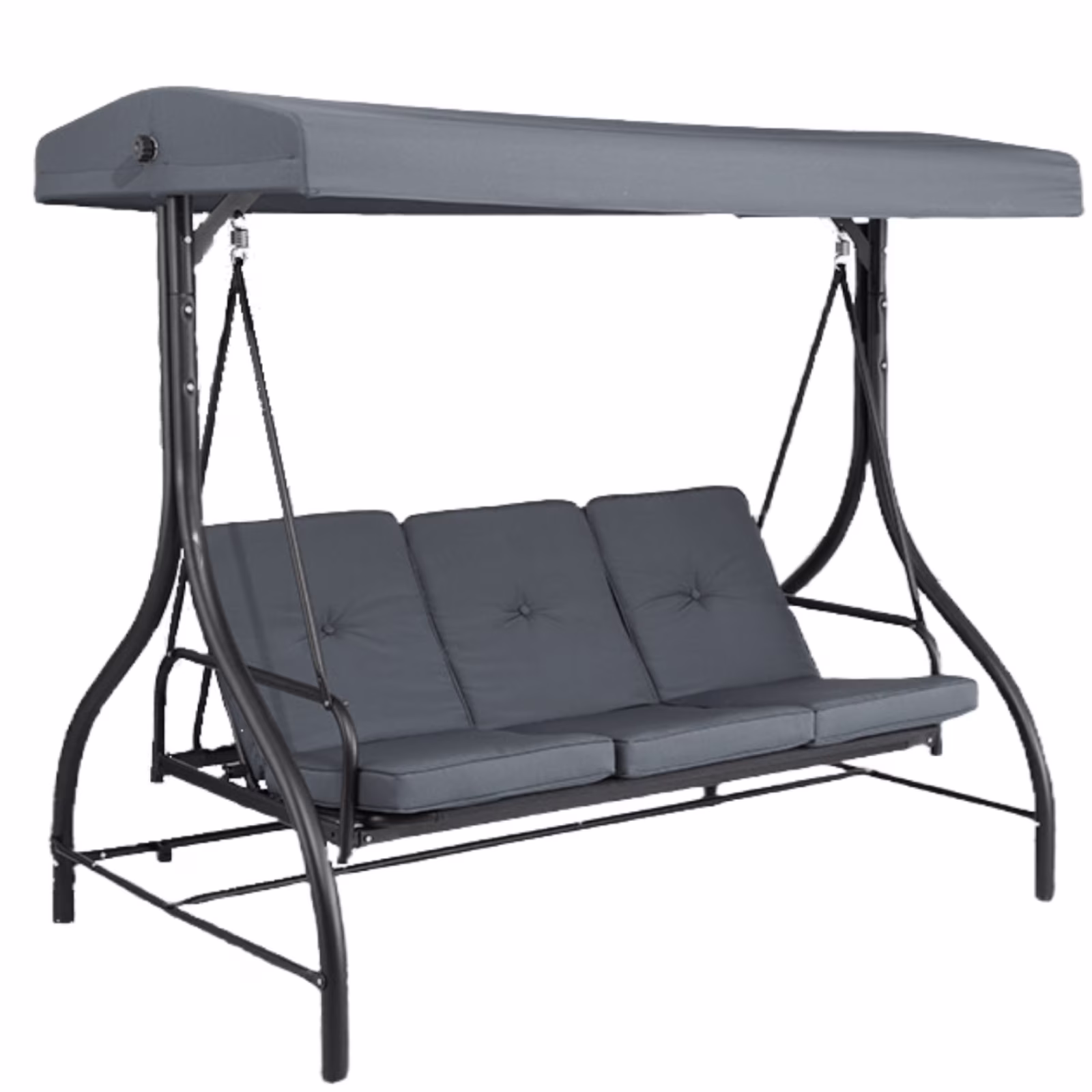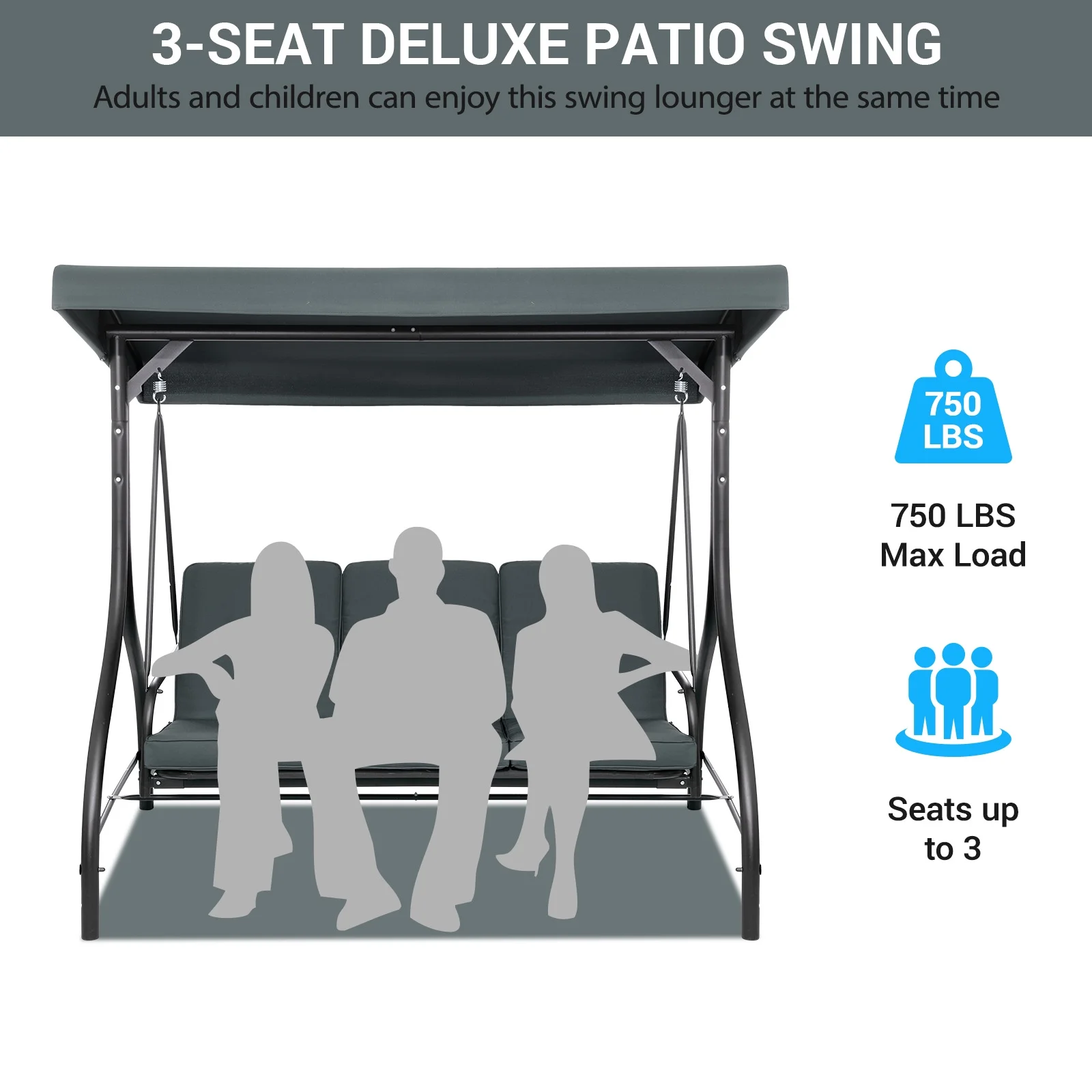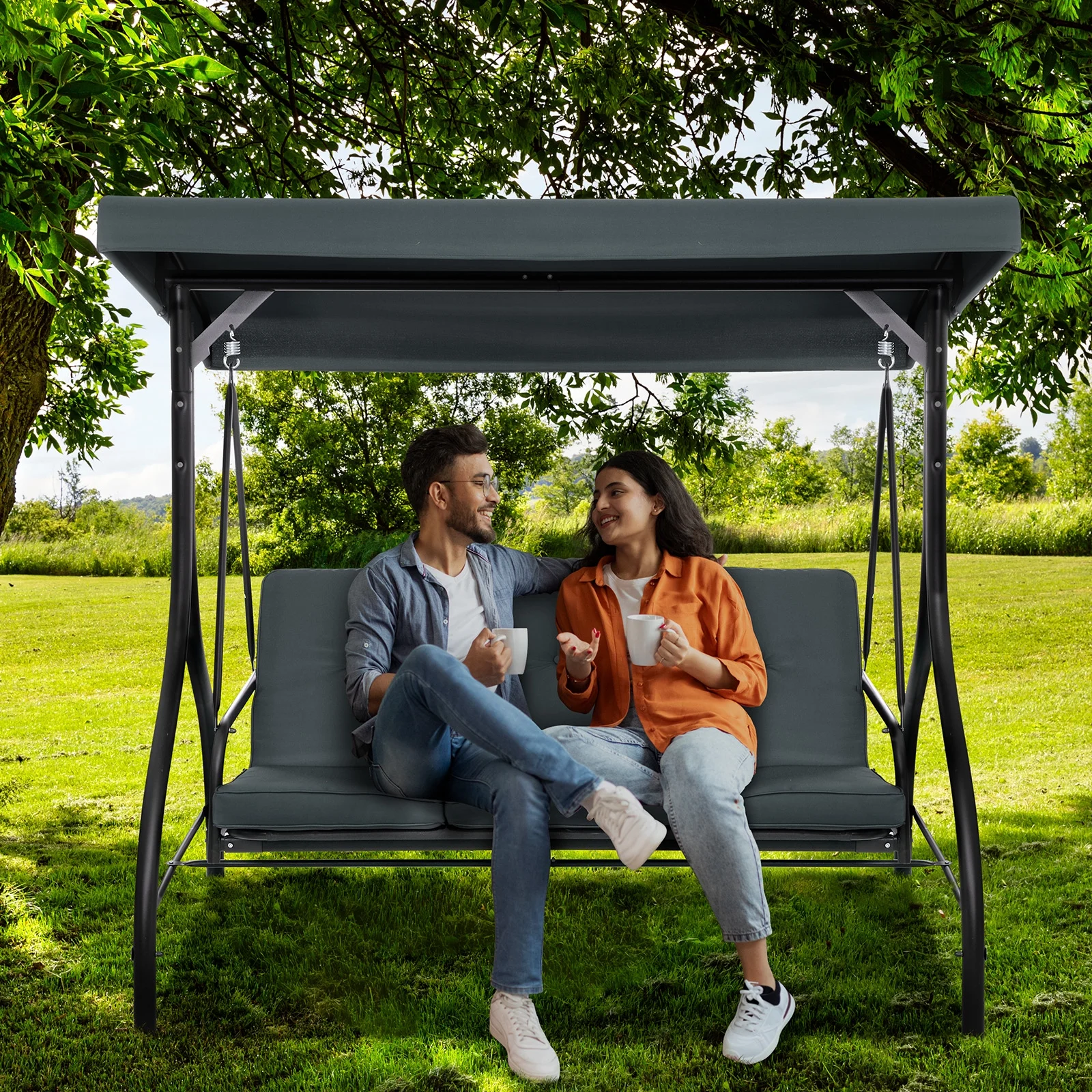 Arlopu 3-Person Porch Swing Chair with Canopy lets you enjoy nice weather with family and friends. Its curved seat and side armrests offer comfort. Relax in the shade, have a drink, and let the breeze soothe you. Ideal for gardens, backyards, porches, decks and more outdoor spots.