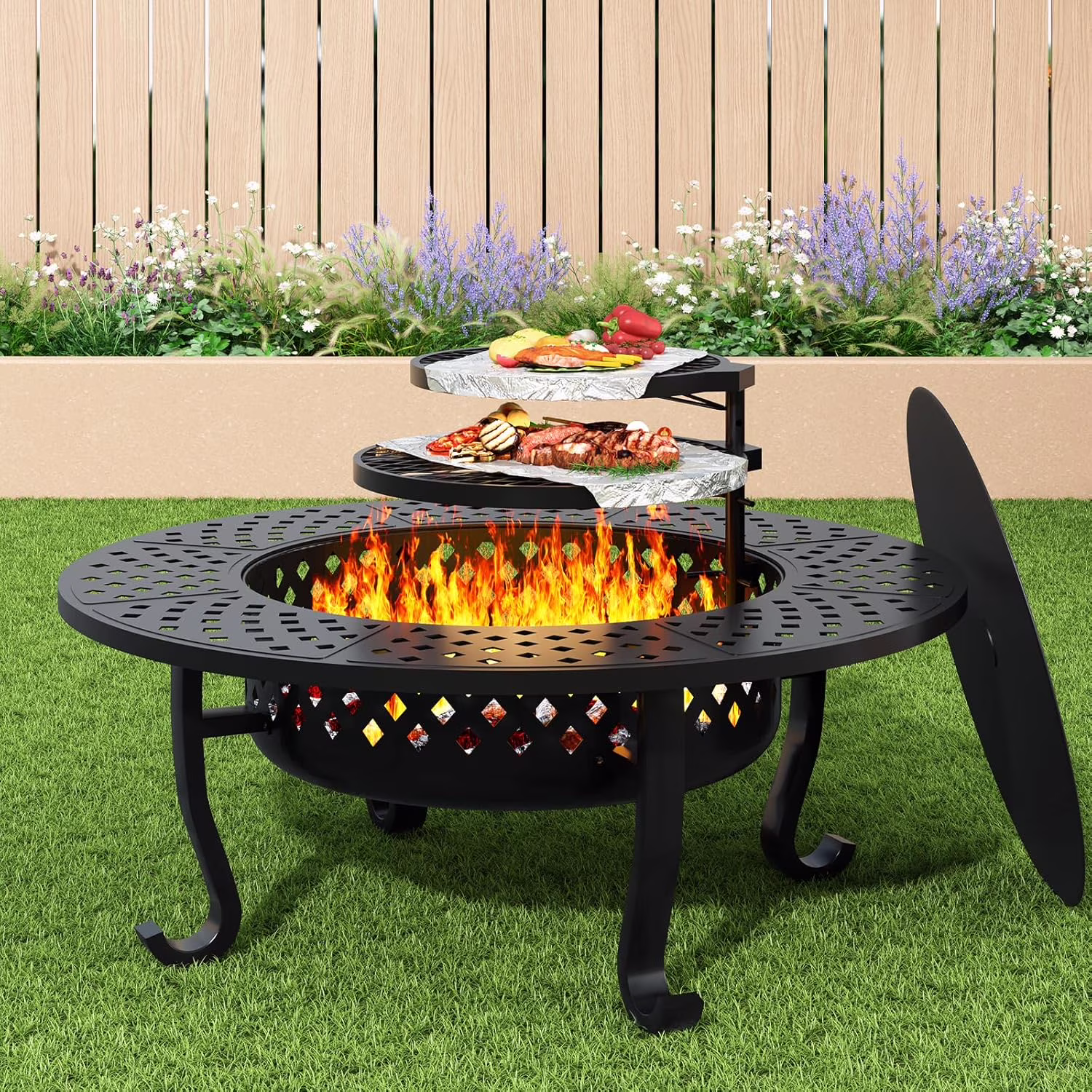 - With lid covered, fire pit will become a round metal table which is ideal for 6-8 people sit around to have leisure time on balcony, patio garden.