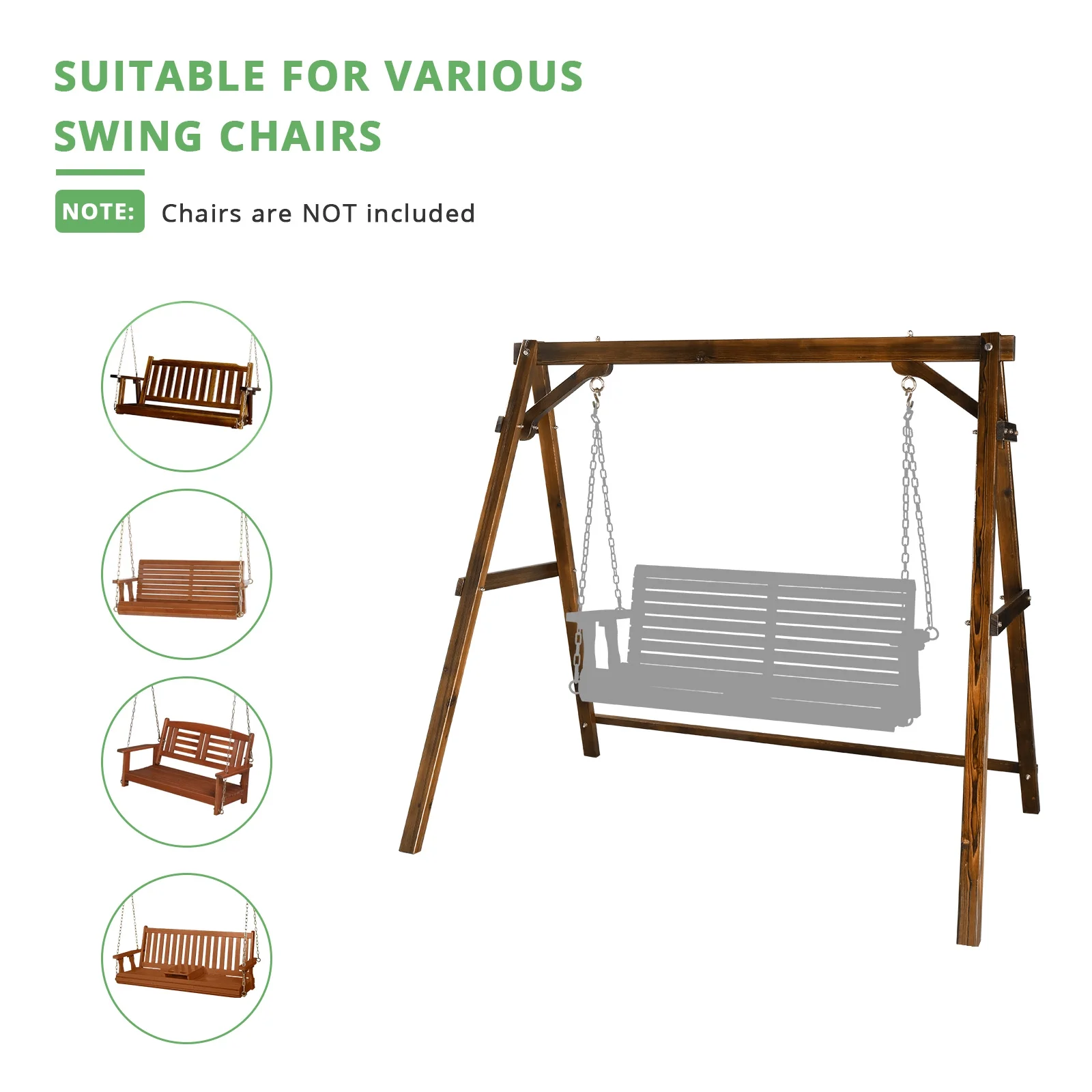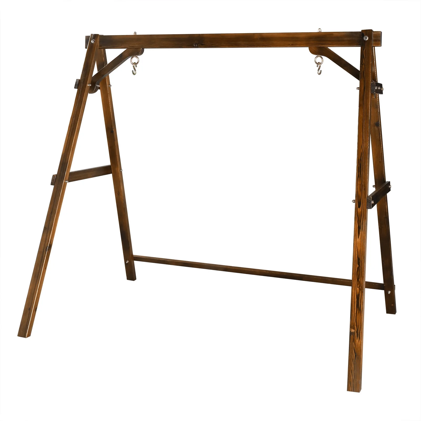 Here is our 188*135*170cm Swing Stand Wooden Porch Swing Frame A-Frame Carbonized 600lbs For 4ft Swing Chair. Our sturdy swing frame is the perfect companion to our Swing. What are you hesitating about? Buy it!
