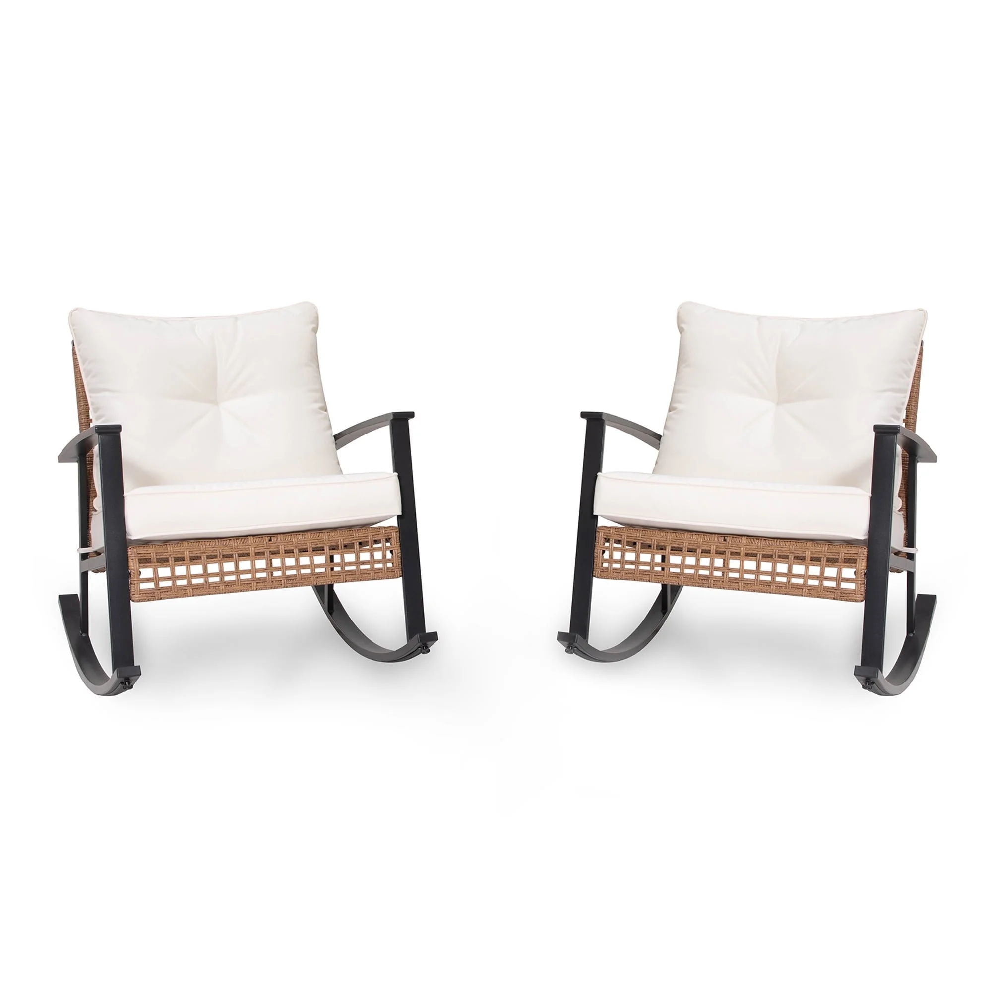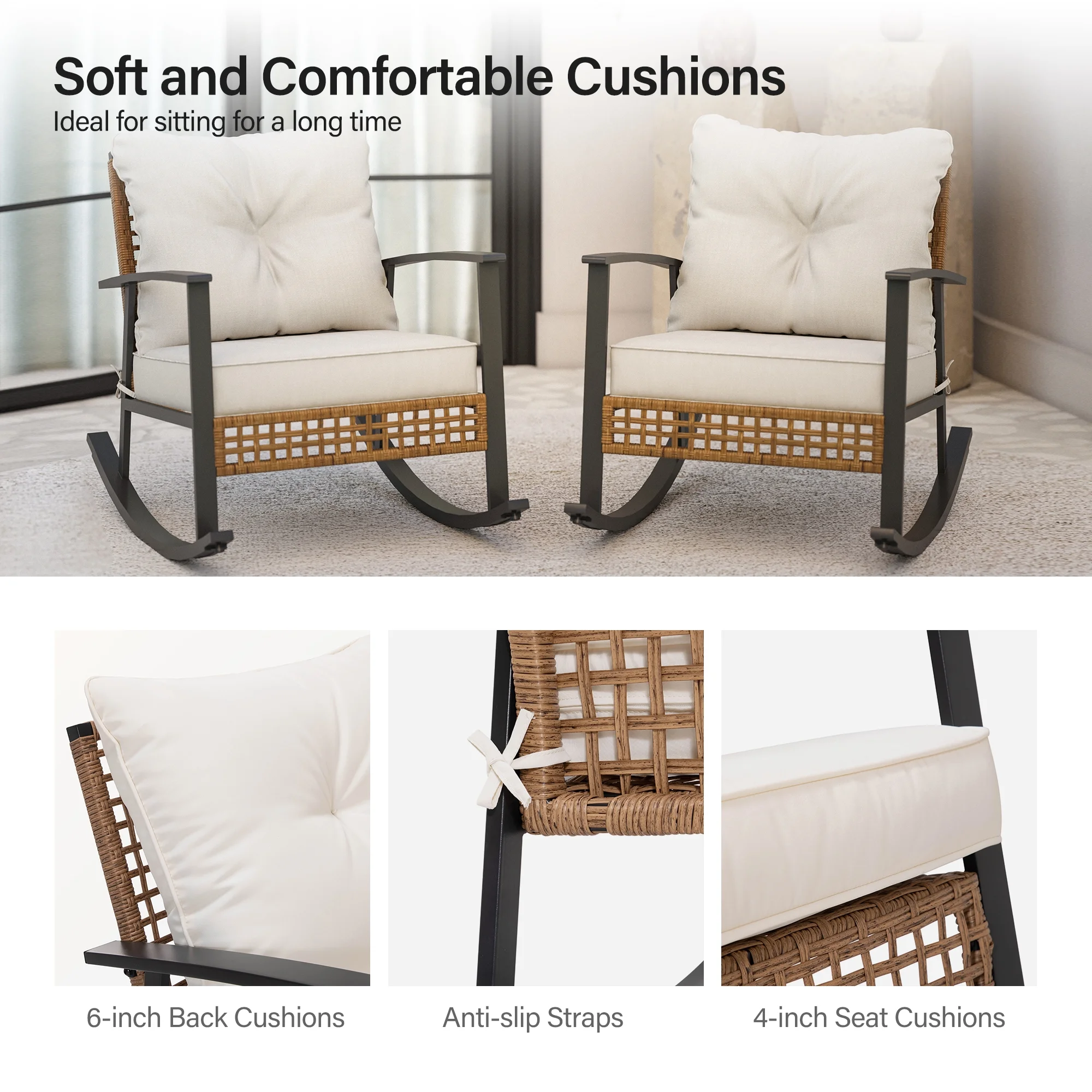 - The seat and back cushions of this outdoor rocking chair have been upgraded to 4 inches and 6 inches in thickness for superior comfort. Their water-resistant and fade-resistant polyester cushion covers ensure durability and easy maintenance.