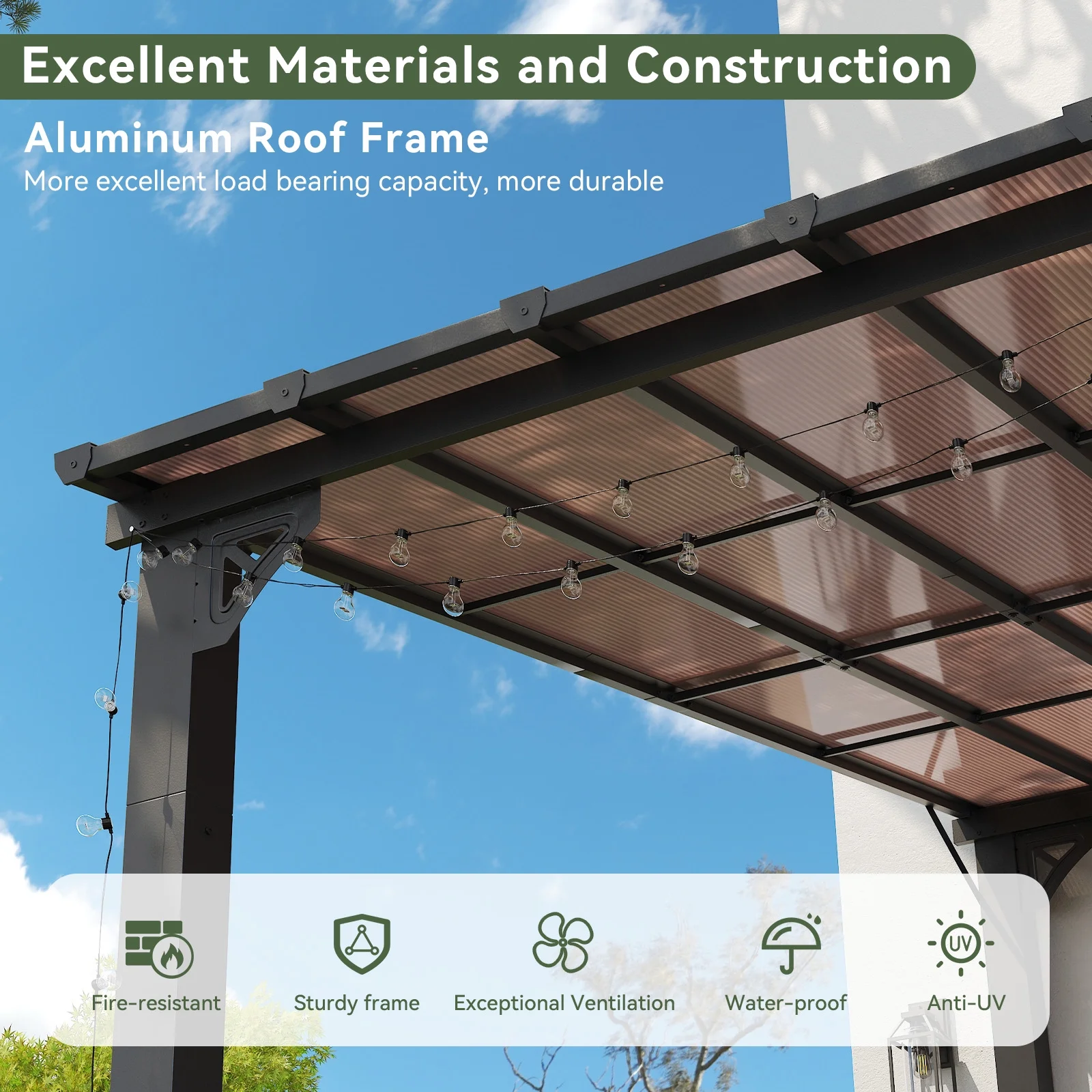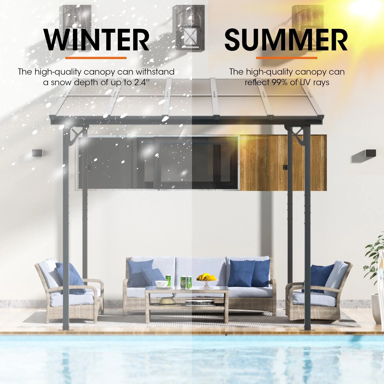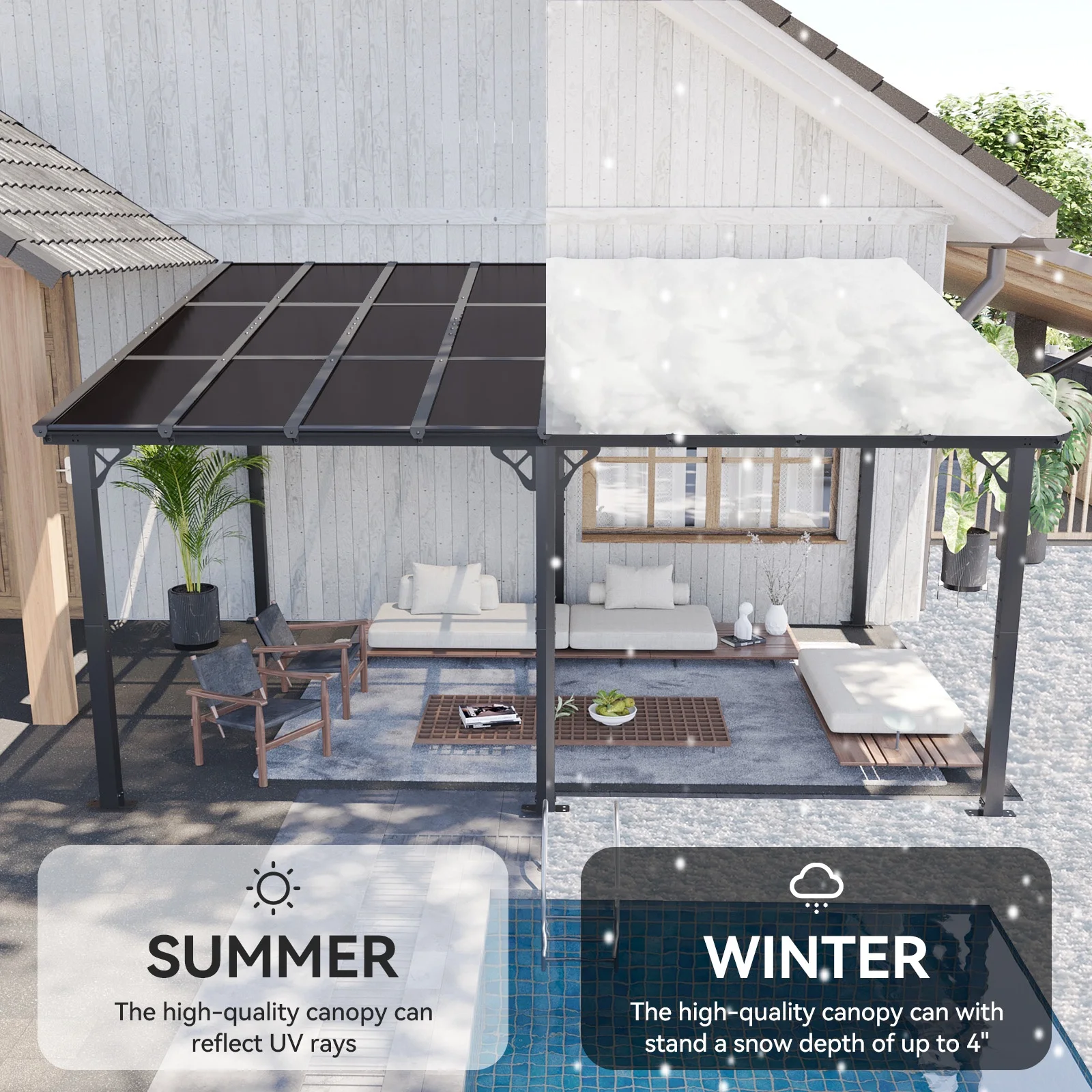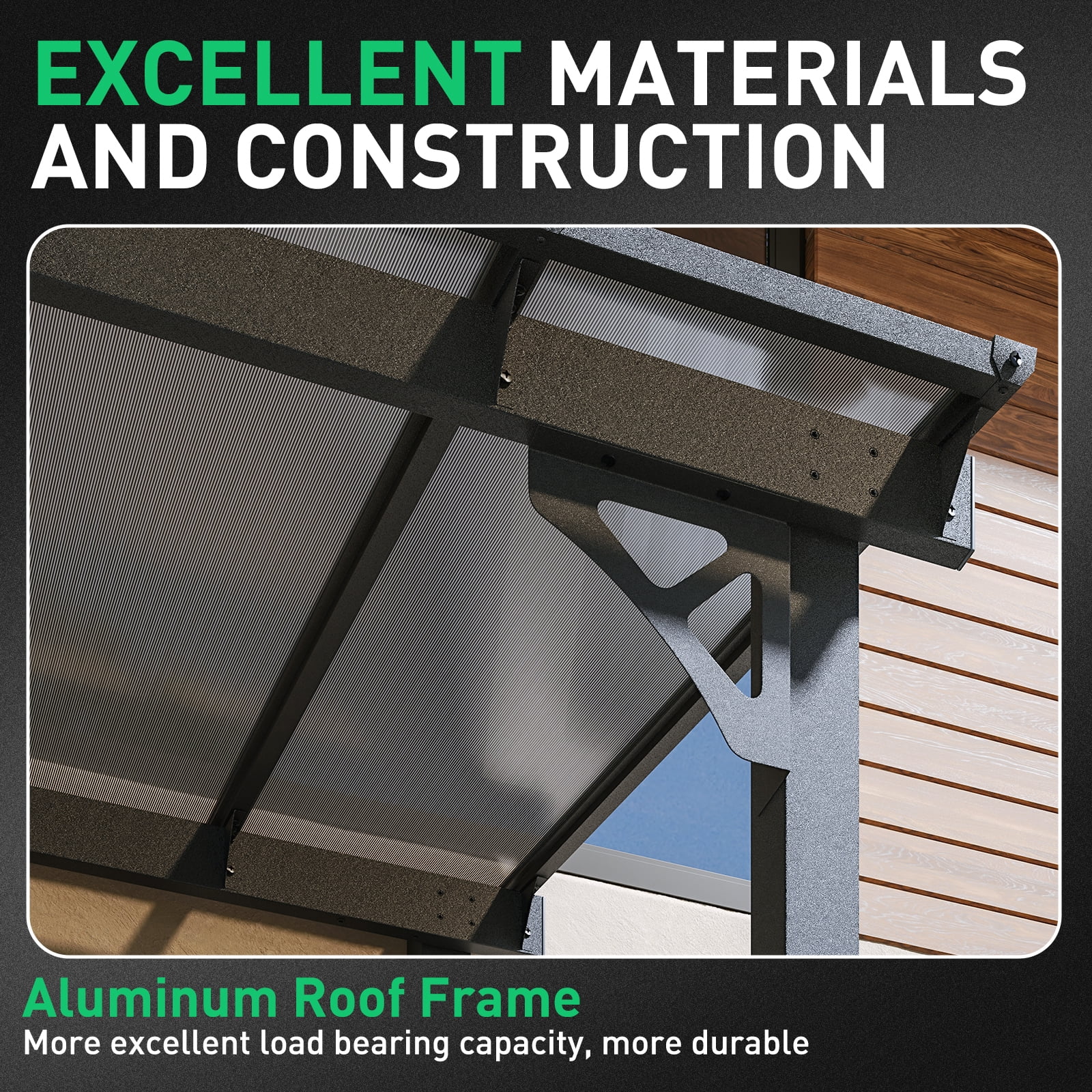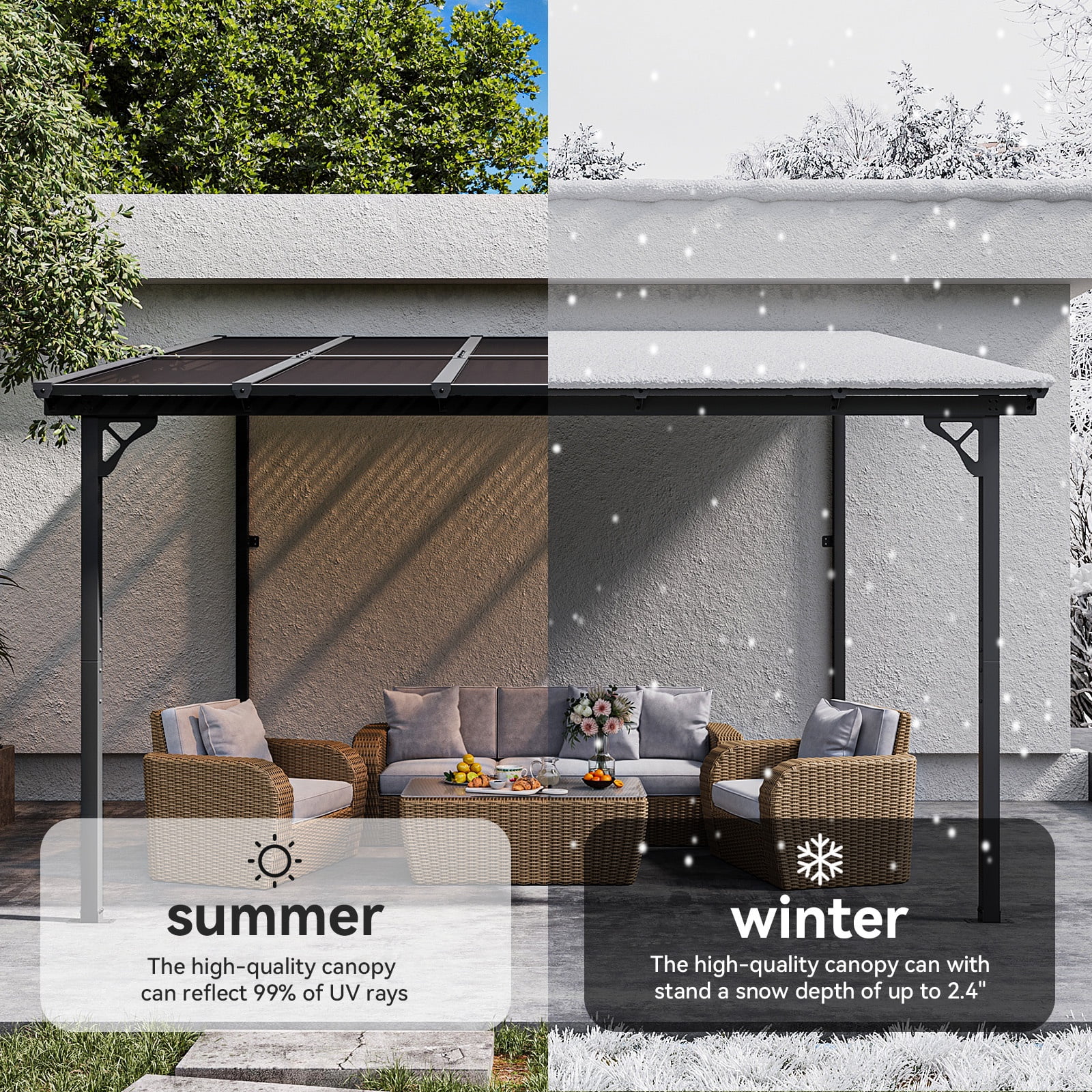 - Premium Material & Excellent Load-bearing:The top of the pergola has a remarkable load bearing of 55 lbs/�O, which is resistant to various complex weather conditions as long as it is wall-mounted with expansion bolts. Besides, the polycarbonate top is able to reflect 99% of UV rays and thus provide UV protection