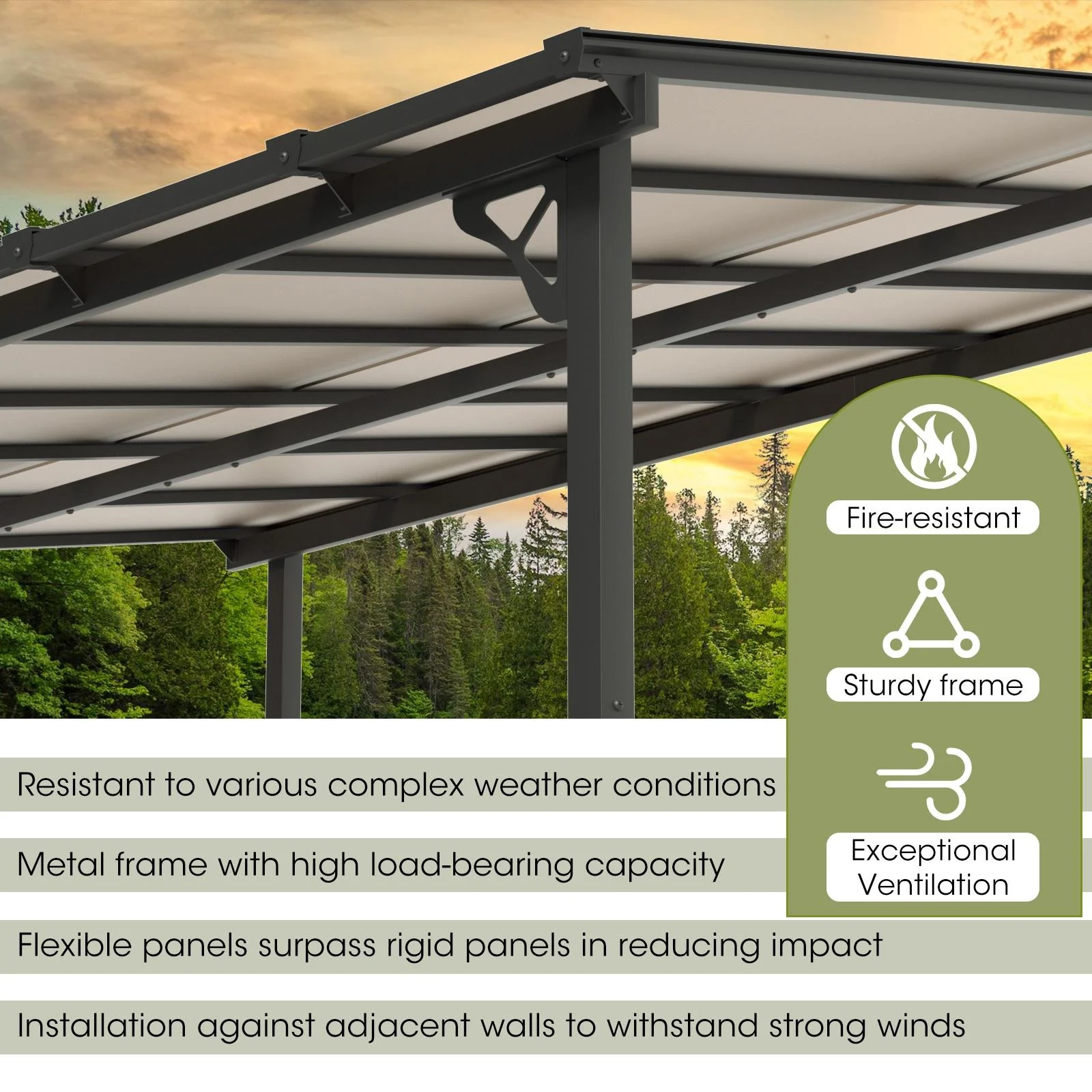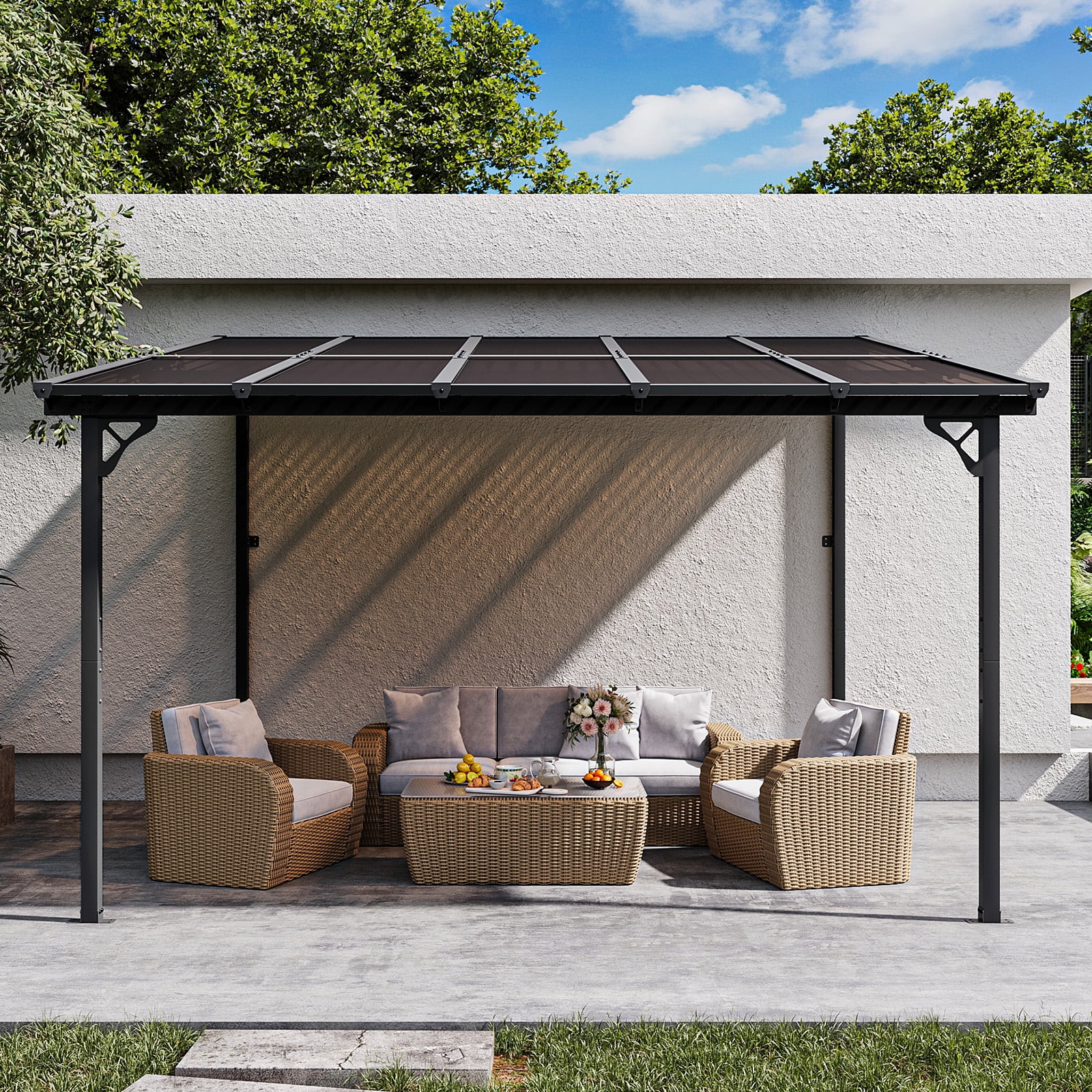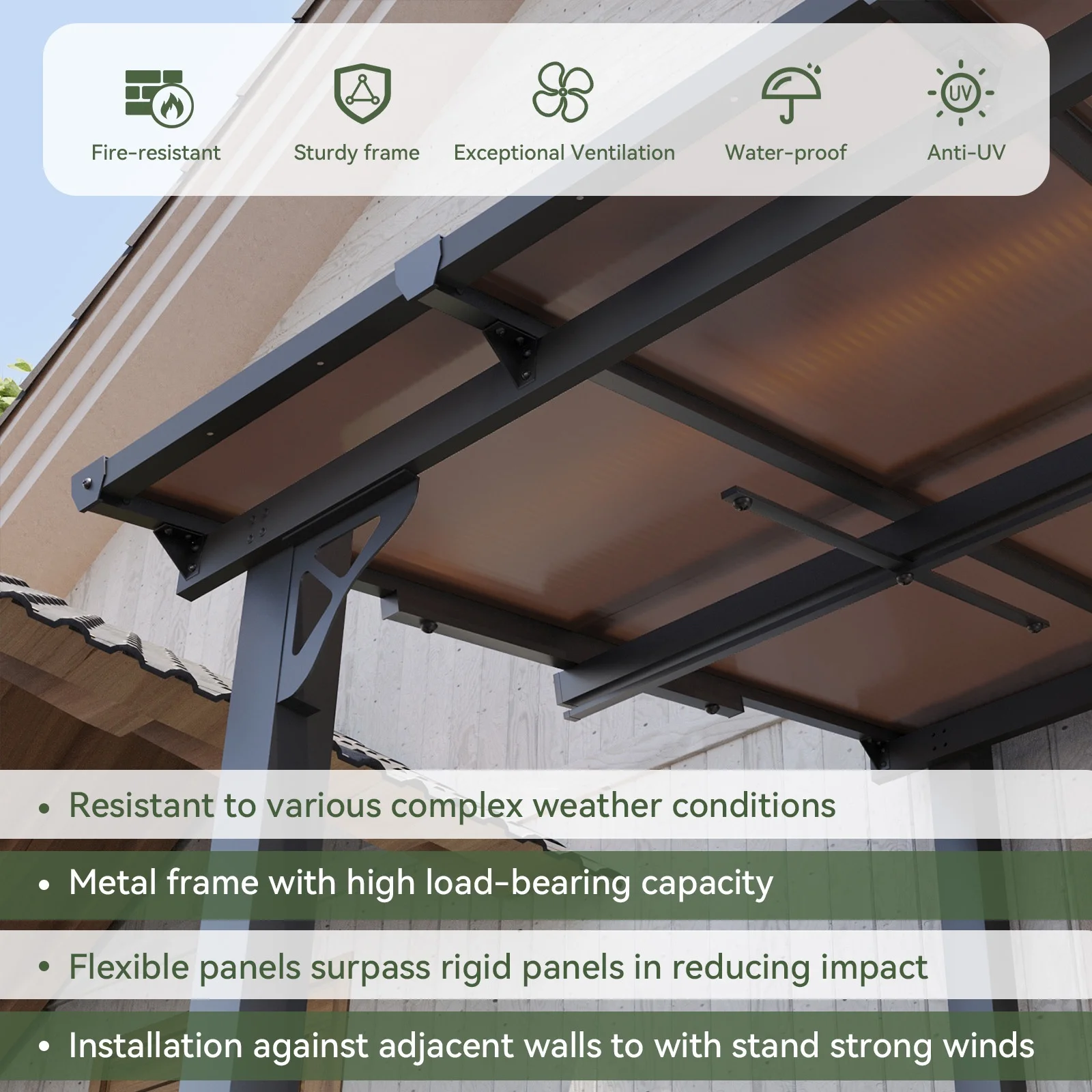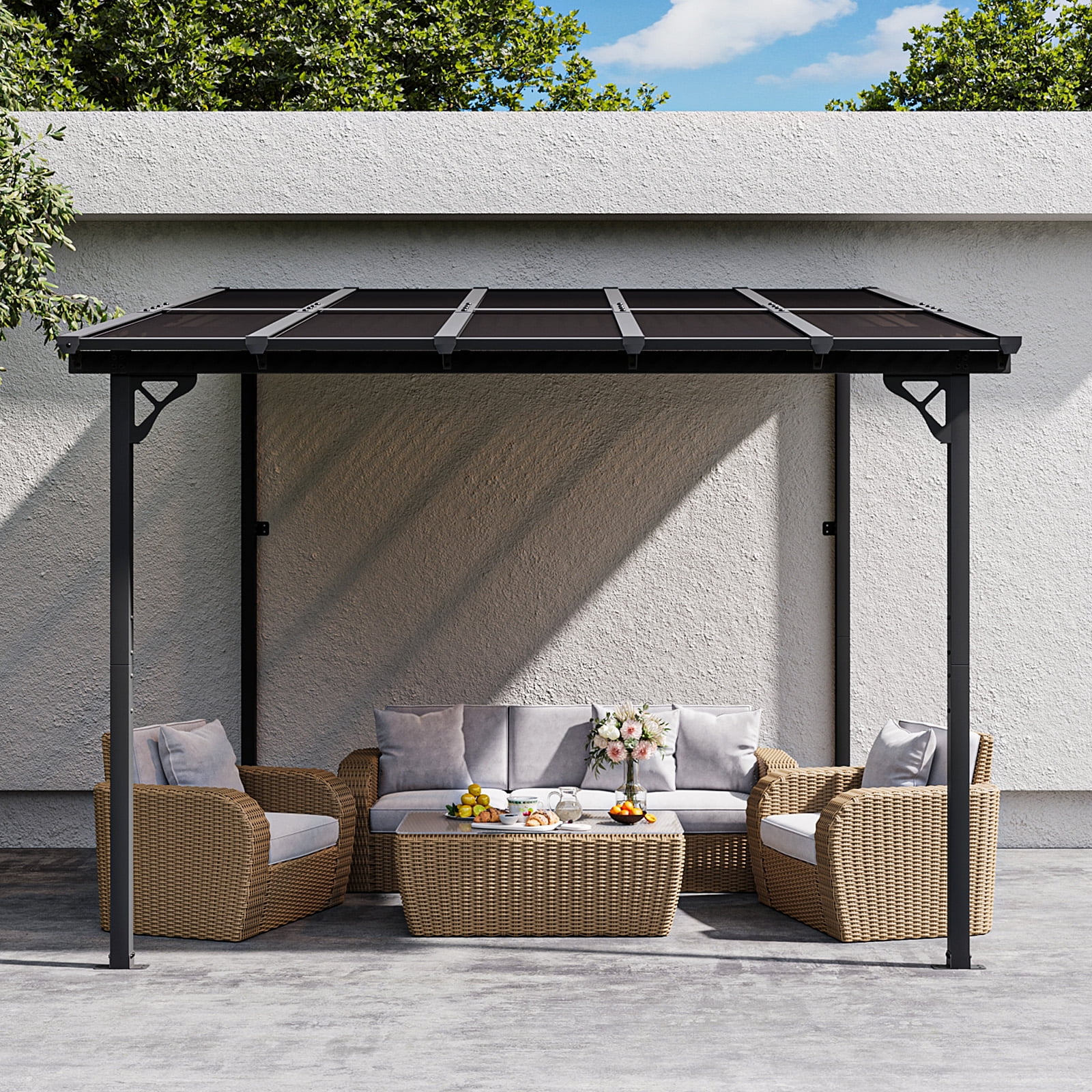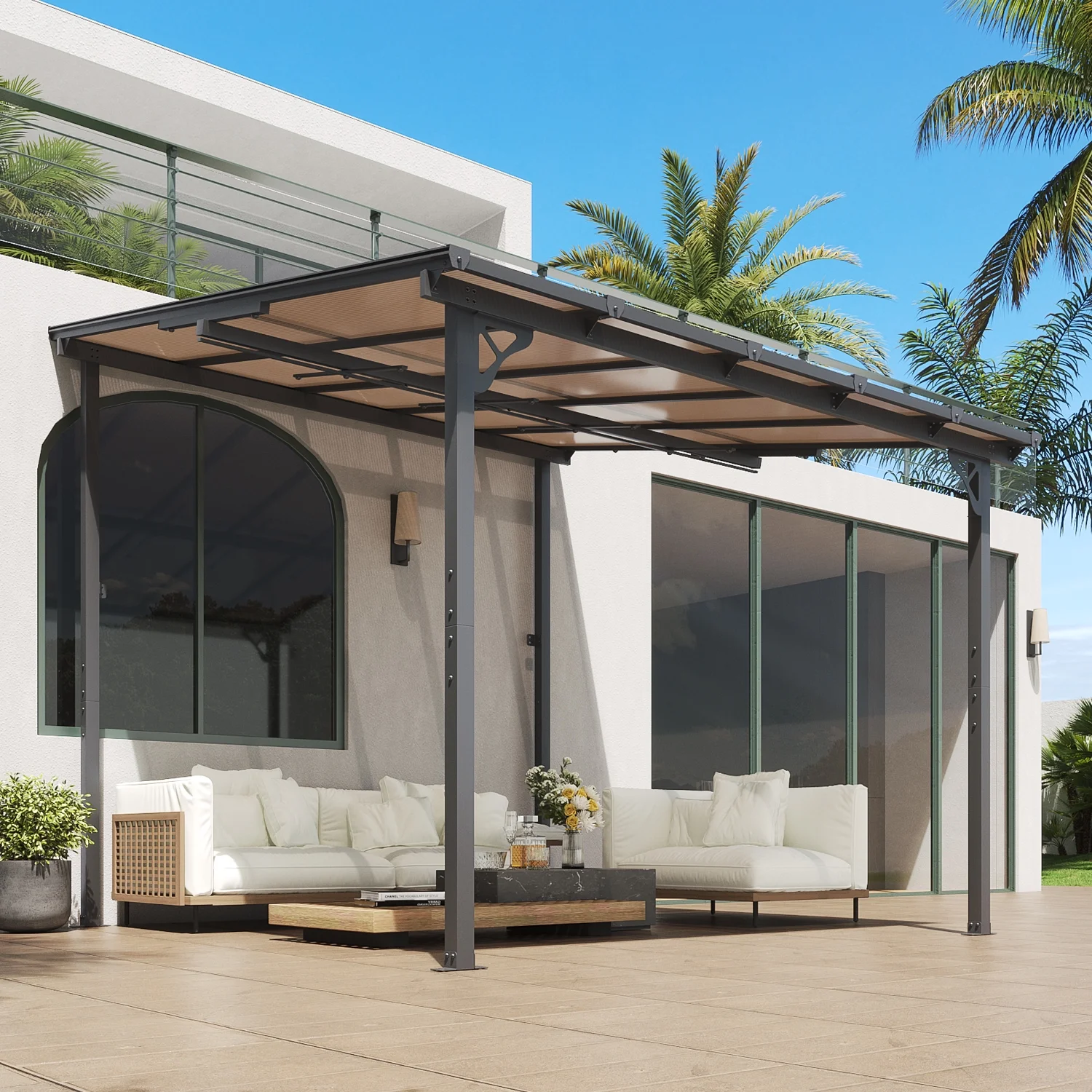 - Premium Material & Excellent Load-bearing:The top of the pergola has a remarkable load bearing of 55 lbs/�O, which is resistant to various complex weather conditions as long as it is wall-mounted with expansion bolts. Besides, the polycarbonate top is able to reflect 99% of UV rays and thus provide UV protection