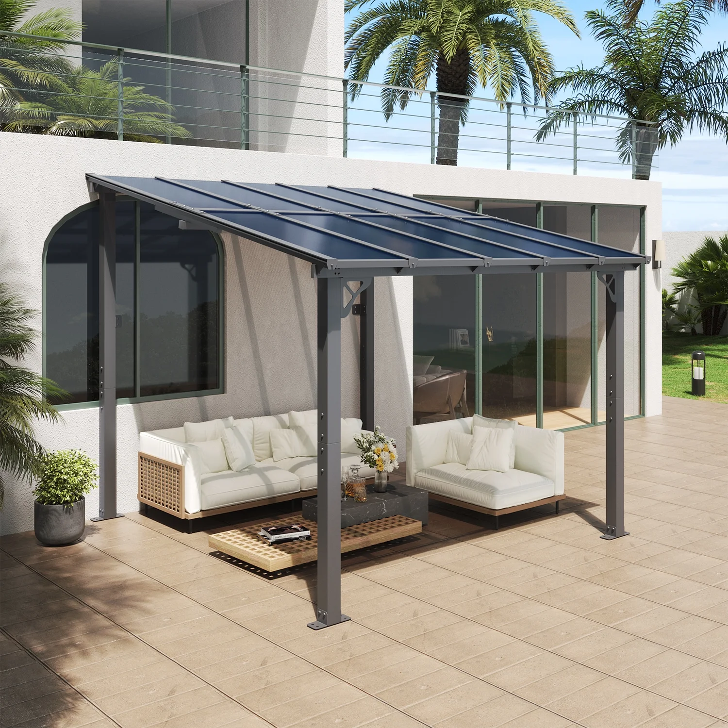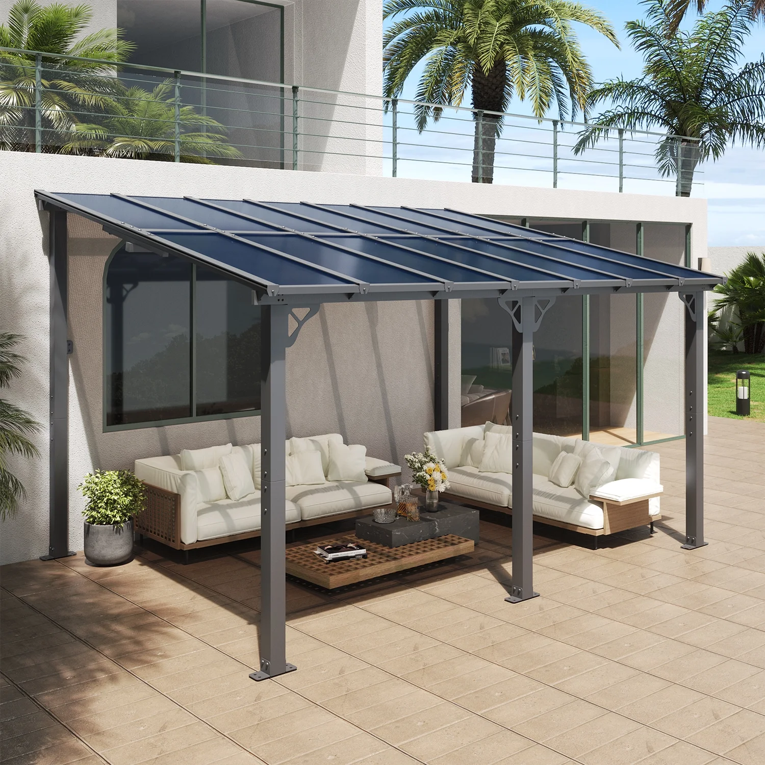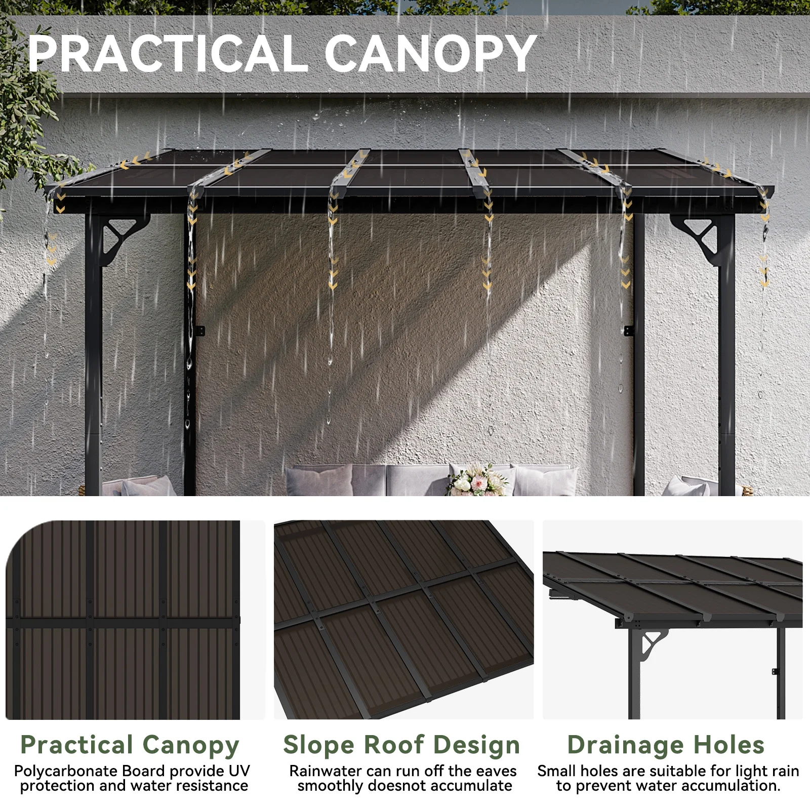 - Sloped Roof and Drainage Holes:Sloped roof design make the rainwater run off the eaves smoothly and easily, reducing the problems of water accumulation. This patio pergola also features drainage holes to help better drain water