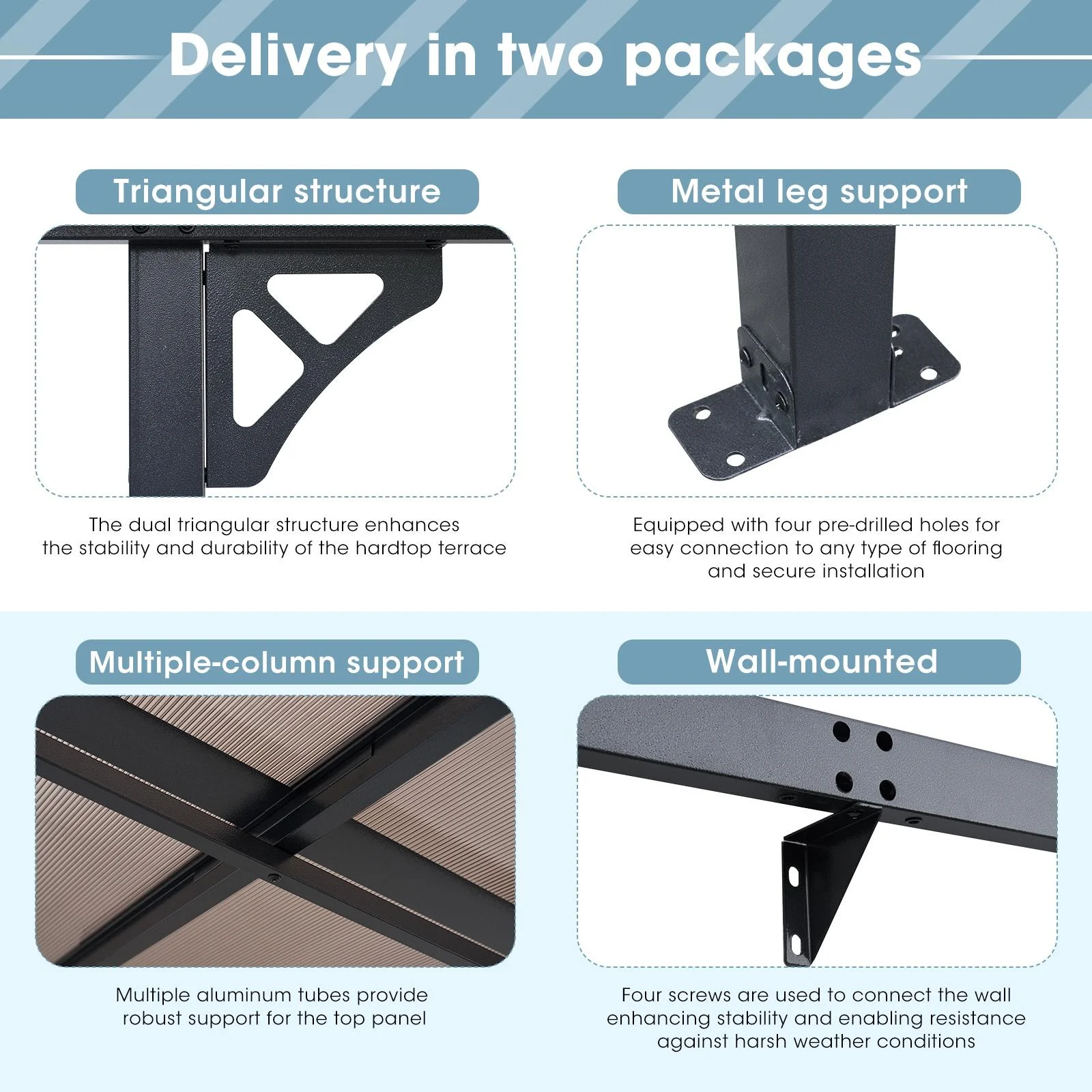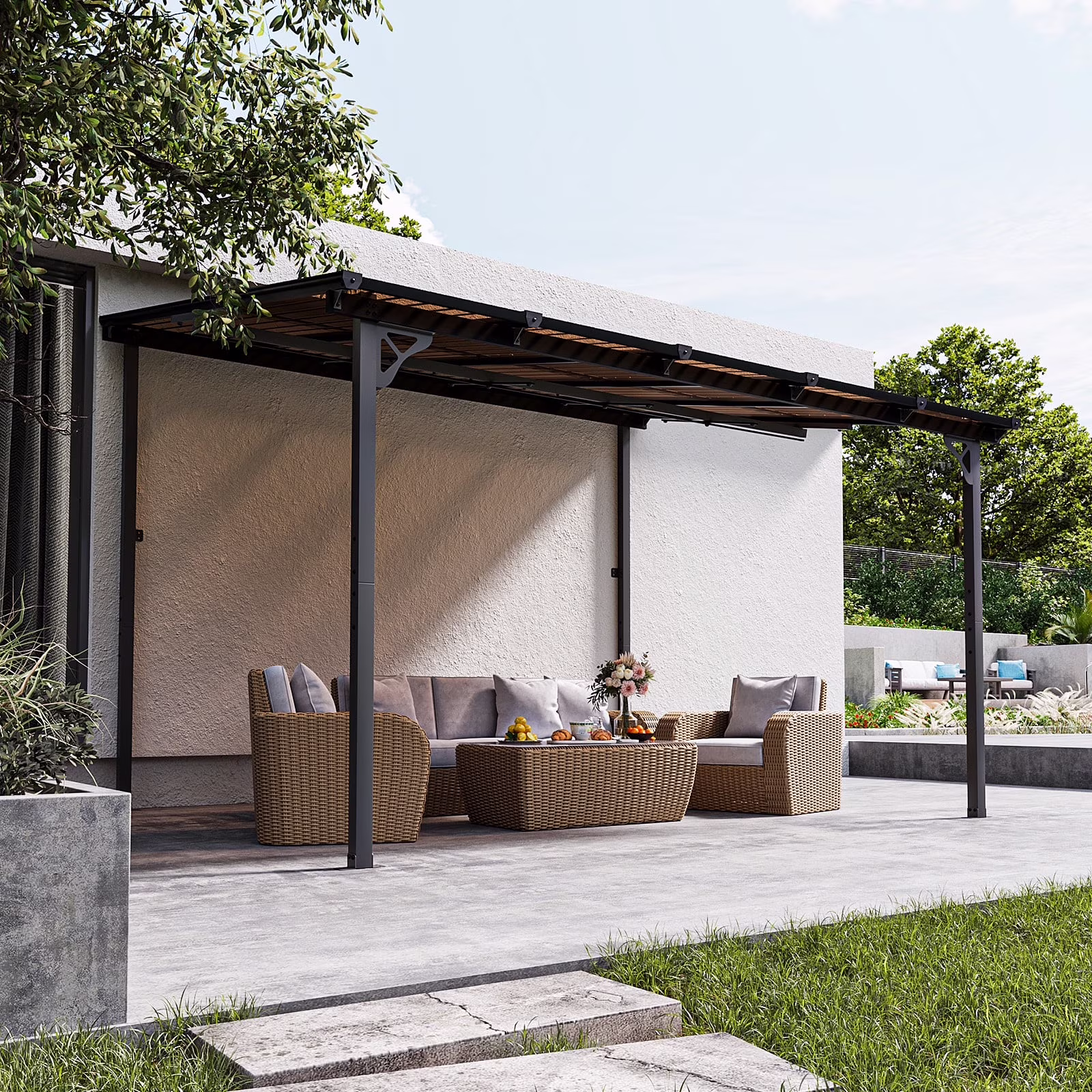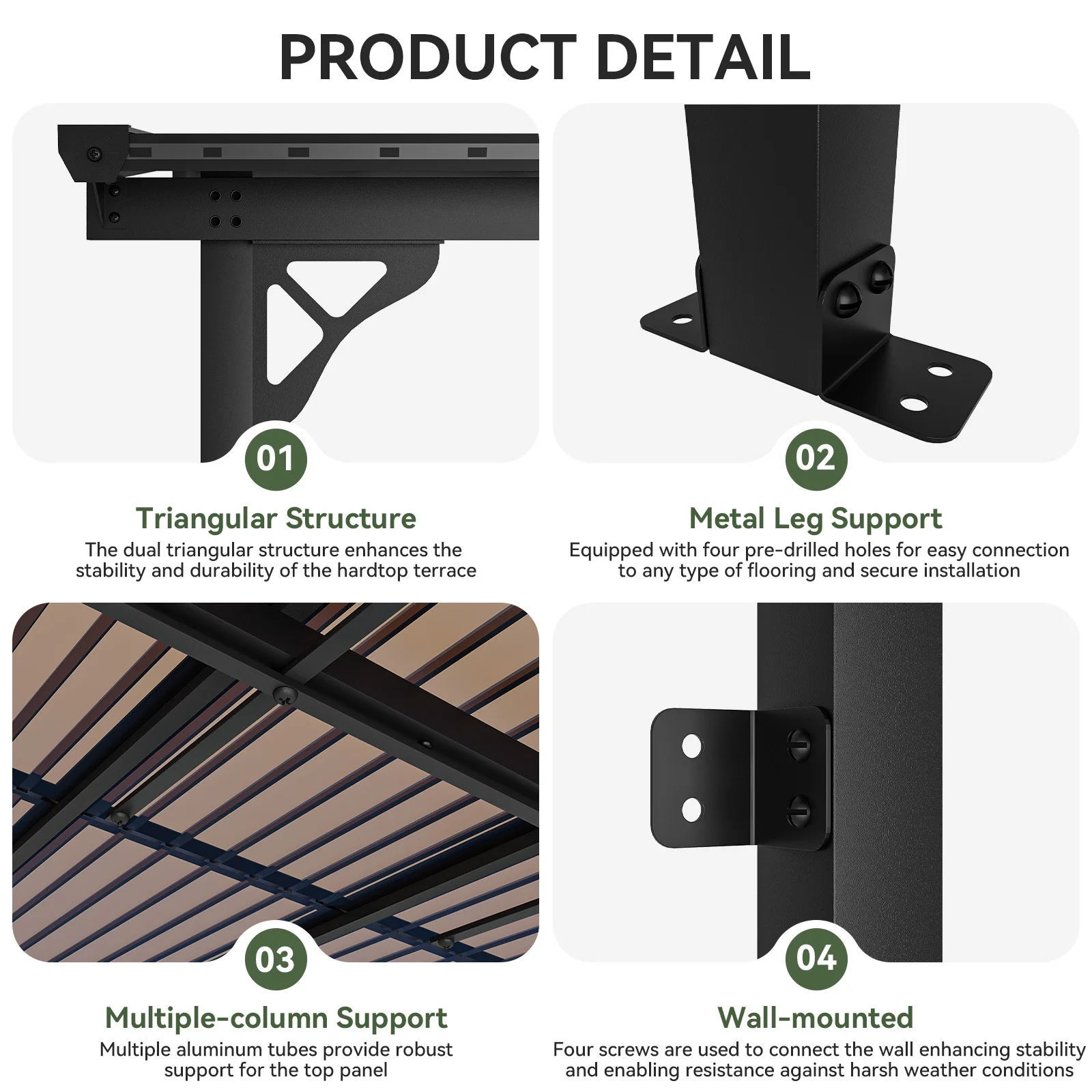 - Stable and Solid:Carbon steel frames and triangle metal structure greatly ensure the durability, stability and sturdiness of our patio pergola. It is designed to provide partial shade and create a defined space in an outdoor area