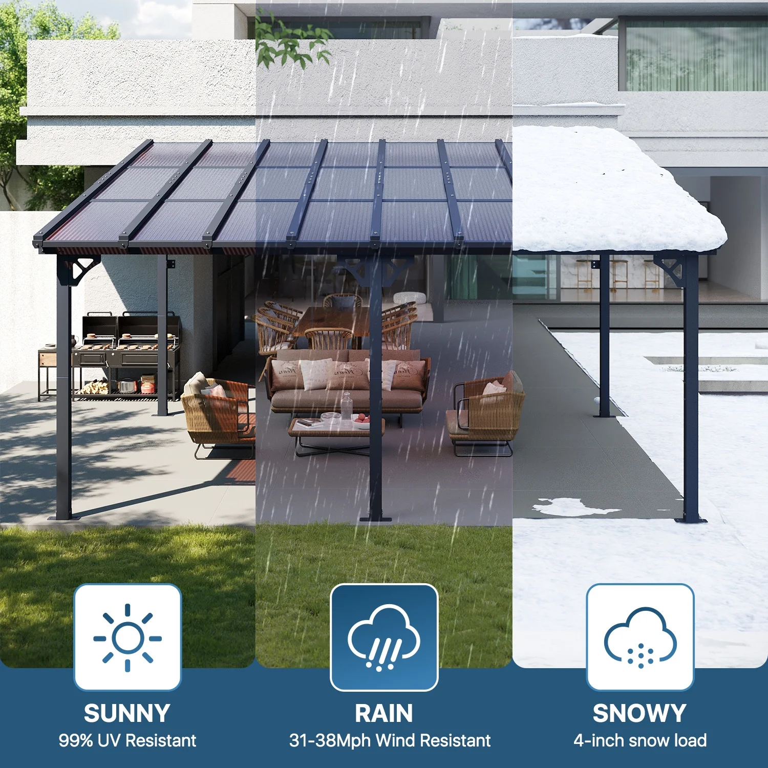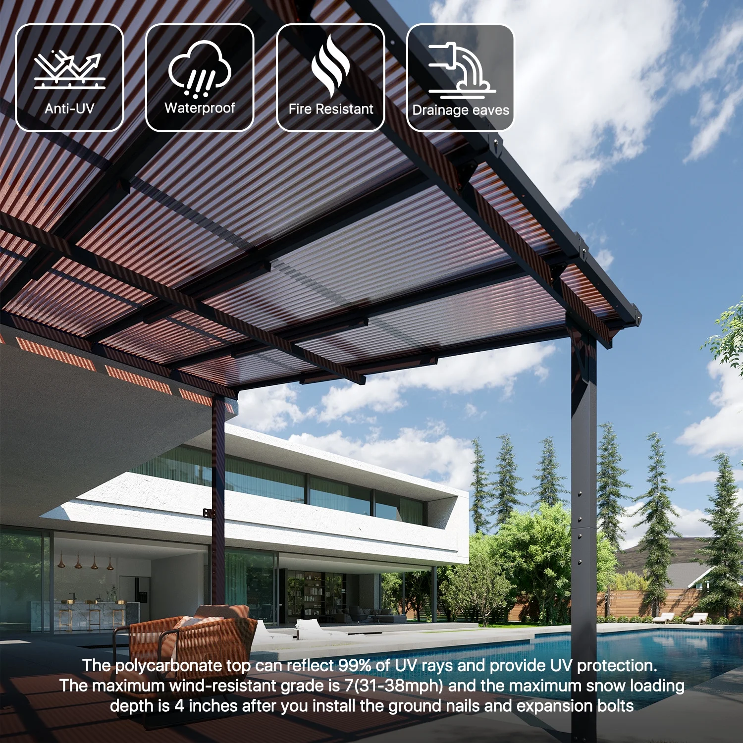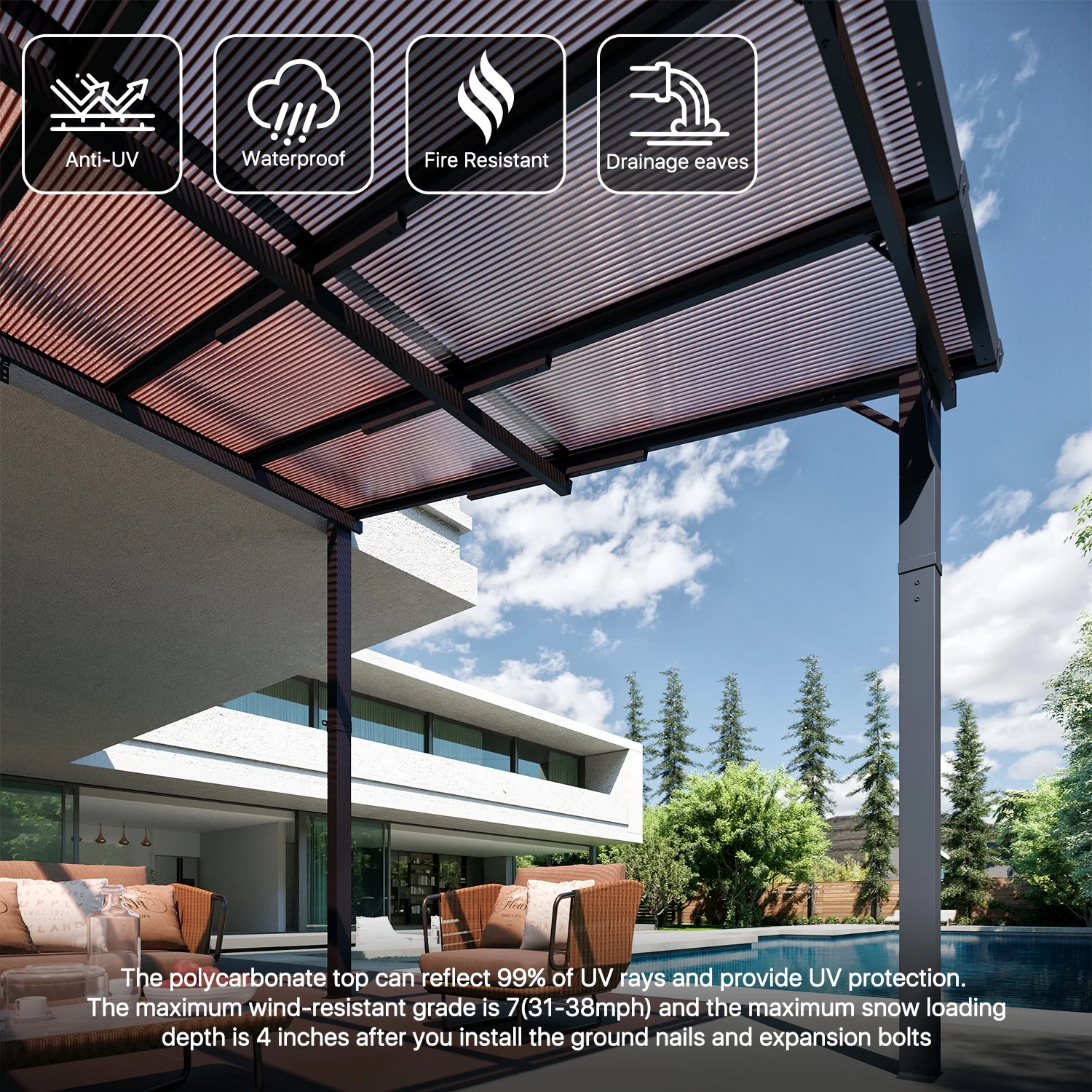 - Built to Last: When securely fastened to the wall and ground with expansion bolts or ground nails, this pergola can offer the maximum wind resistance of 47-55mph and the maximum snow loading depth can up to 4 inches. Besides, its robust design allows it to withstand harsh weather conditions including heavy snow and rain