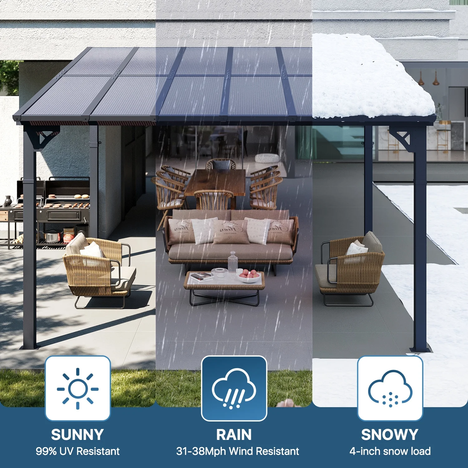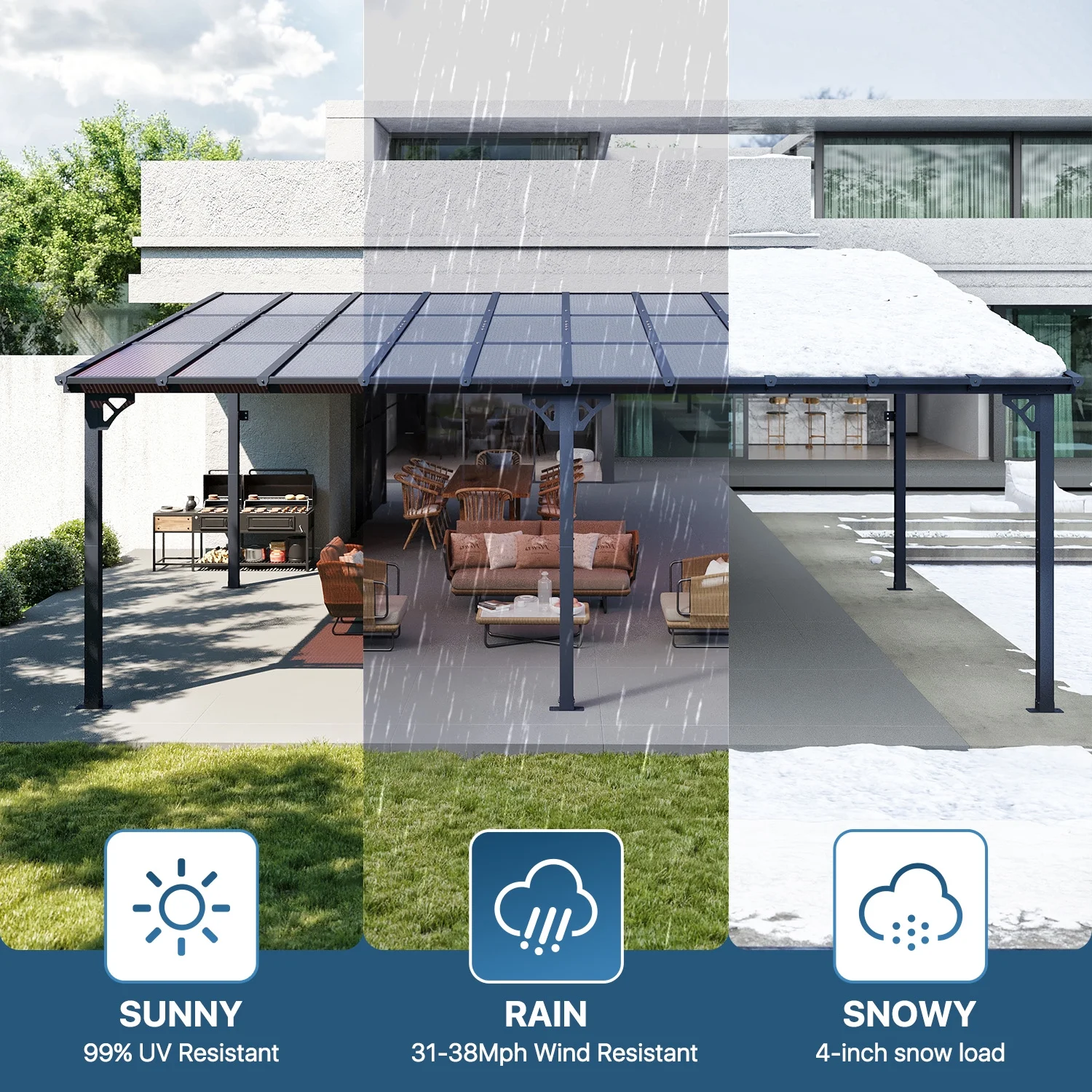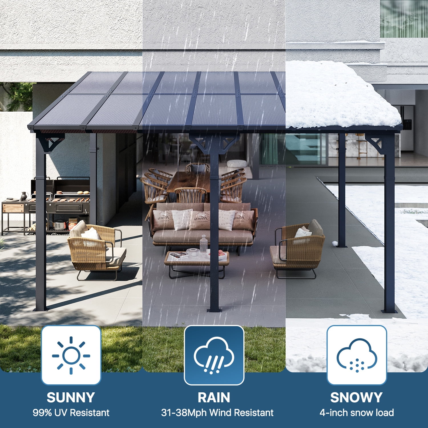 - Built to Last: When securely fastened to the wall and ground with expansion bolts or ground nails, this pergola can offer the maximum wind resistance of 47-55mph and the maximum snow loading depth can up to 4 inches. Besides, its robust design allows it to withstand harsh weather conditions including heavy snow and rain