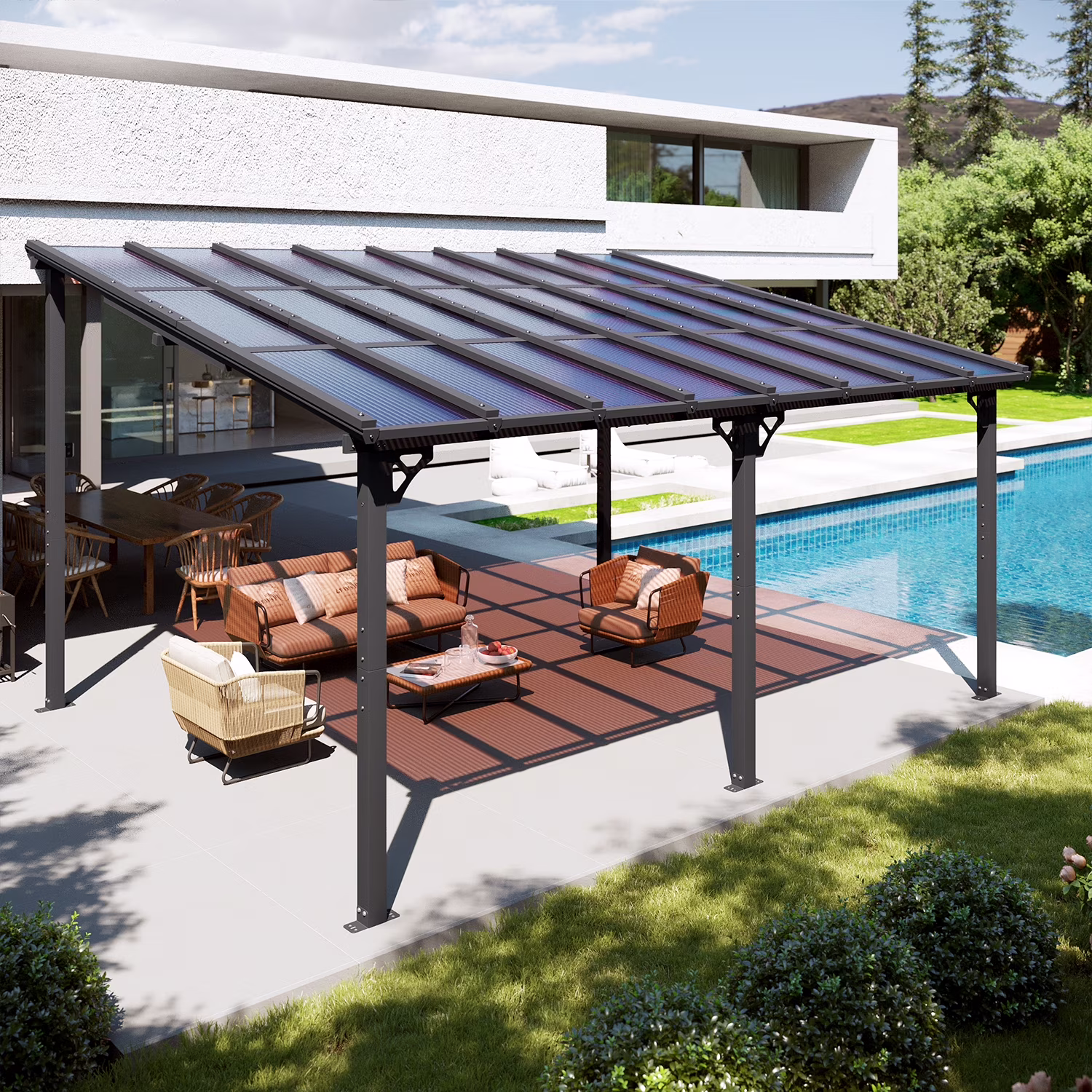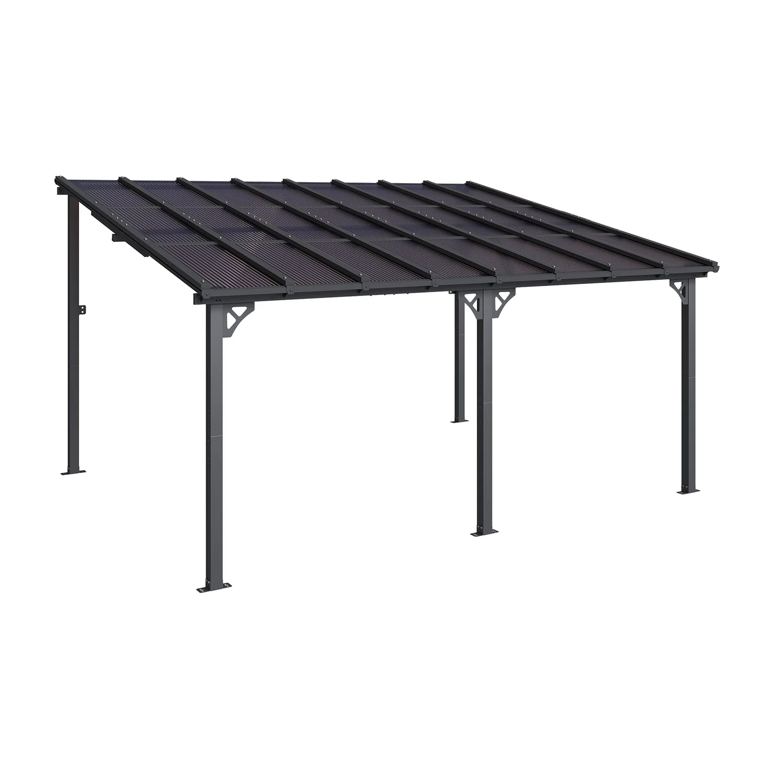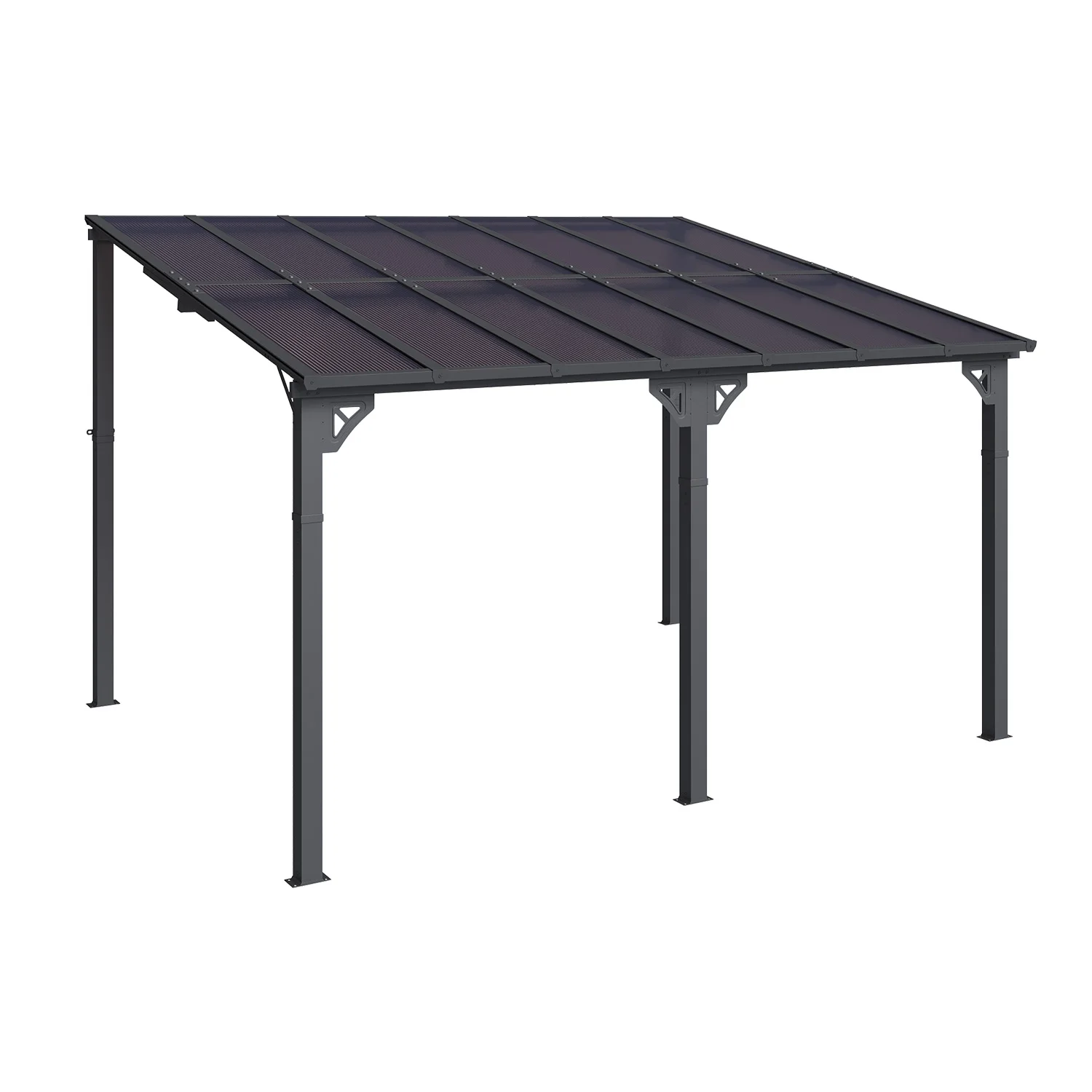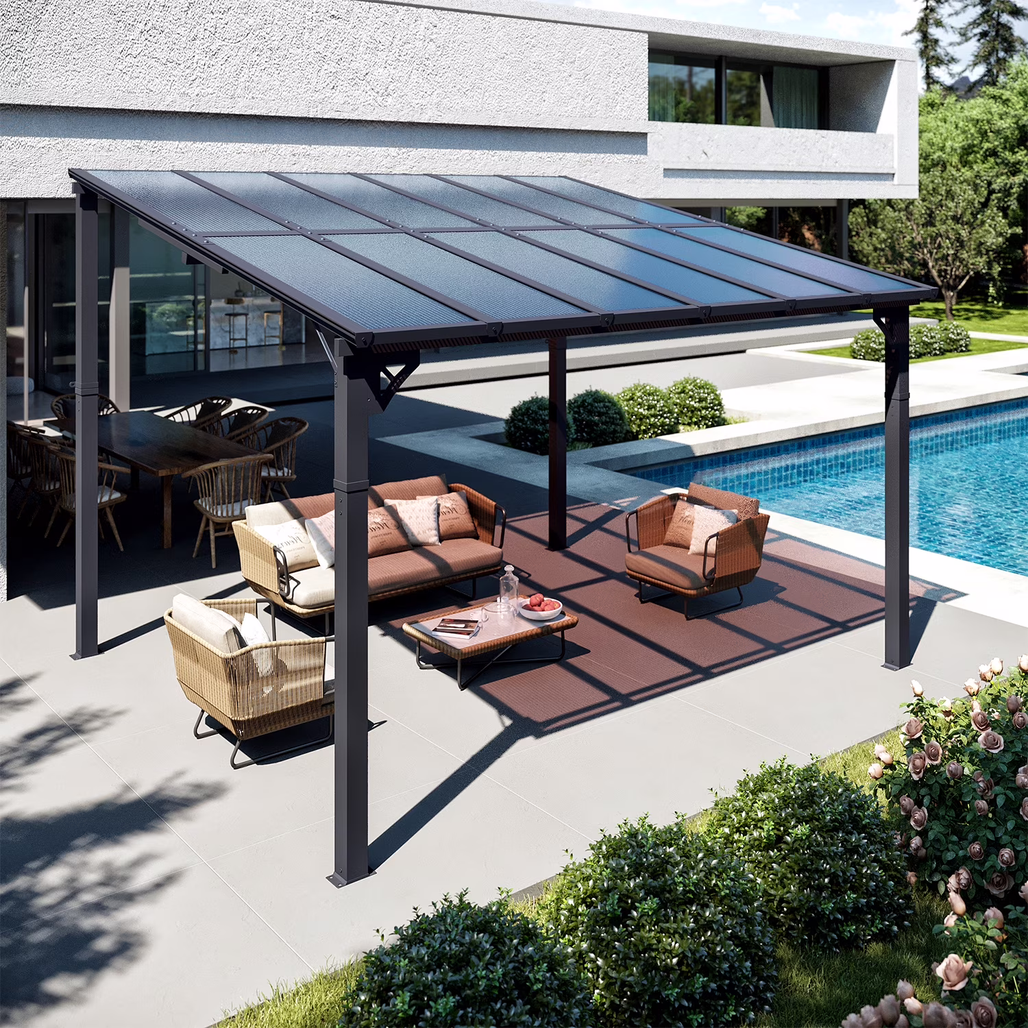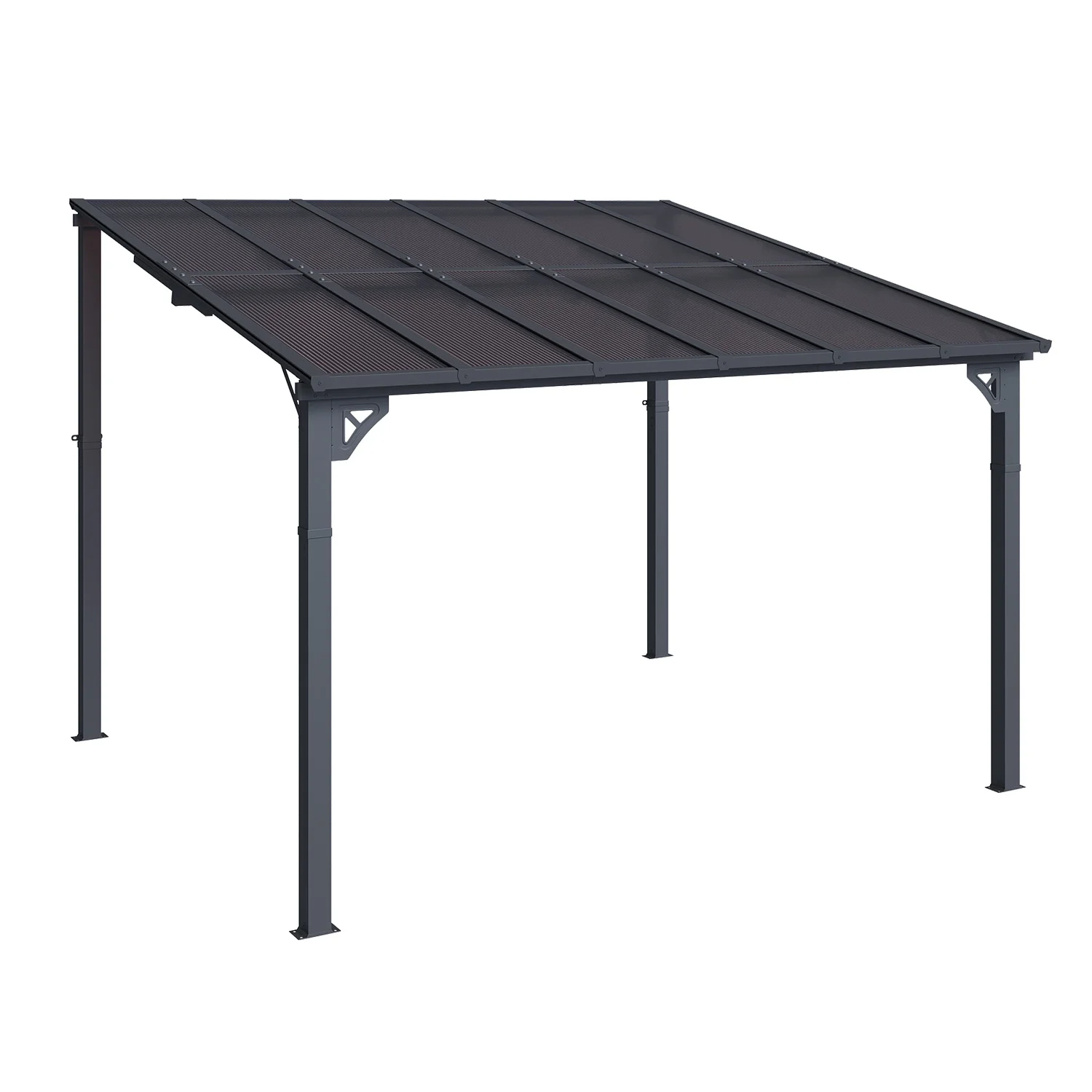- Stylish Design & Sloped Roof: Featuring a contemporary and unique sloped roof design, this pergola enhances the visual appeal of any garden, yard, or outdoor space. The angled roof not only adds a modern aesthetic but also ensures efficient water drainage, preventing rainwater accumulation