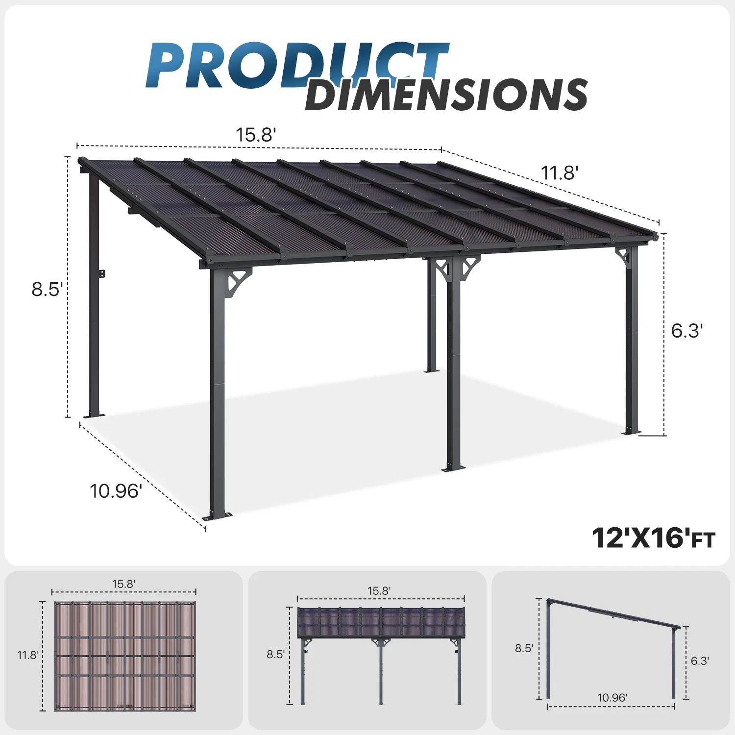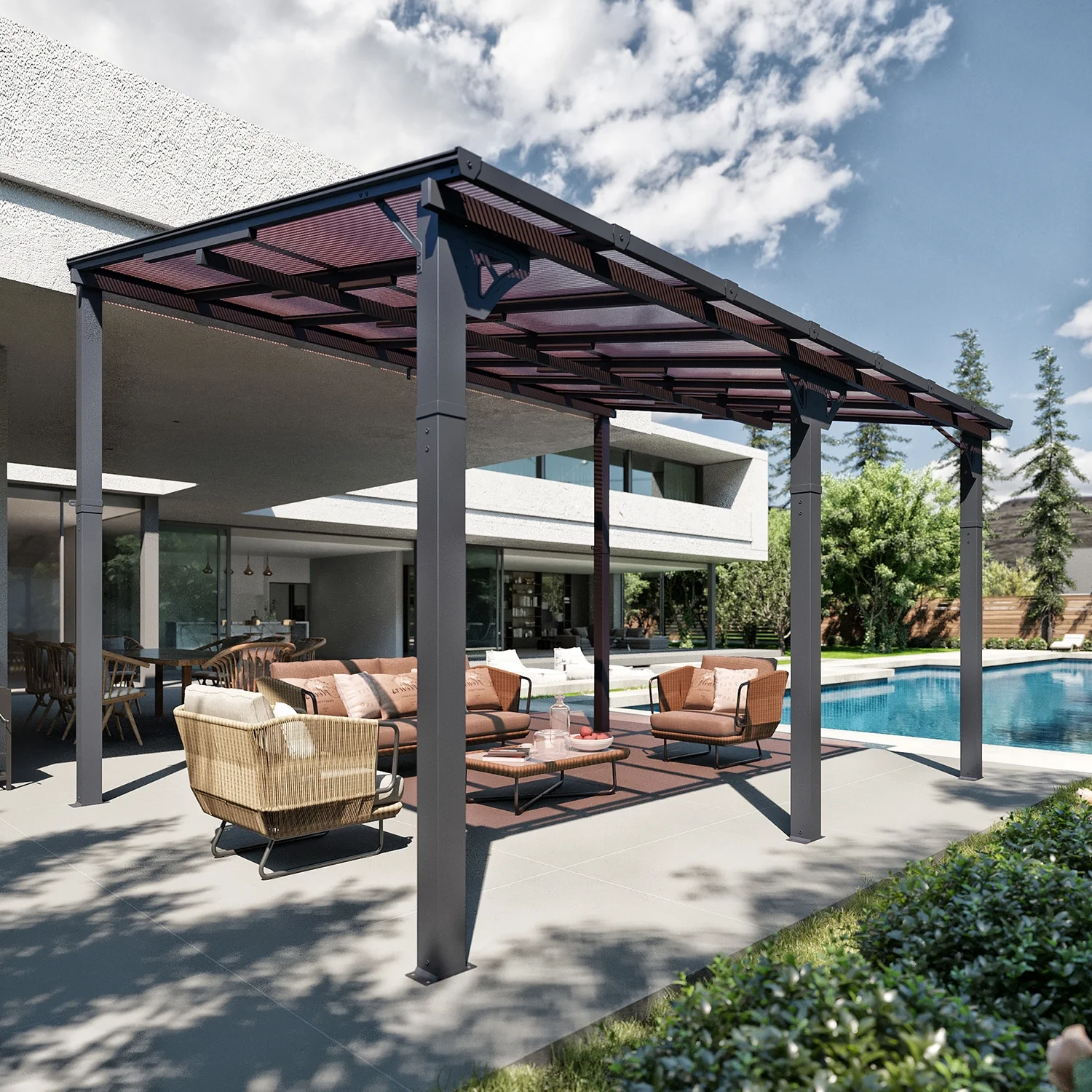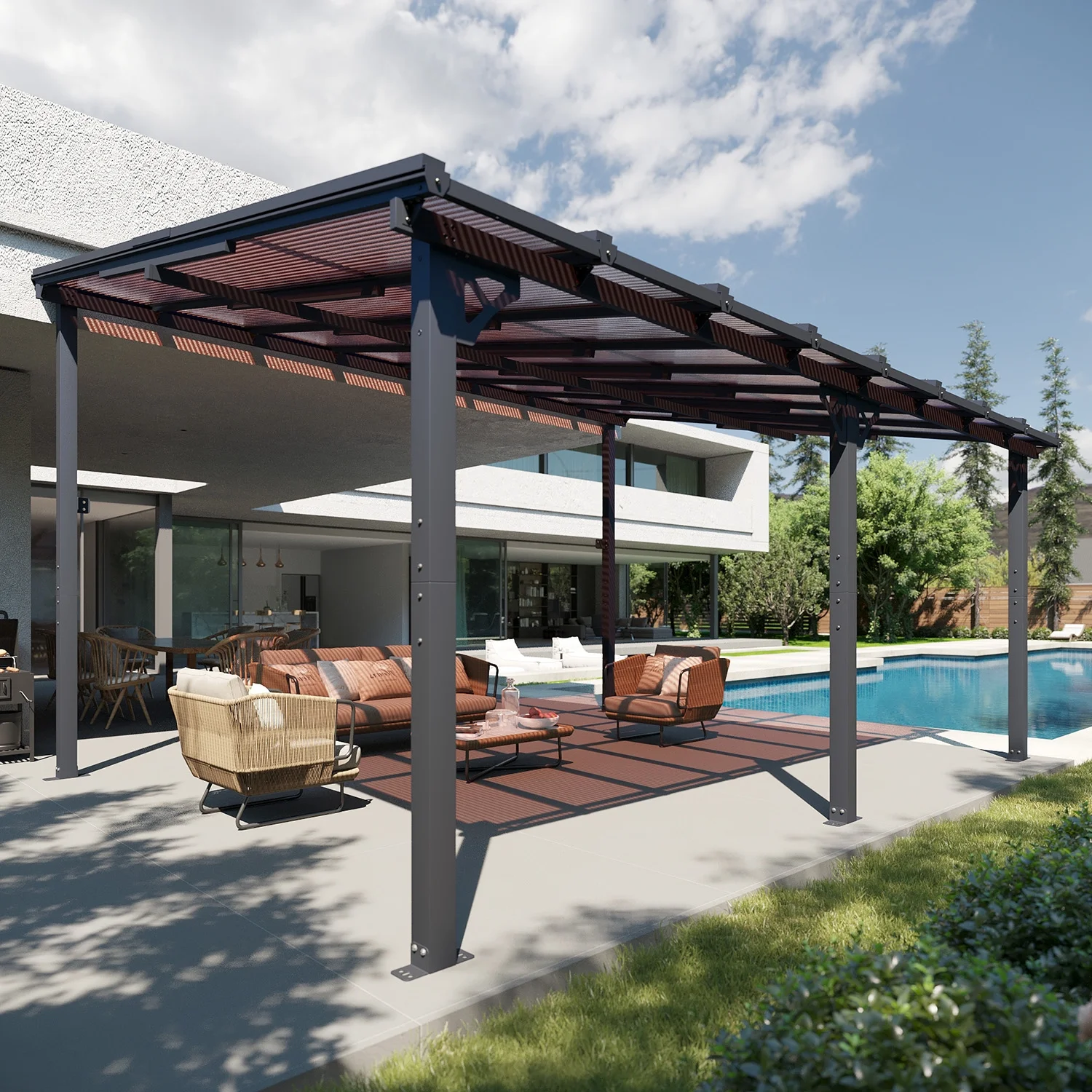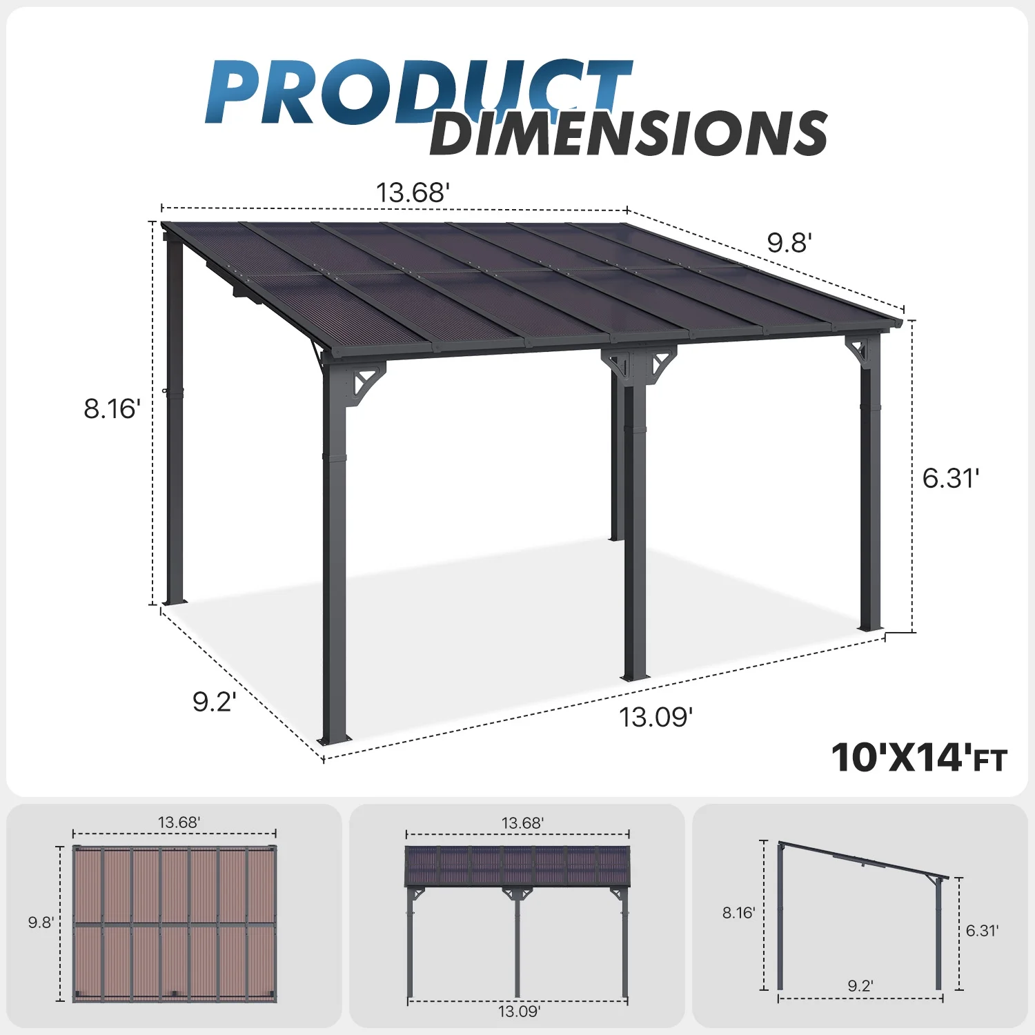 - Stylish Design & Sloped Roof: Featuring a contemporary and unique sloped roof design, this pergola enhances the visual appeal of any garden, yard, or outdoor space. The angled roof not only adds a modern aesthetic but also ensures efficient water drainage, preventing rainwater accumulation