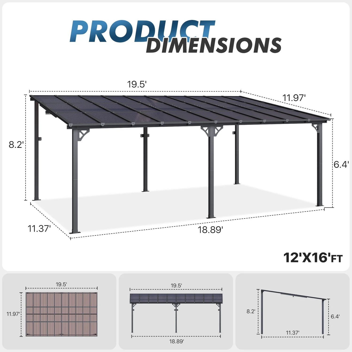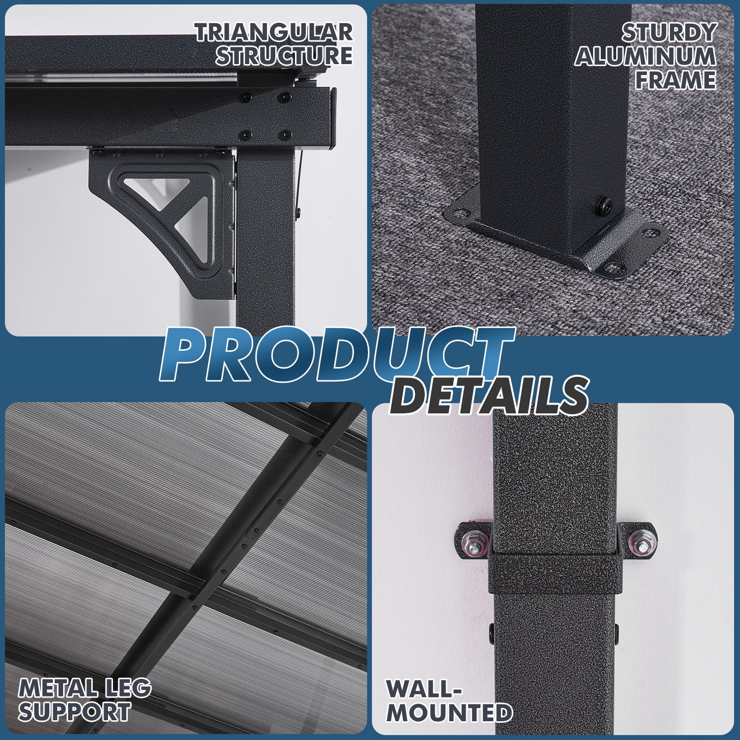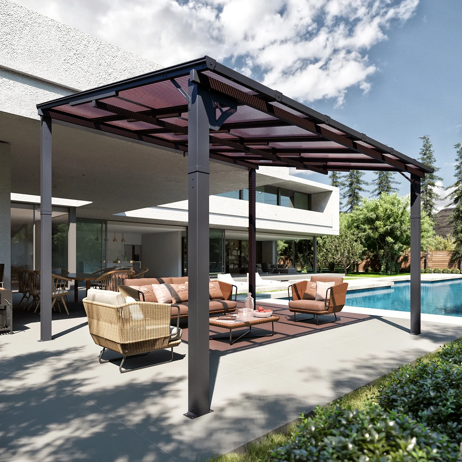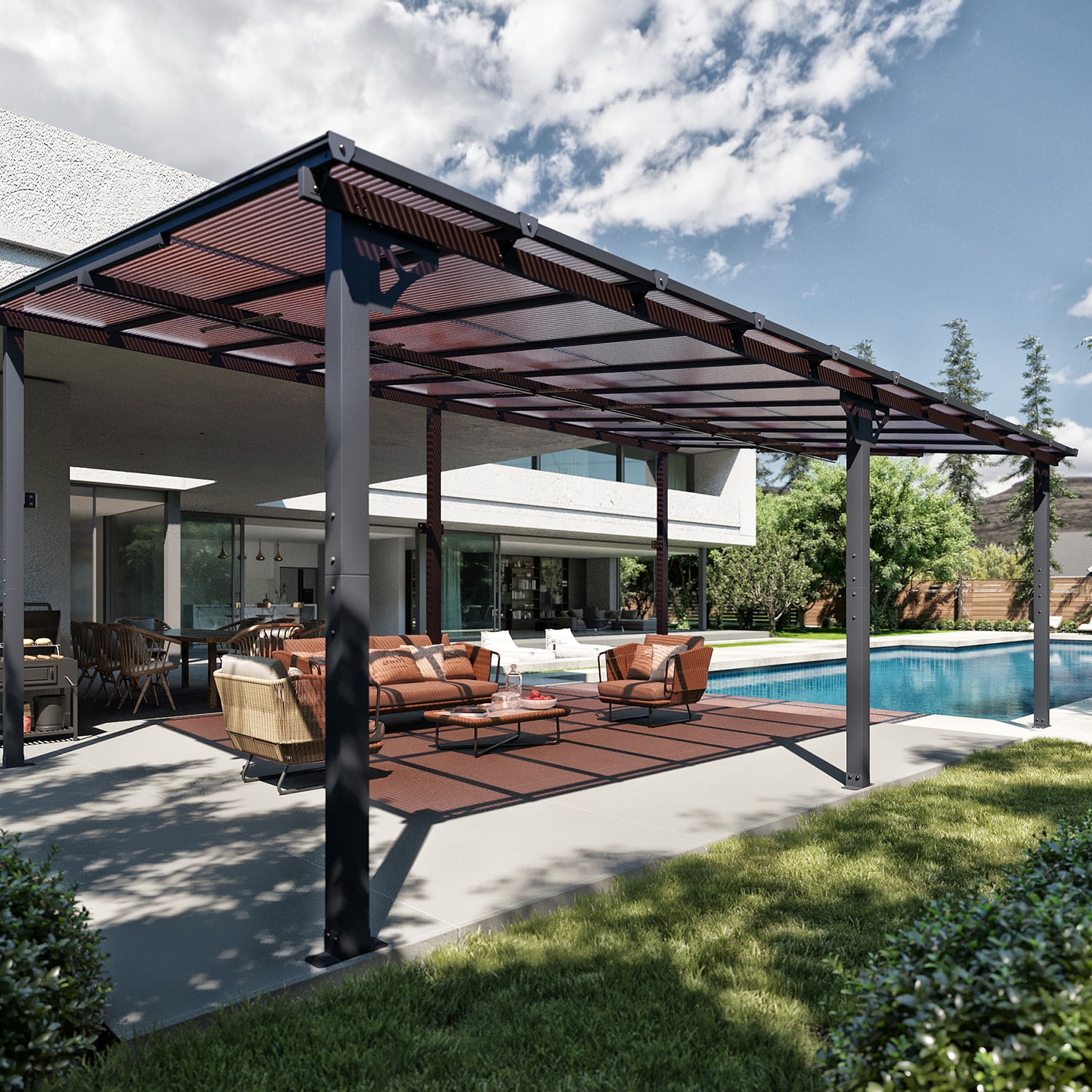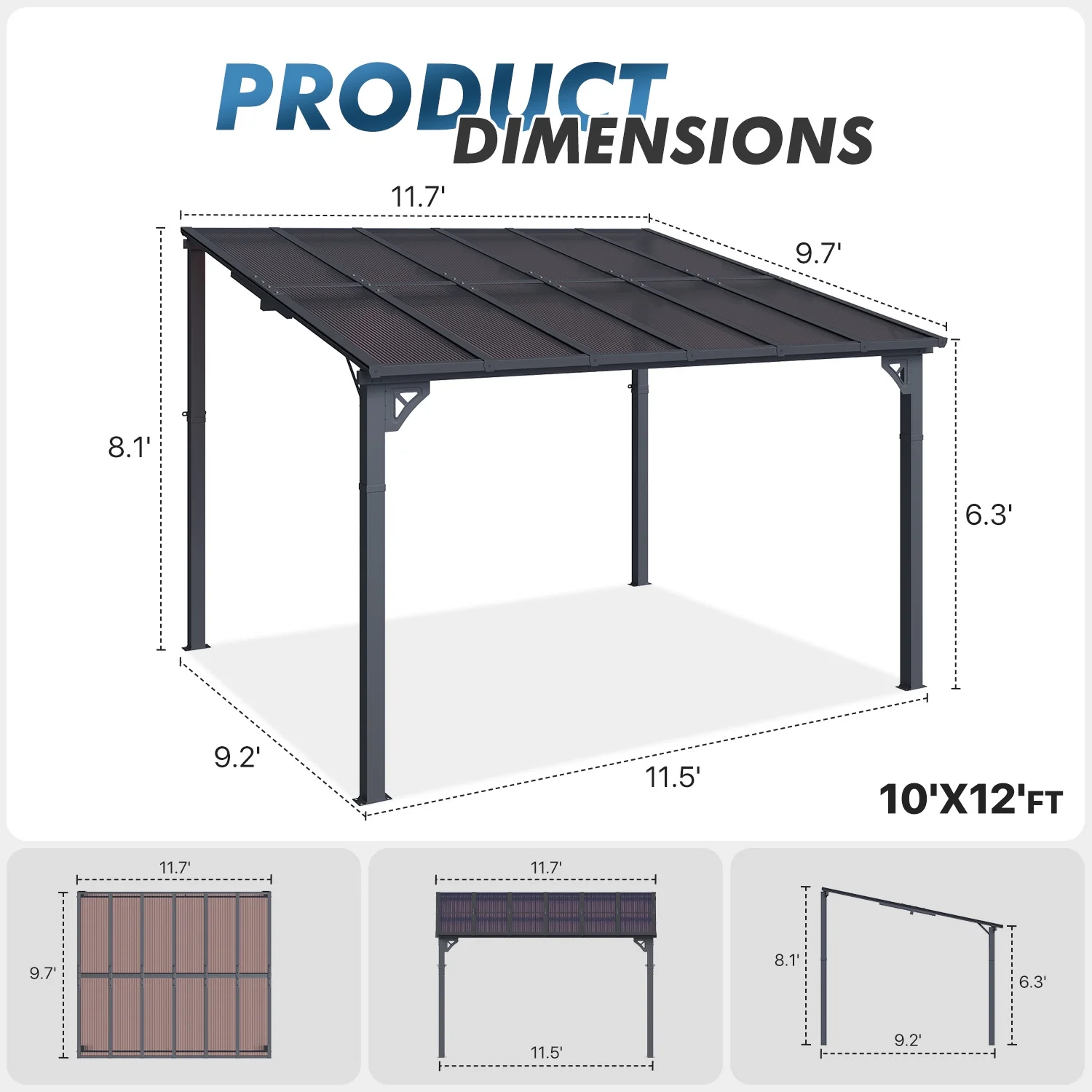 - Stylish Design & Sloped Roof: Featuring a contemporary and unique sloped roof design, this pergola enhances the visual appeal of any garden, yard, or outdoor space. The angled roof not only adds a modern aesthetic but also ensures efficient water drainage, preventing rainwater accumulation