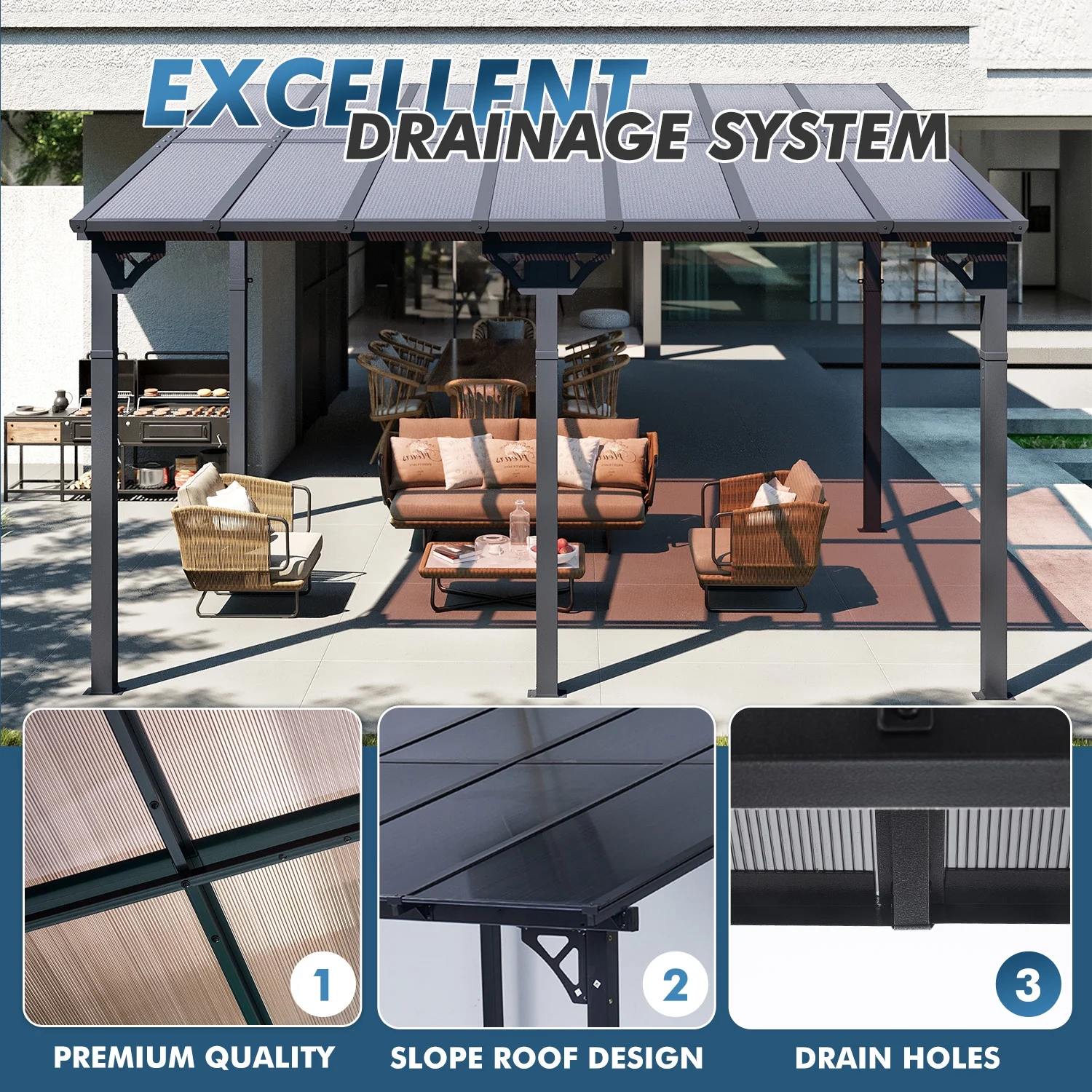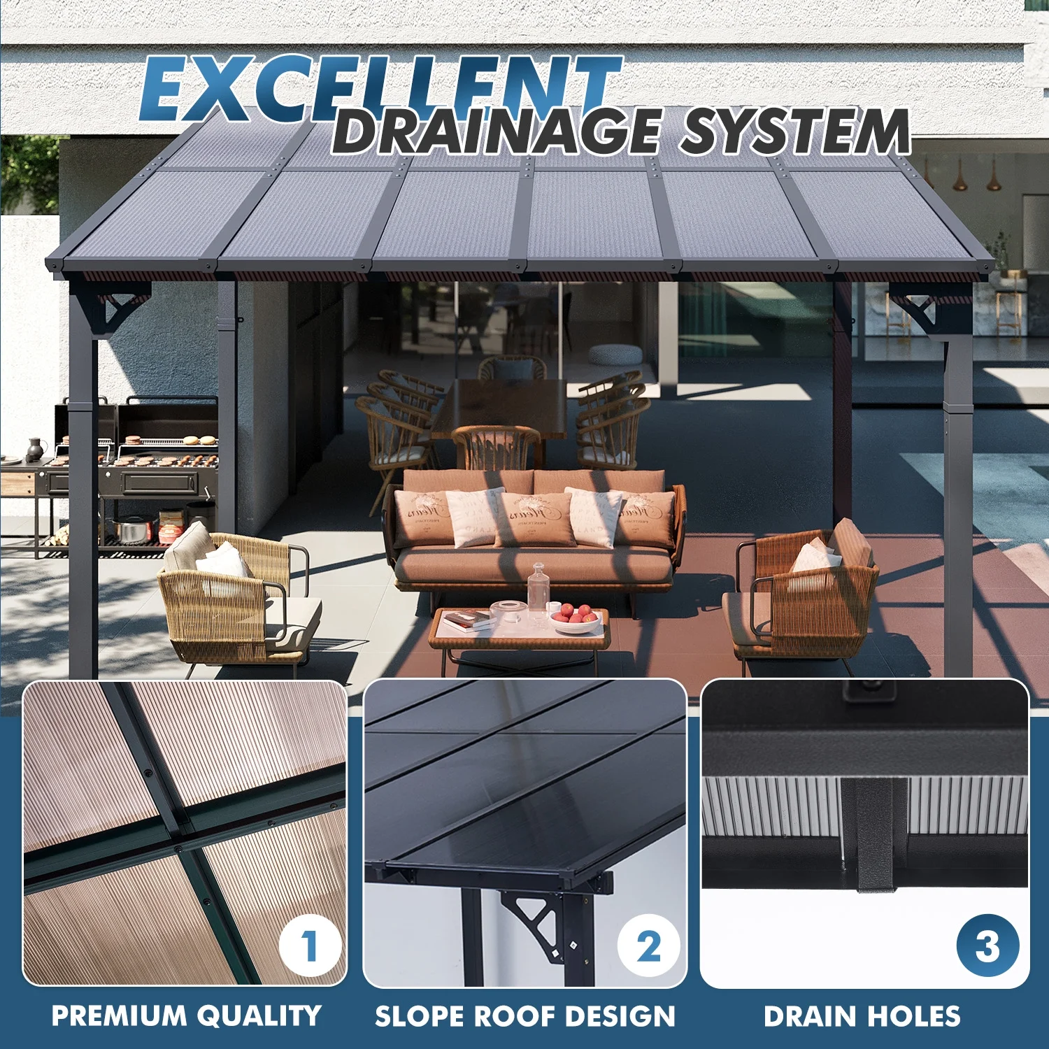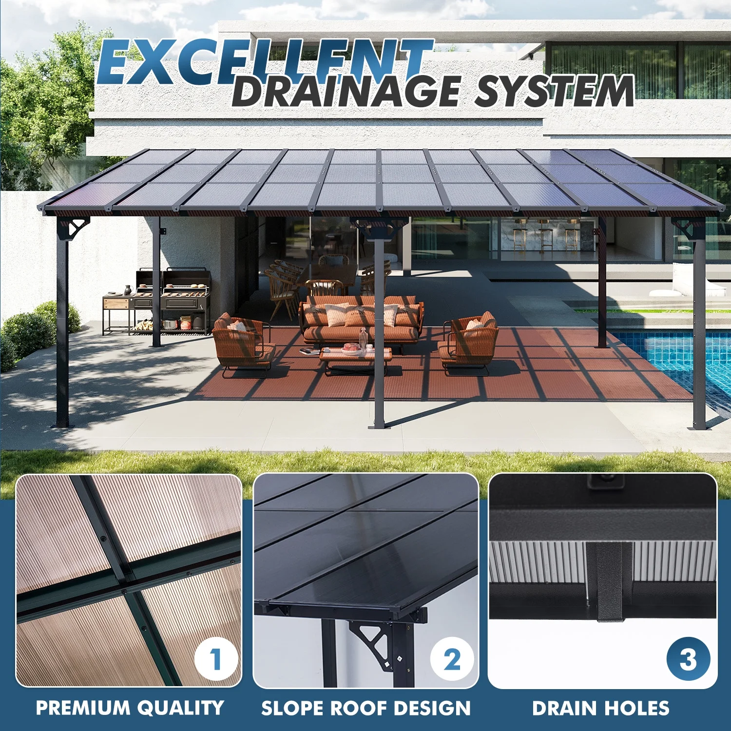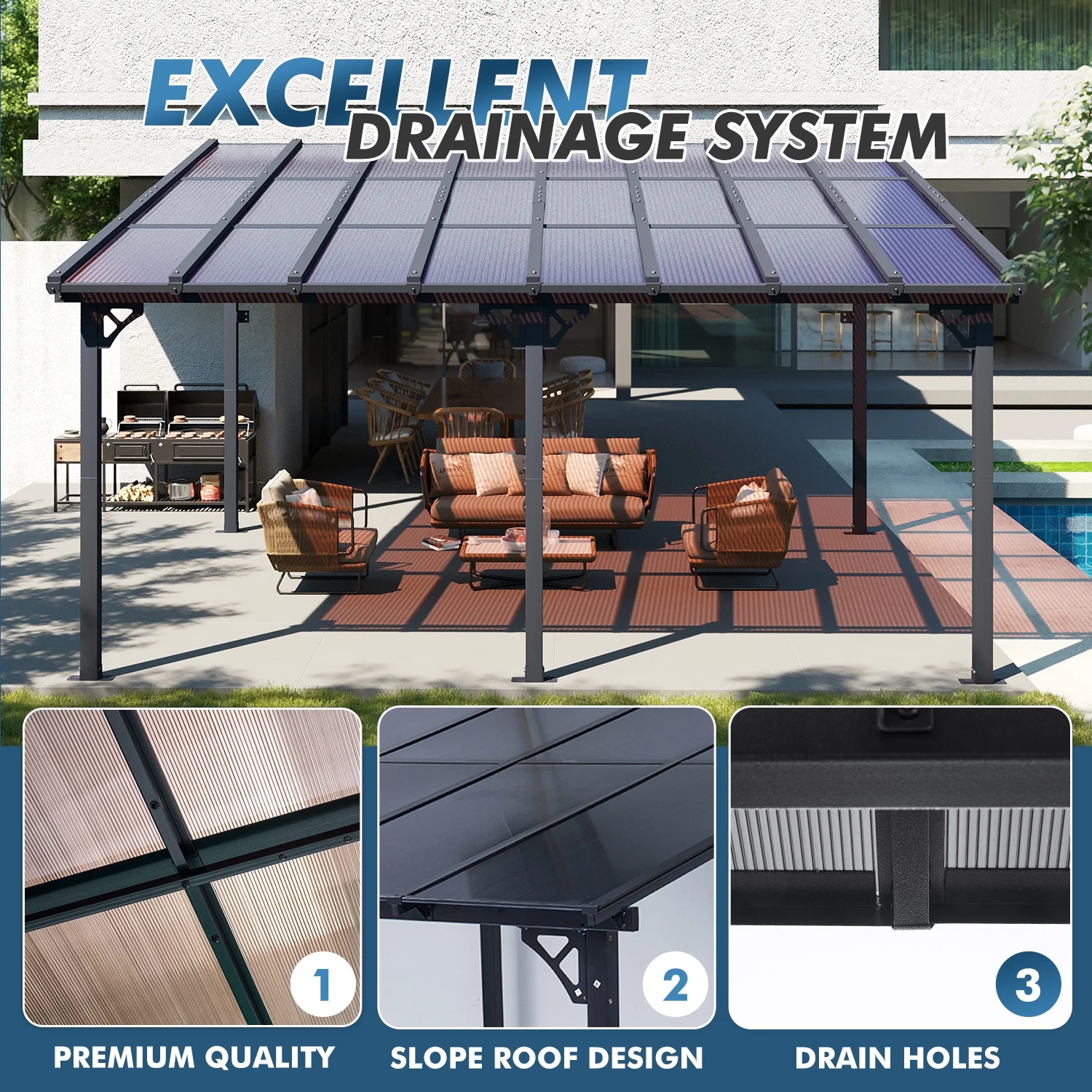 - High Quality Material: Crafted with material polycarbonate hollow sheets, our gazebo delivers exceptional sun protection by blocking direct sunlight, creating a cool and comfortable shaded area