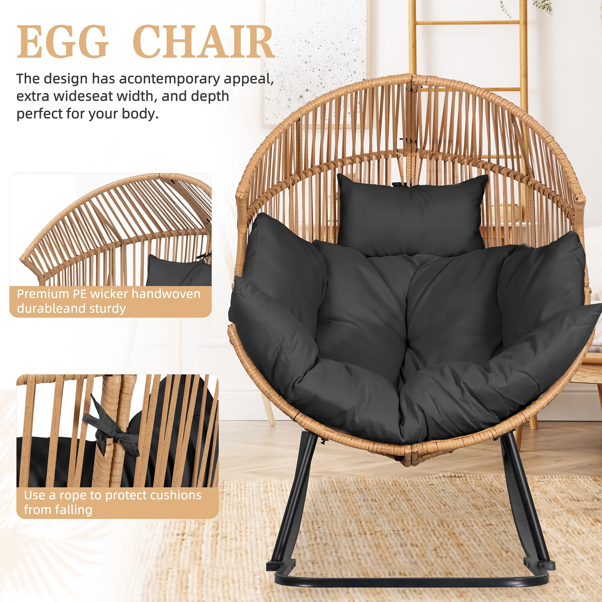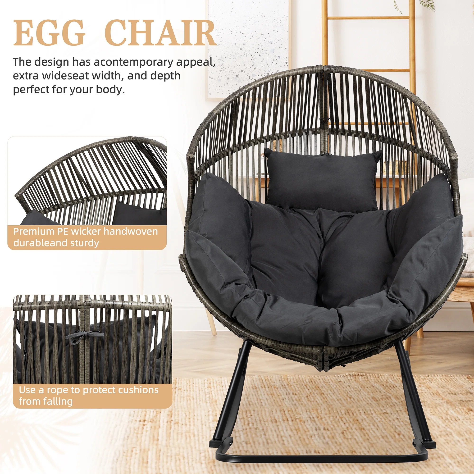 We use premium handwoven PE wicker for this patio large adult egg chair. The wicker is sturdy and not easy to break which guarantees this set will last longer. This egg chair with stand is rock-solid! Crafted with a sturdy powder-coated steel frame for added stability and durability.