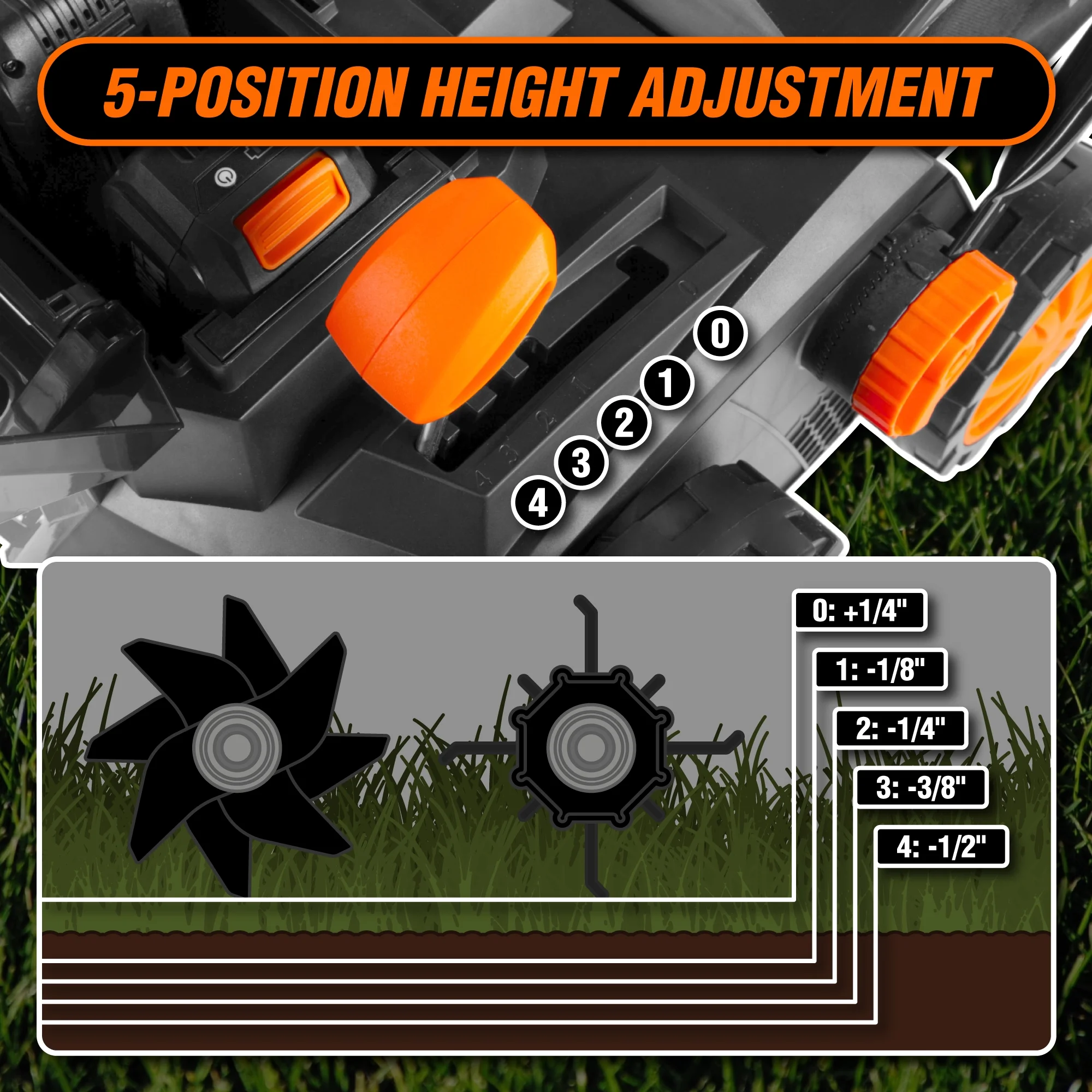 - Customizable Depth: 5position height adjustment ranges from +1/4 to 1/2 inch for tailored lawn care