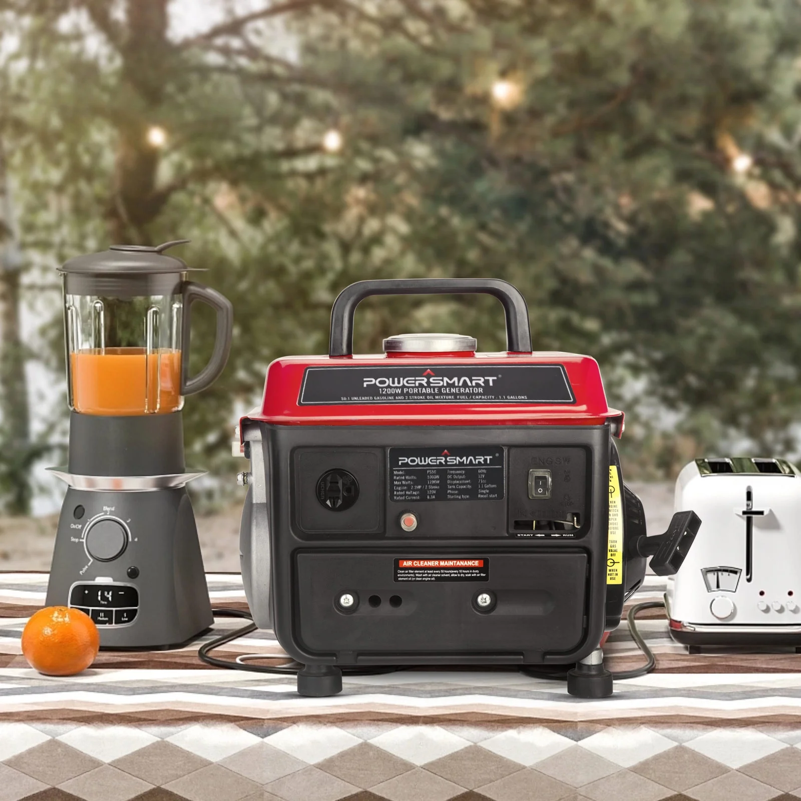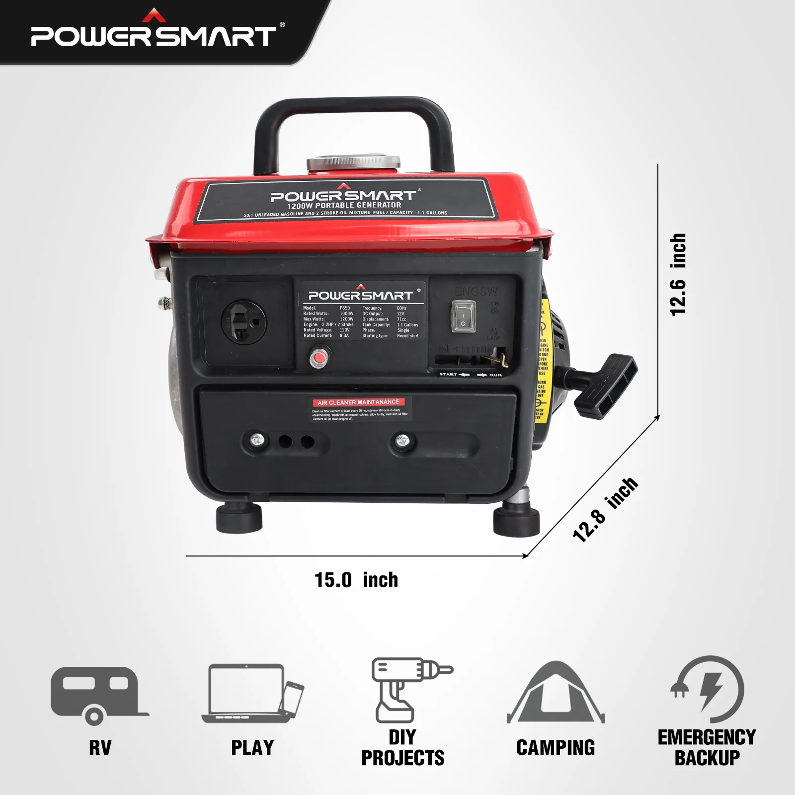 - 1200 peak surge Watts / 900 rated running Watts, Run time: 5 hours at 50% load, 1.1 gallon fuel tank