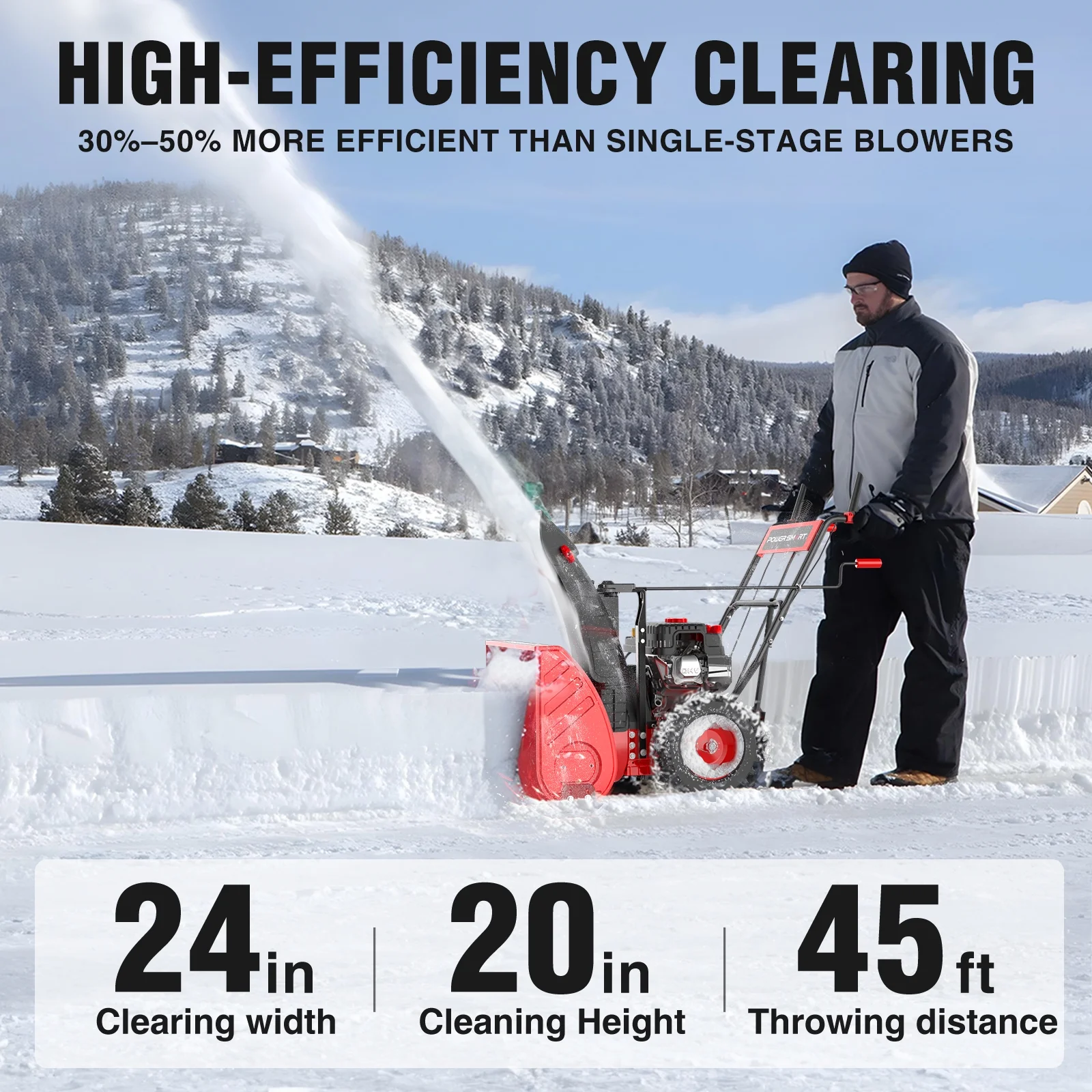 - Optimized Snow Handling: Designed for heavy snowfall, the 24-inch clearing width and 12-inch intake height efficiently tackle deep accumulations. The advanced discharge system projects snow up to 45 feet, ensuring smooth and rapid removal.