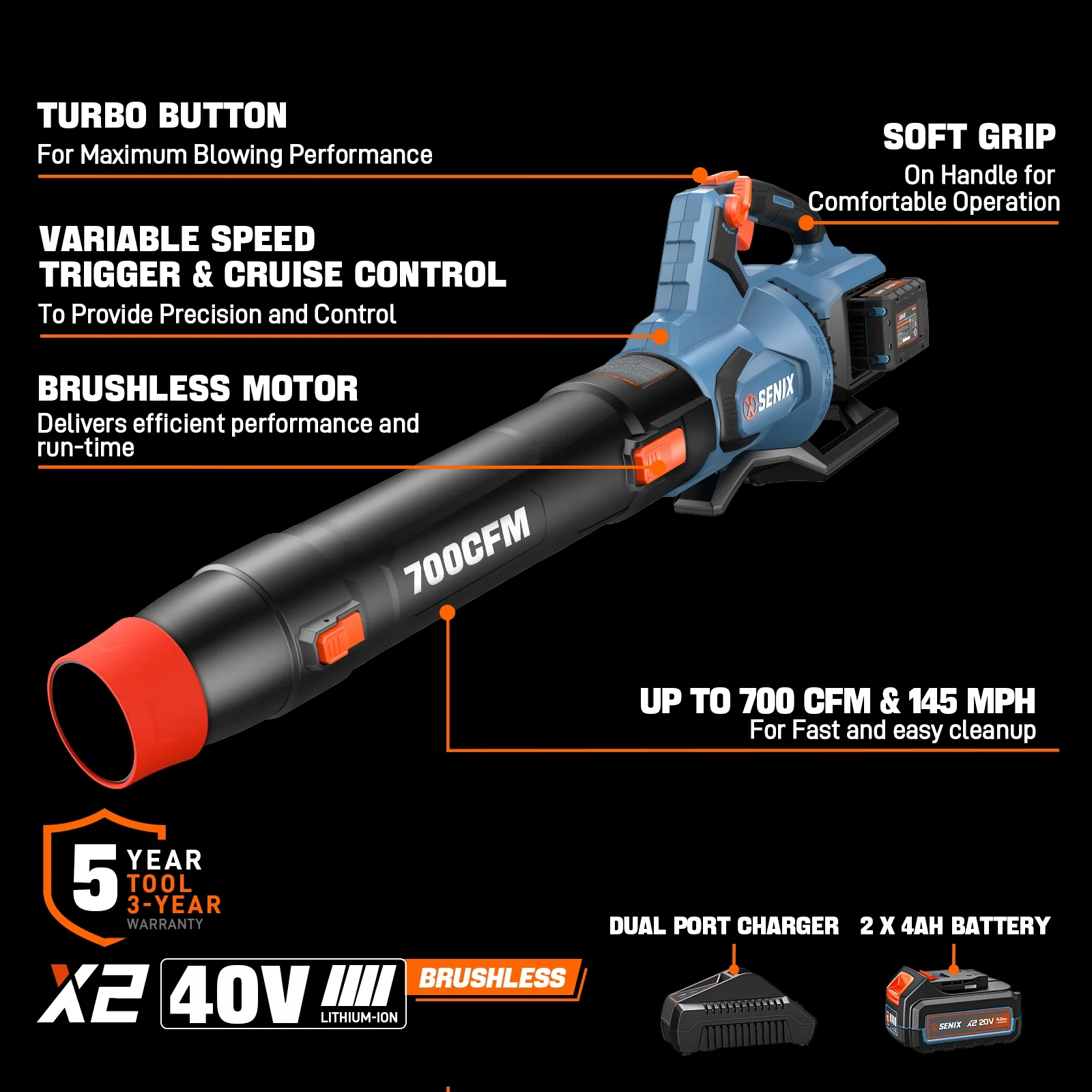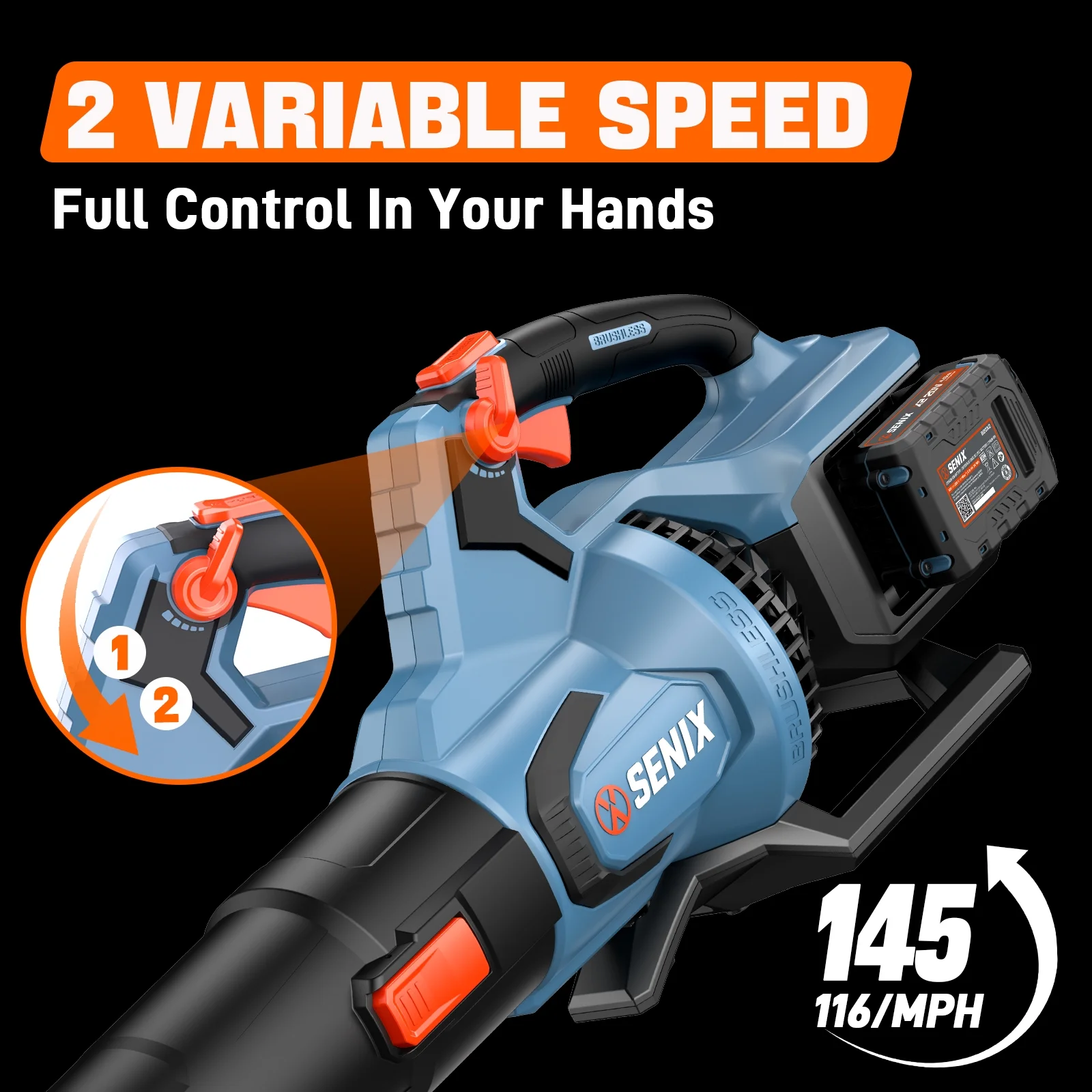 - Convenient Cruise Control and lightweight design ensures comfort during prolonged use with Senix leaf blower