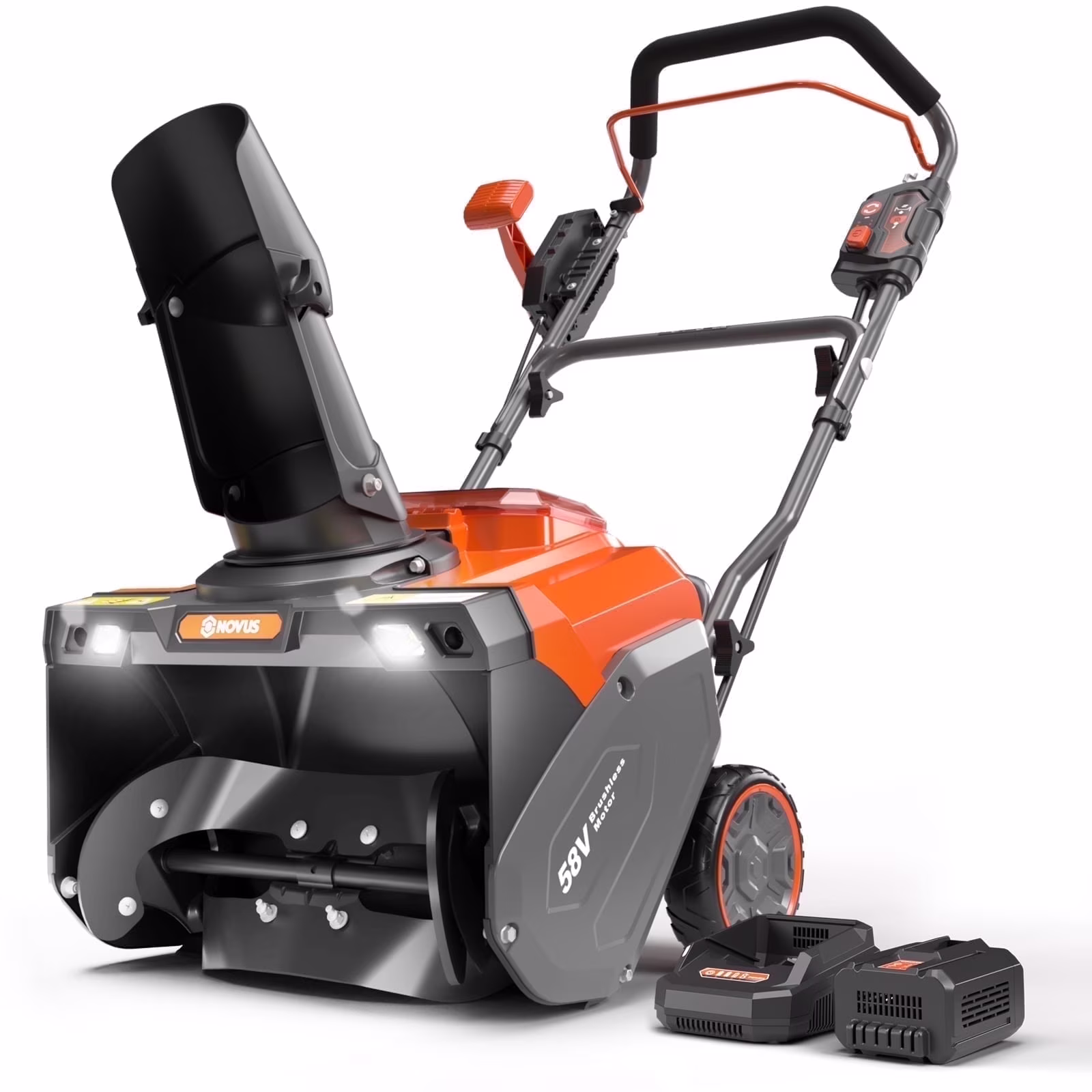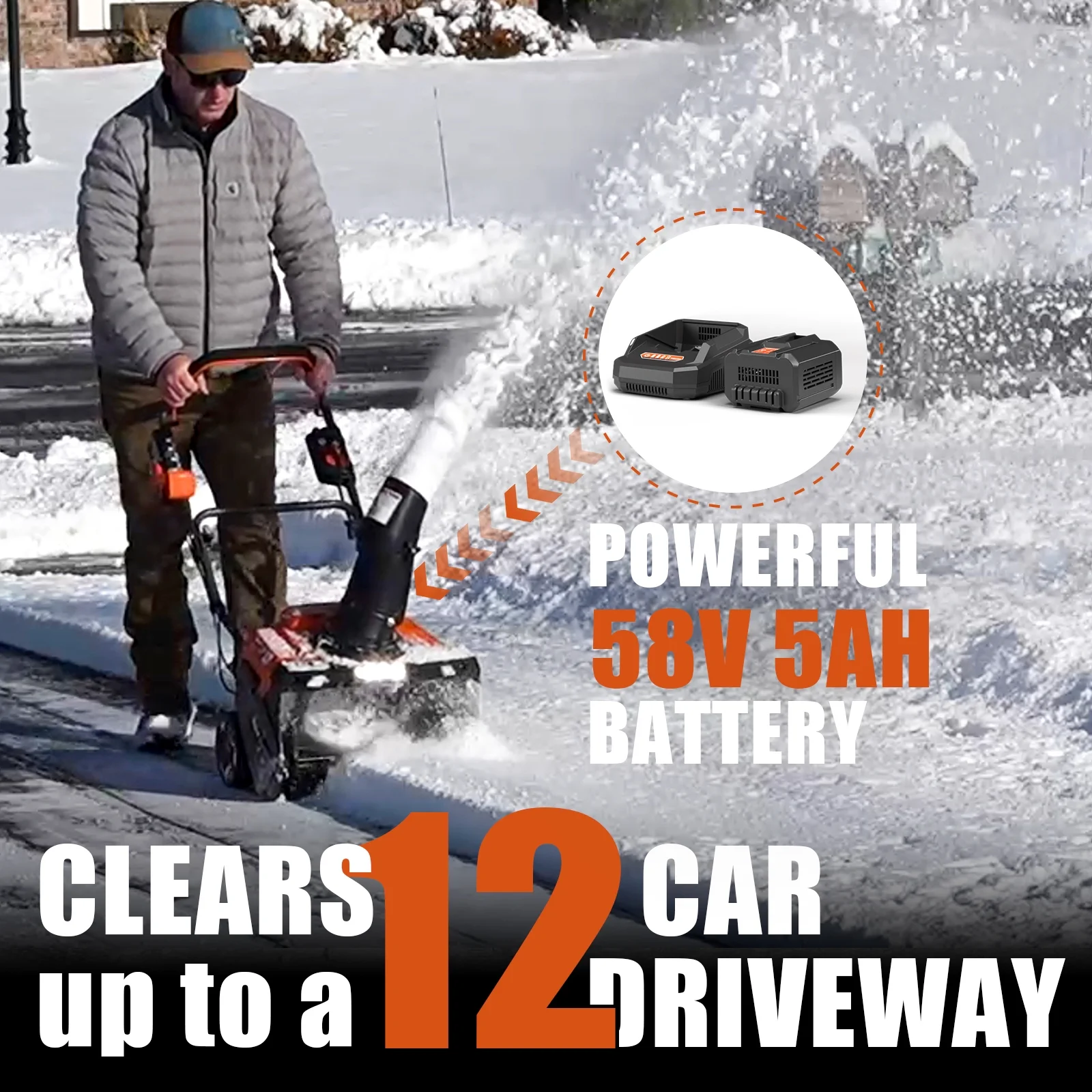- Equipped with the included 58V 5Ah Lithium Battery, the battery powered snow blower effortlessly clears up to 12-car driveway. This powerful battery ensures extended runtime and consistent performance, allowing you to tackle large areas without interruption. Fully charge in 1.5 hours for a working time up to 30 minutes.