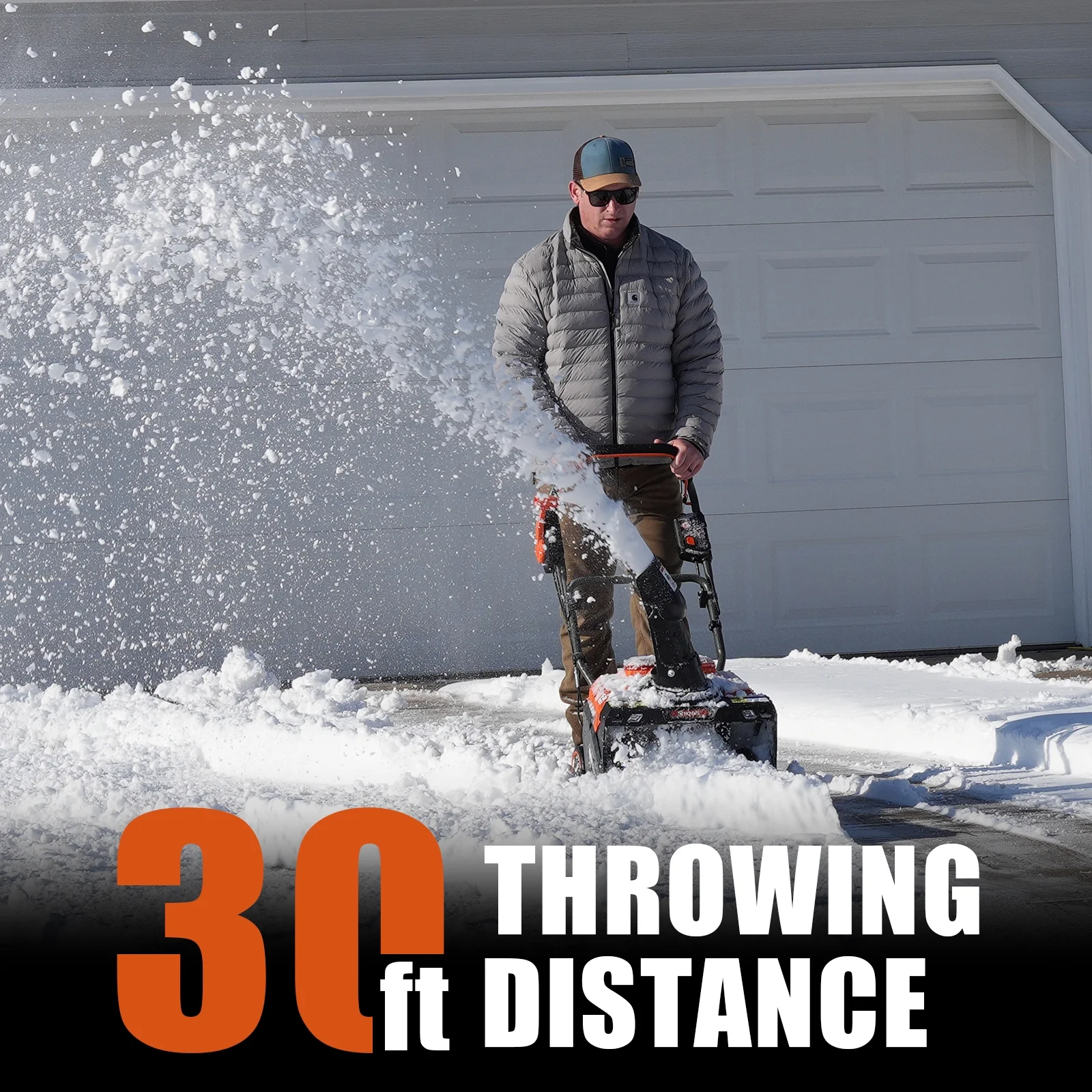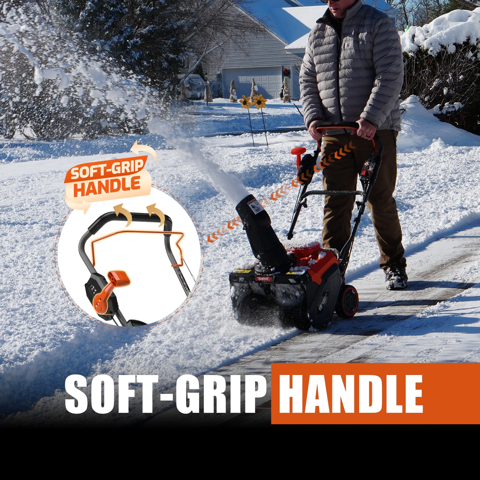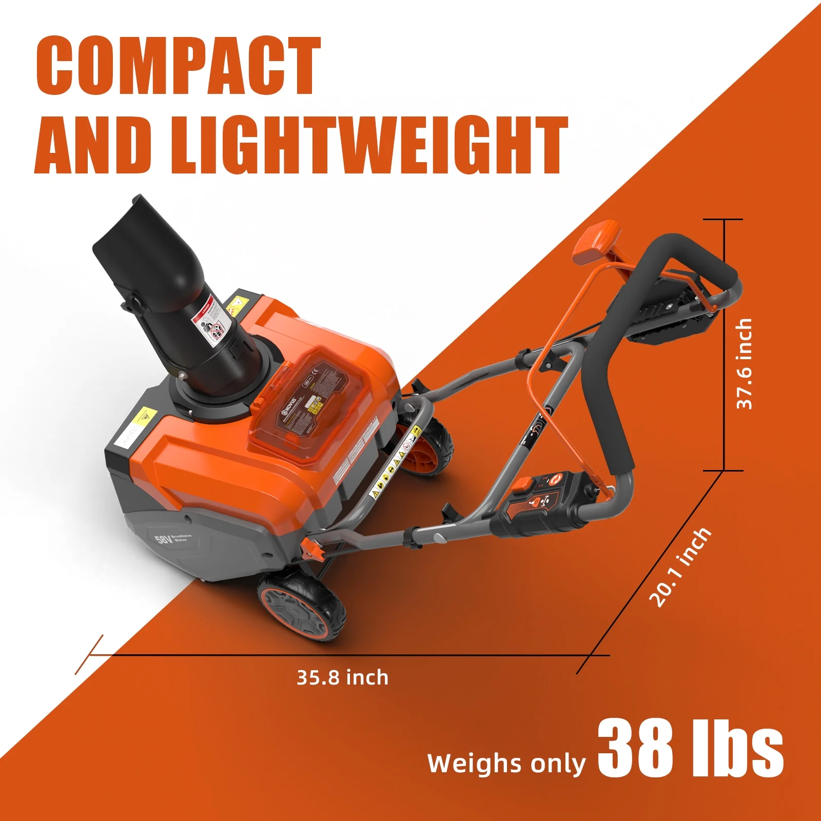- The entire snow thrower boasts a compact and lightweight design, making it highly convenient for use and storage. The lightweight design (only 38 lbs.) allows for easy maneuverability and handling. This combination of efficiency and portability ensures that users can operate the snow blower with minimal effort even in challenging conditions.