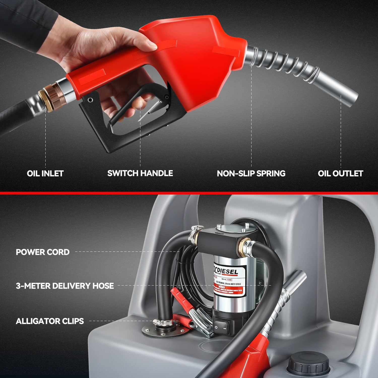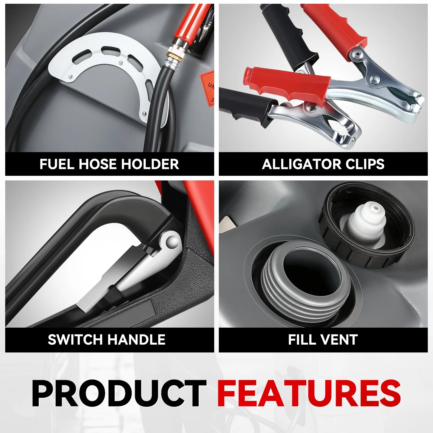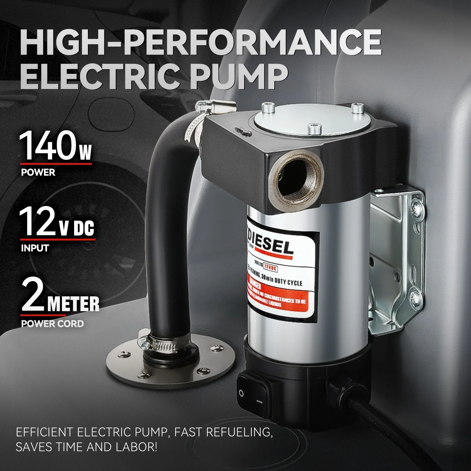 - Powered by a 140W, 12V DC motor, the fuel tank has an output of 40L/min (open flow).