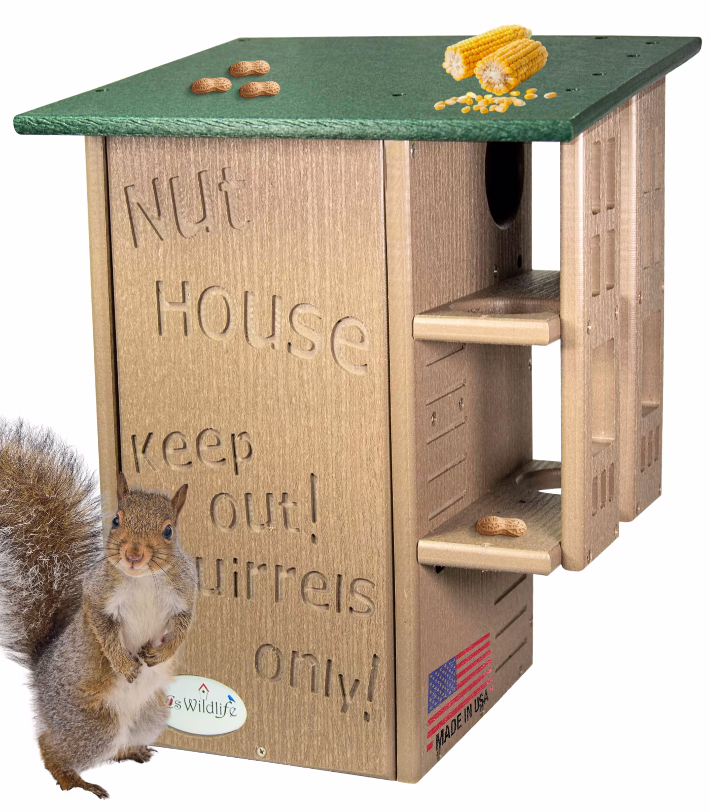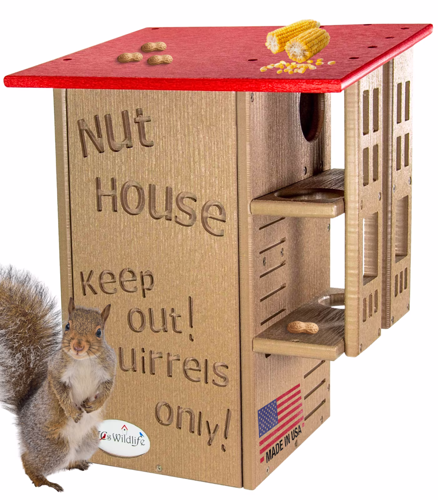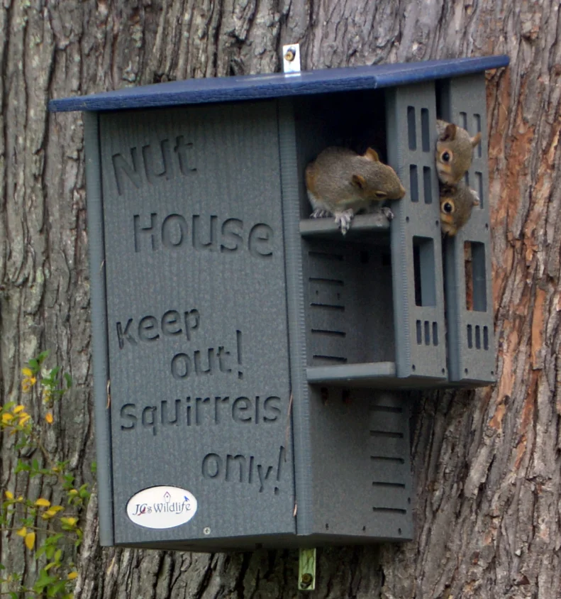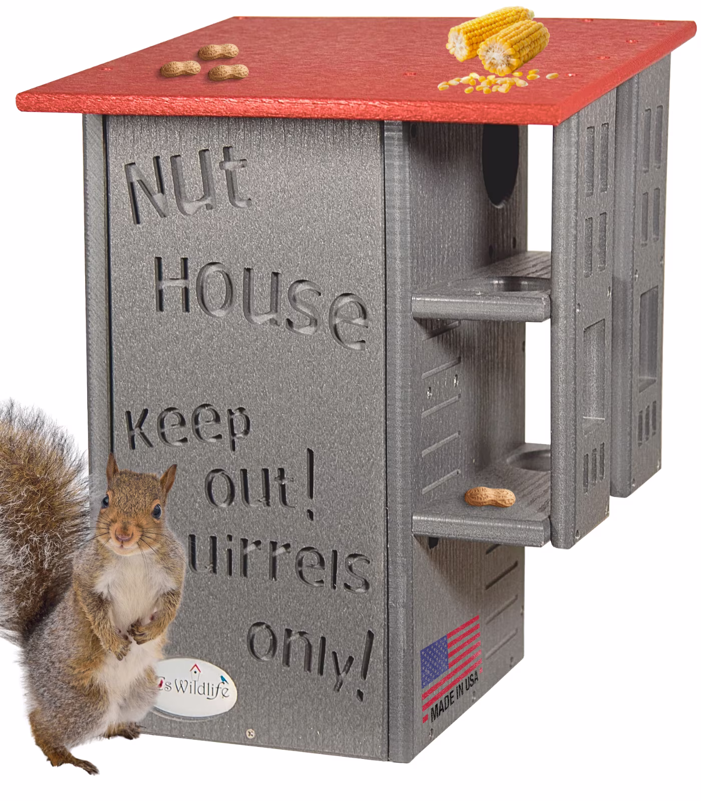 Invite your backyard's nuttiest creatures to move into their very own squirrel condo. The wording on the front says it all, it's the Nut House. This handmade squirrel house will keep the furry inhabitants entertained and safe at the same time. The resilient construction and innovative design is like no other home. This house is made specifically for squirrels. The predator guard and multi-tier platforms prevent predators like raccoons and opossums from having access to the inside. The front is able to be opened, providing easy access to clean the inside when it is empty. Our box gets rave reviews from squirrel enthusiasts and rehabilitators. Made in the USA!