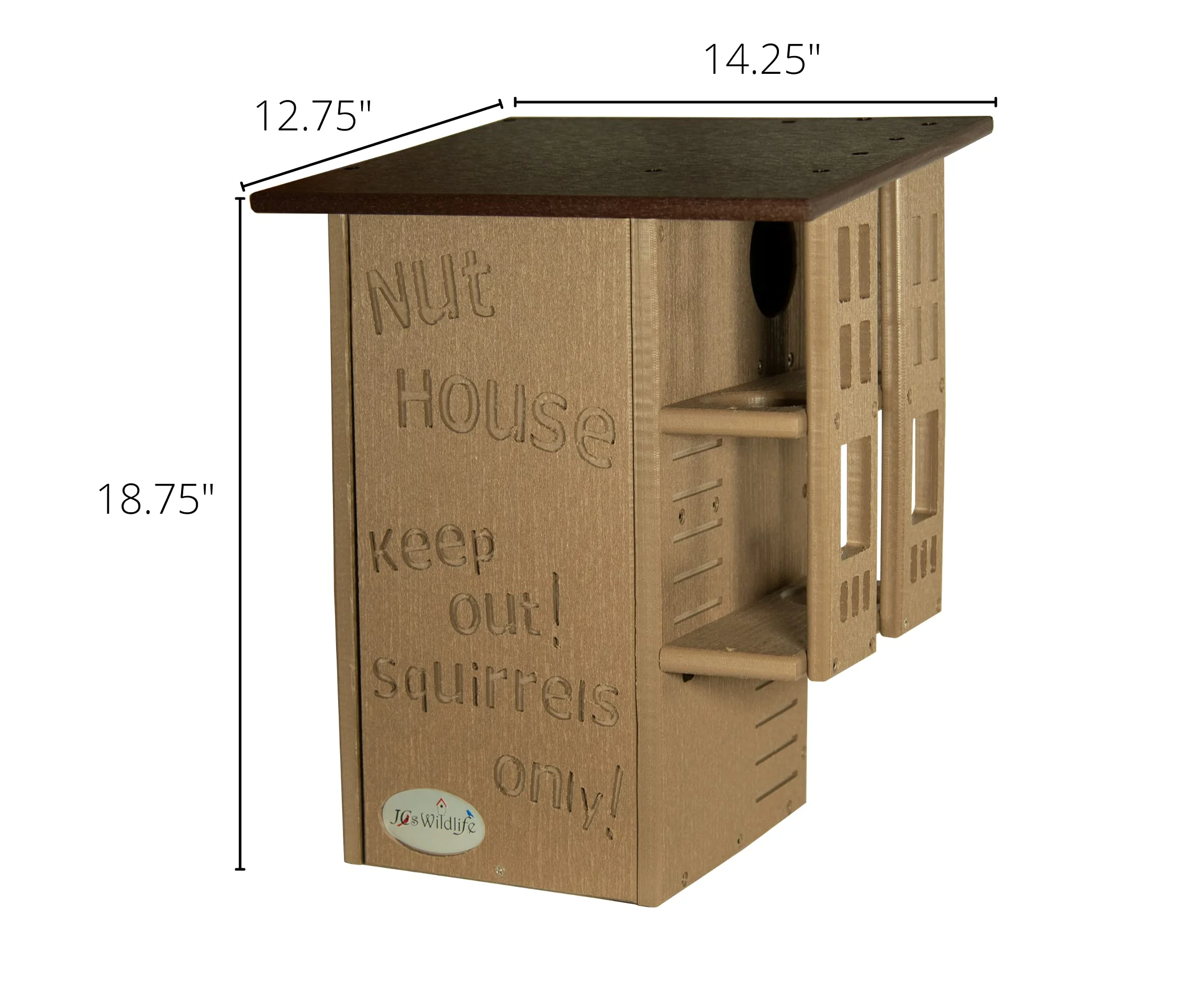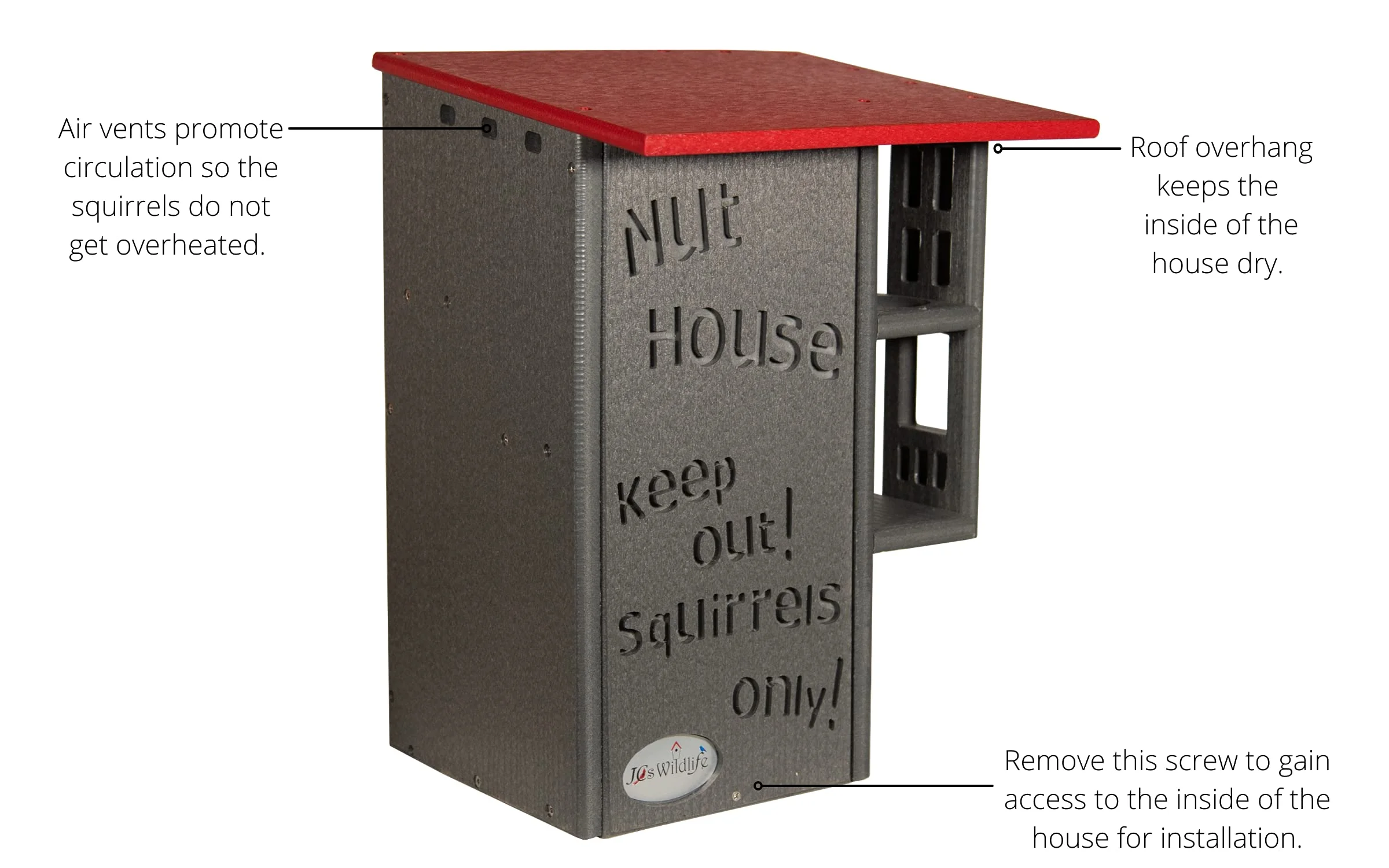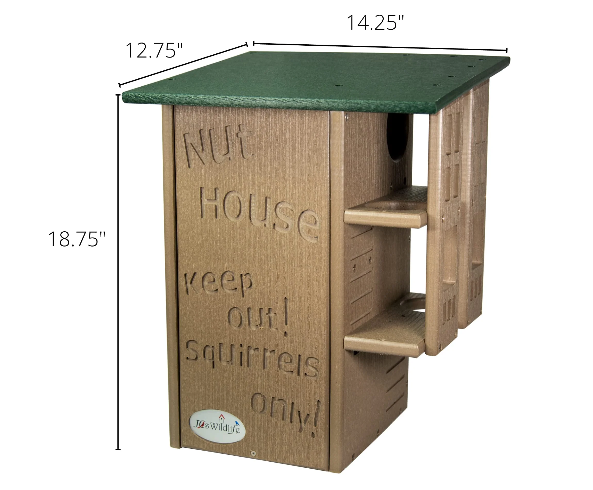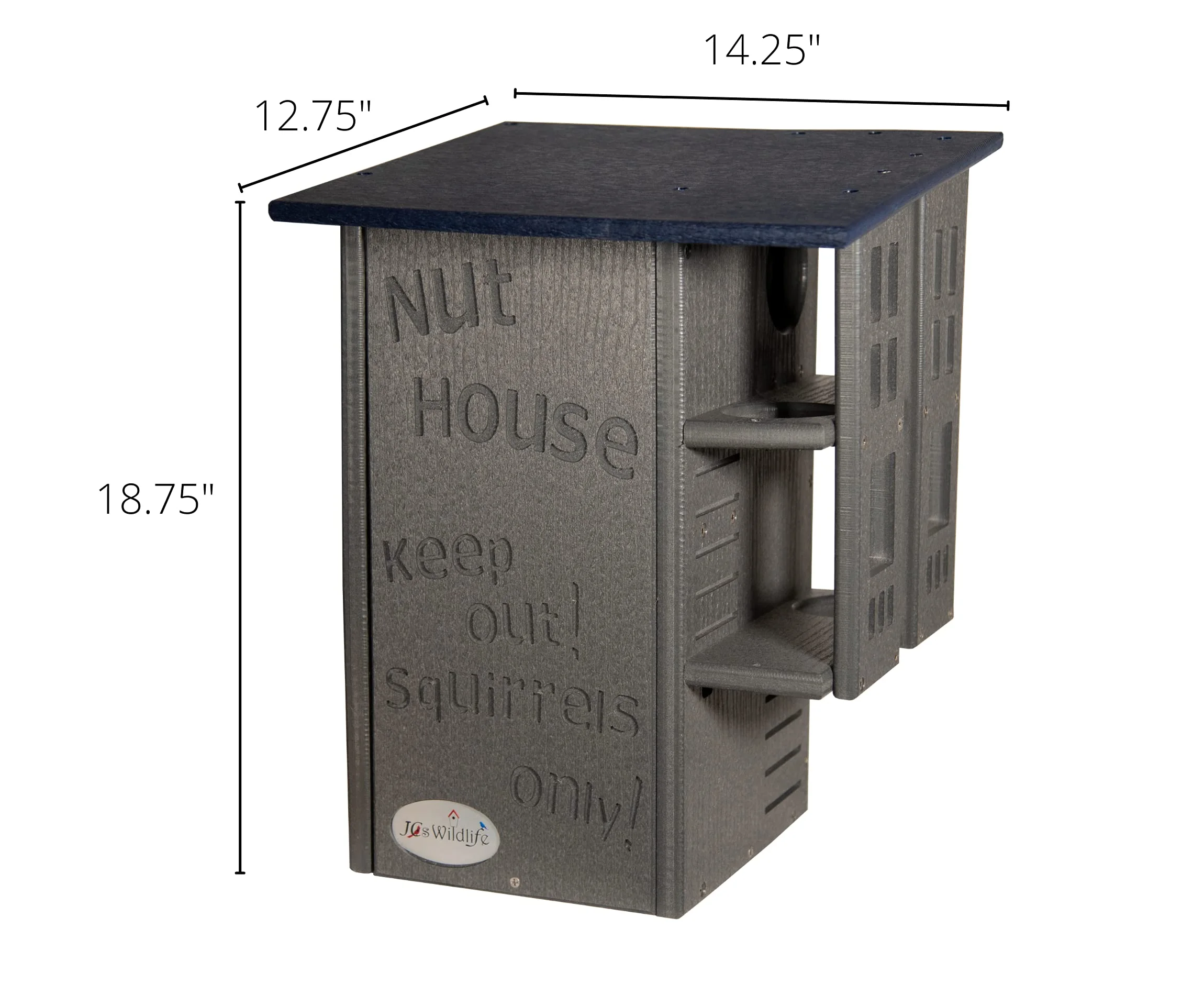 Invite your backyard's nuttiest creatures to move into their very own squirrel condo. The wording on the front says it all, it's the Nut House. This handmade squirrel house will keep the furry inhabitants entertained and safe at the same time. The resilient construction and innovative design is like no other home. This house is made specifically for squirrels. The predator guard and multi-tier platforms prevent predators like raccoons and opossums from having access to the inside. The front is able to be opened, providing easy access to clean the inside when it is empty. Our box gets rave reviews from squirrel enthusiasts and rehabilitators. Made in the USA!
