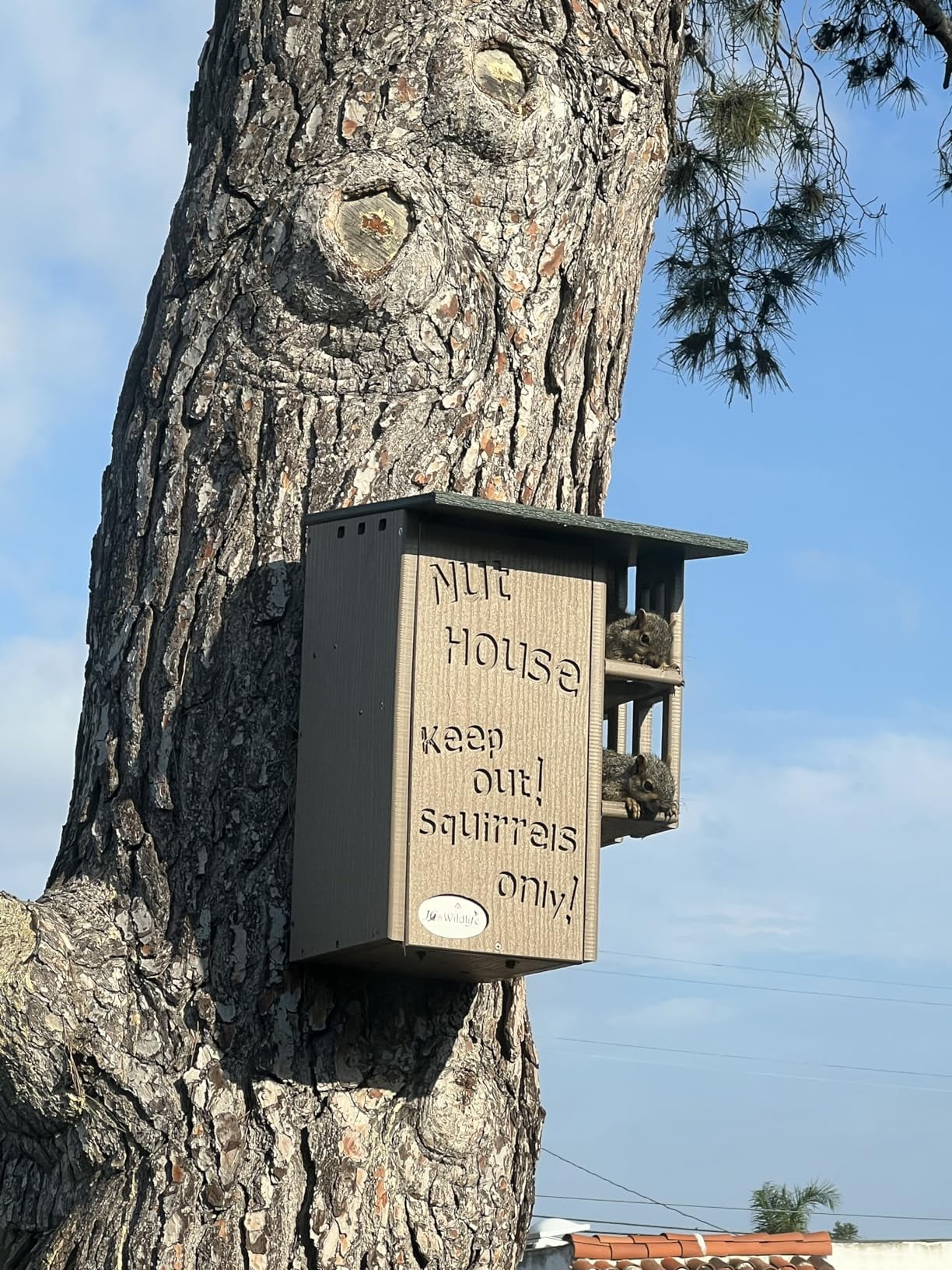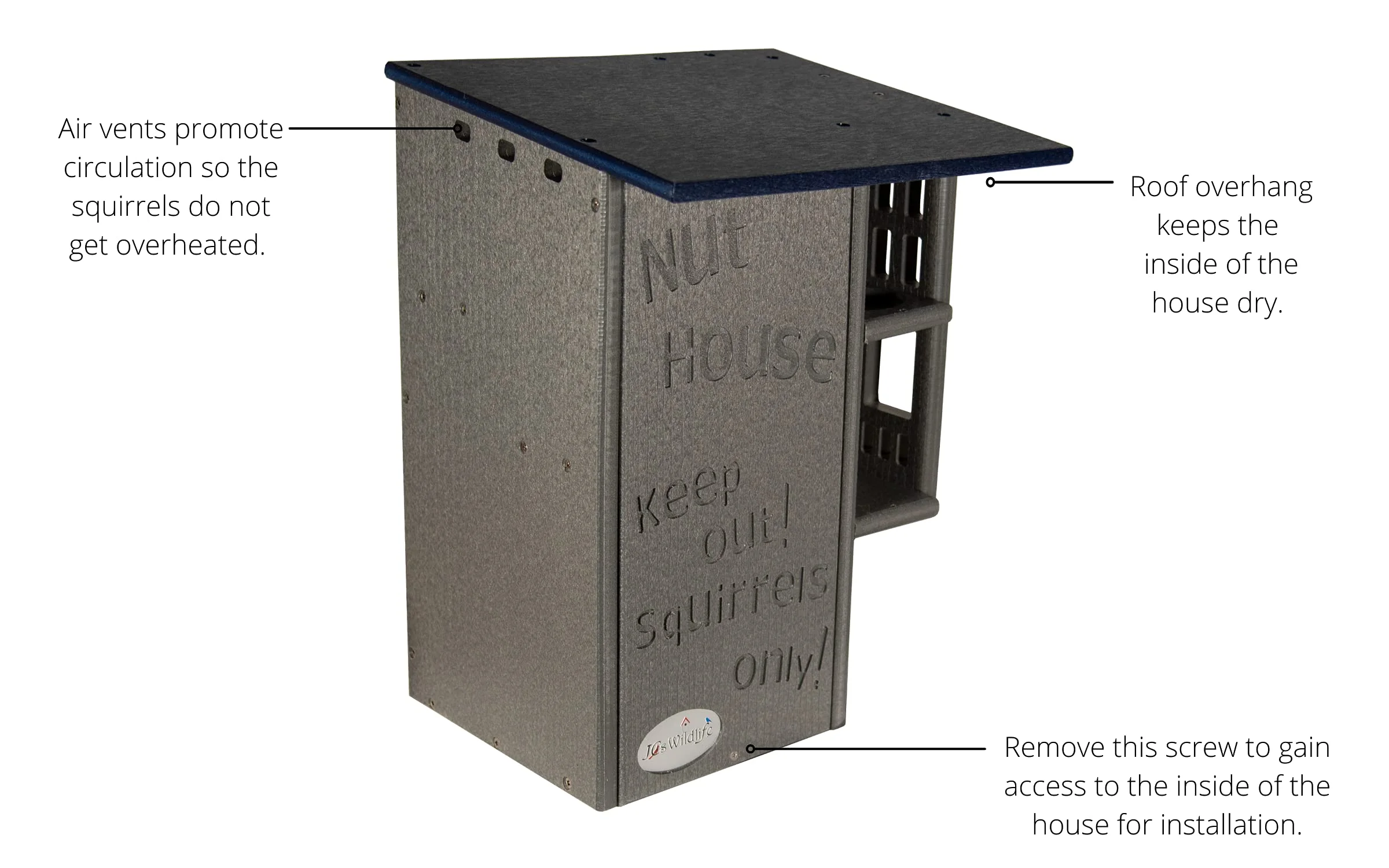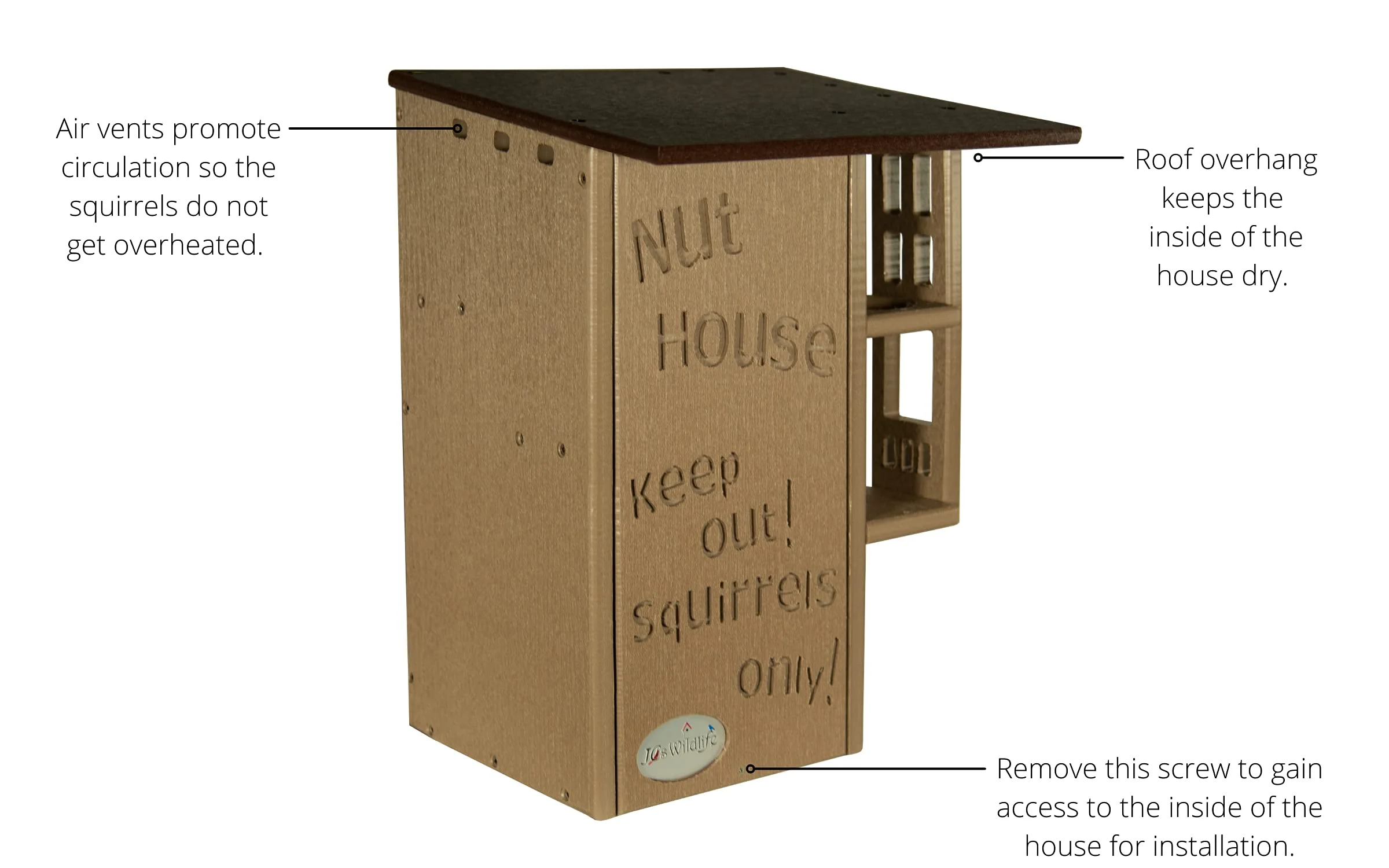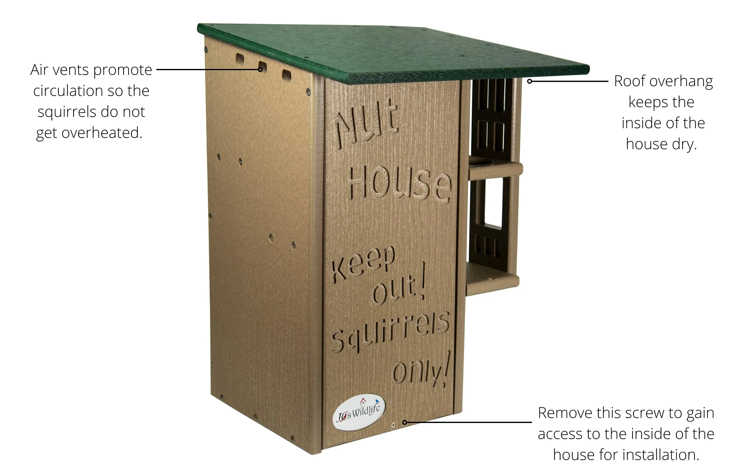 Invite your backyard's nuttiest creatures to move into their very own squirrel condo. The wording on the front says it all, it's the Nut House. This handmade squirrel house will keep the furry inhabitants entertained and safe at the same time. The resilient construction and innovative design is like no other home. This house is made specifically for squirrels. The predator guard and multi-tier platforms prevent predators like raccoons and opossums from having access to the inside. The front is able to be opened, providing easy access to clean the inside when it is empty. Our box gets rave reviews from squirrel enthusiasts and rehabilitators. Made in the USA!