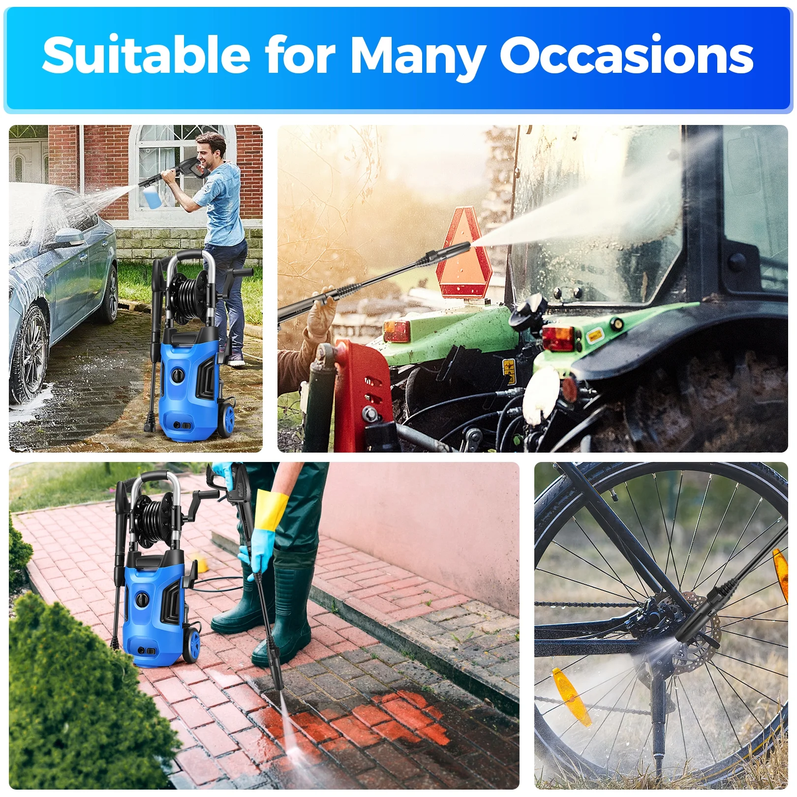 - ��CONVENIENCE��This power washer has unique retractable trolley bar and wheels, which is easy to move around like a mobile trolley case. The 35ft cord provides you with safe access to all external outlets.