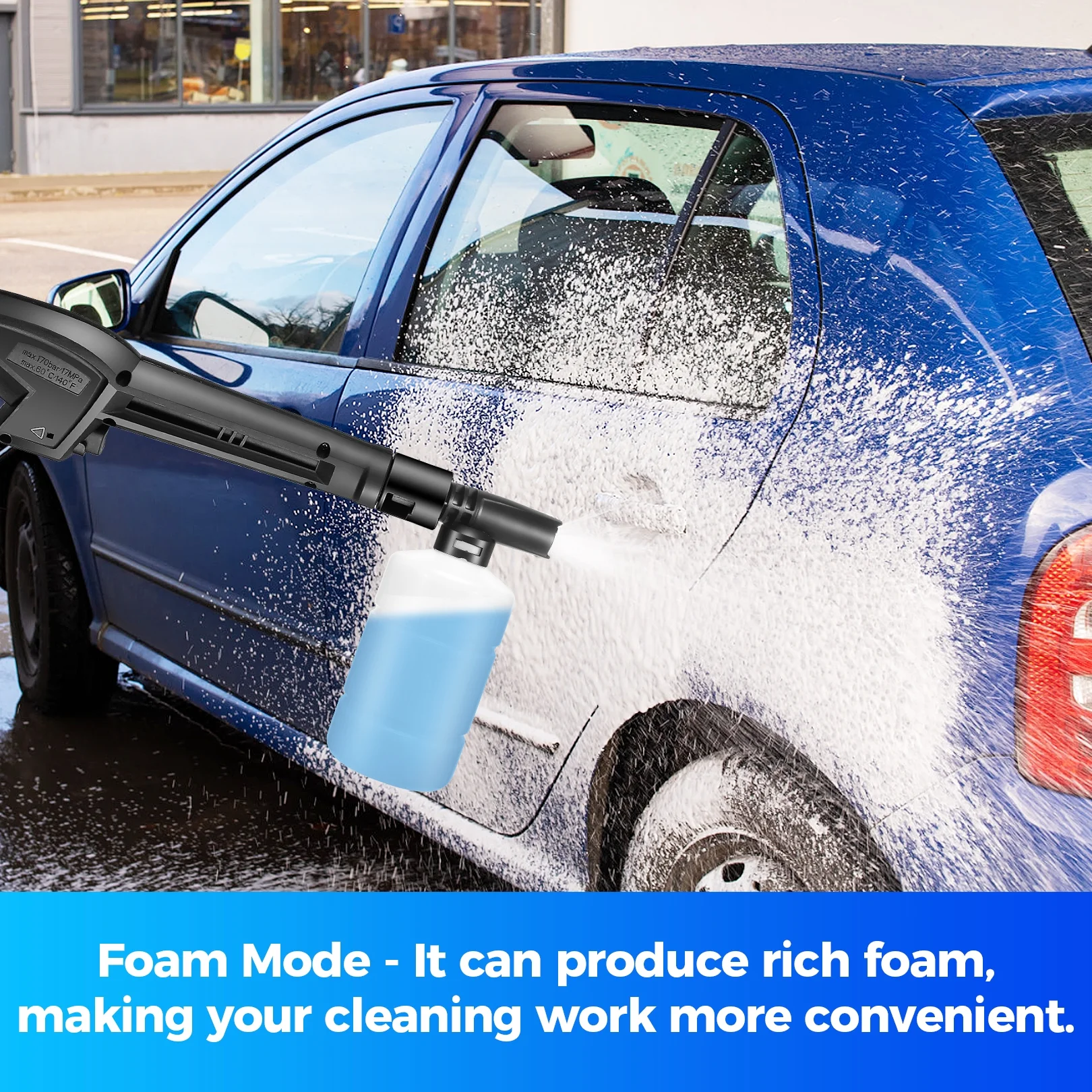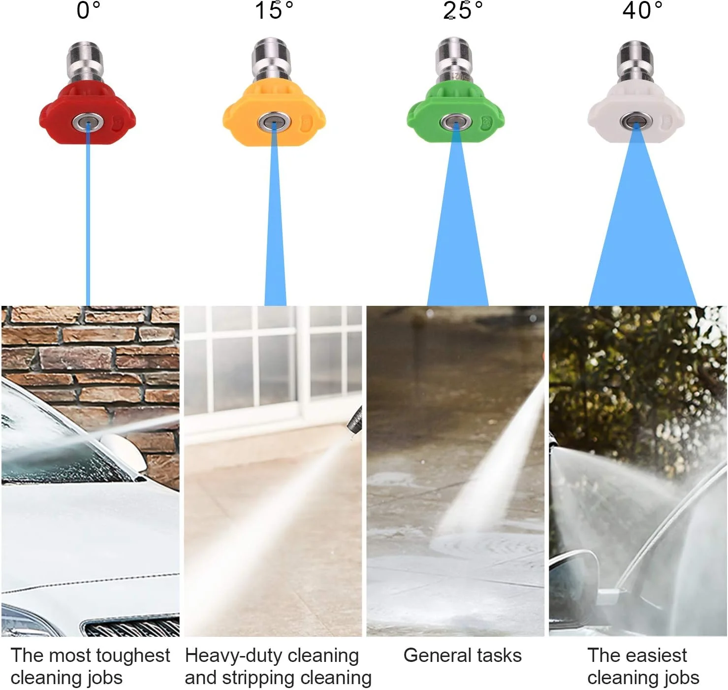 - ��4 UNIVERSAL QUICK CONNECT TIPS�� The 0�� tip delivers super high pressure for dissolving stubborn substances on hard surfaces. The 15�� tip delivers high pressure for concrete and brick with hard surfaces. The 25�� tip delivers medium pressure for wood decks and sidings with soft surfaces. The 40�� tip provides low pressure for windows and screens with fragile surfaces. The attached 500ml foam cannon can produce rich bubbles to wash your car.