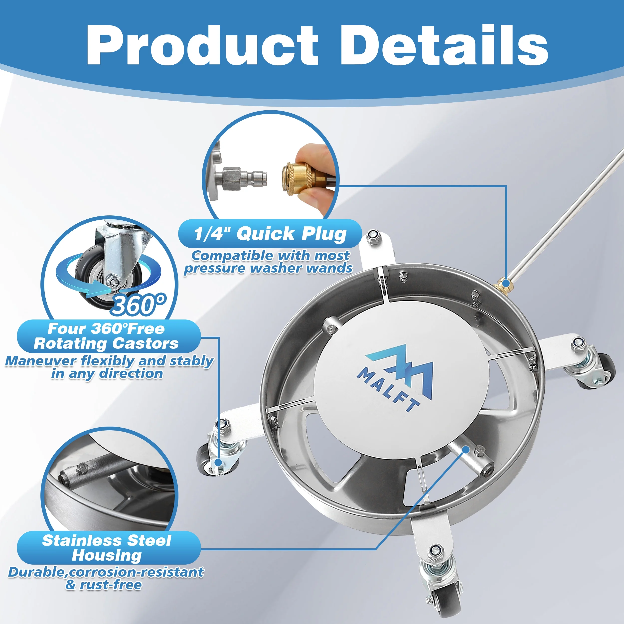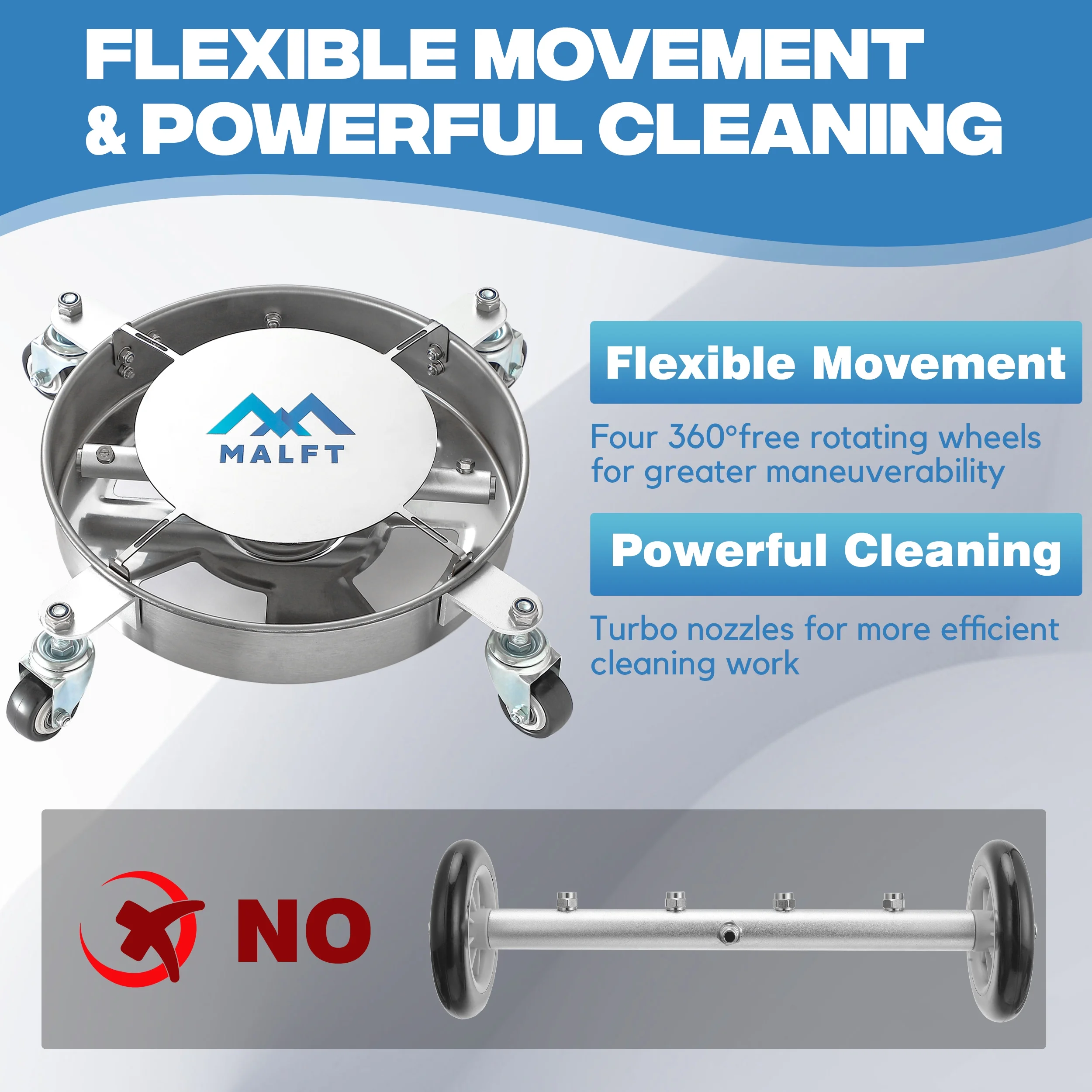 - 360�� Movable - Engineered with four 360�� rotatable wheels, the under car pressure washer attachment moves with unparalleled flexibility to suit your needs while maintaining exceptional balance. Say goodbye to the limitations of ordinary underbody washers that can only move in a linear fashion.