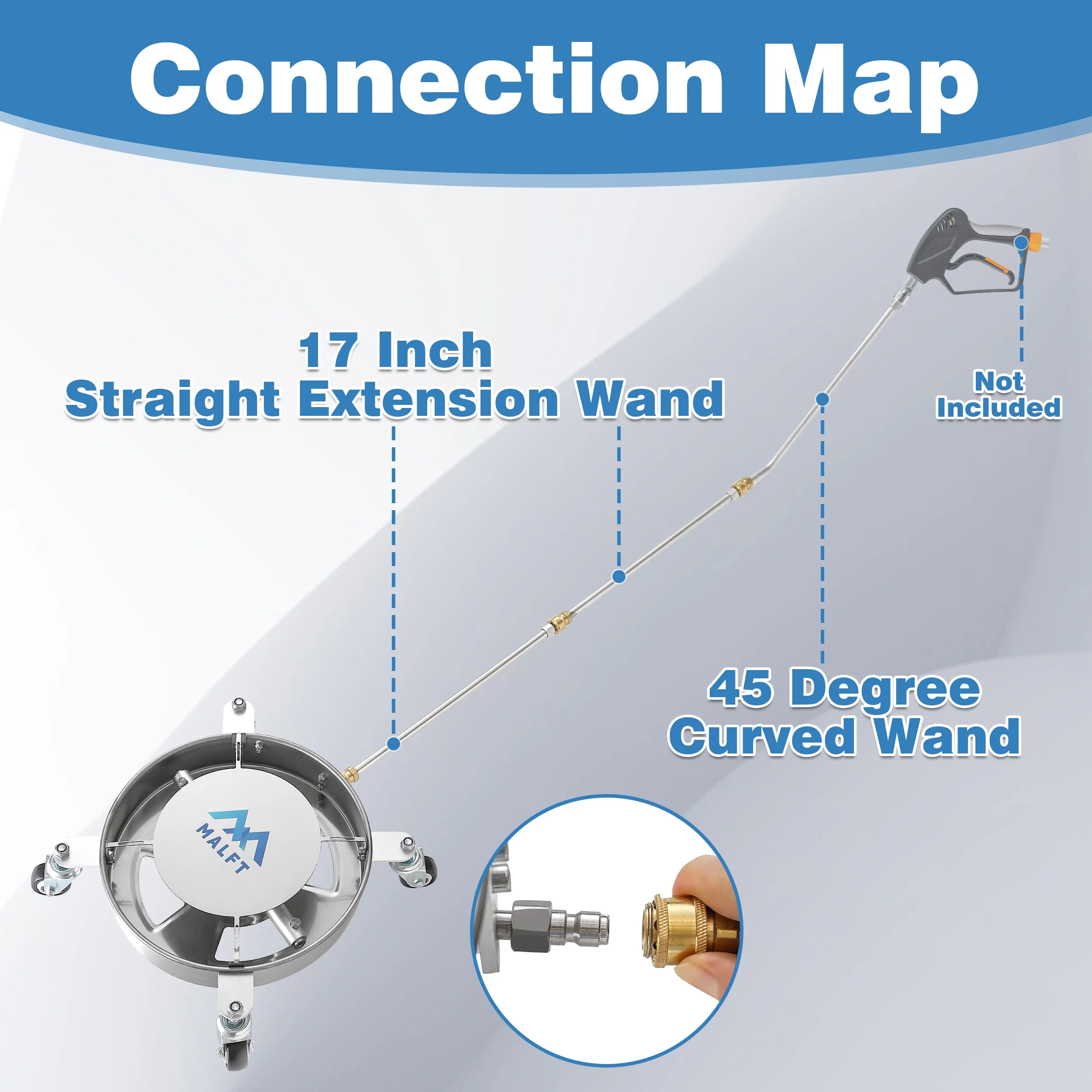 - Widely Compatible - Equipped with 1/4�� quick connector, the power washer undercarriage attachment can seamlessly and swiftly connect with most extension wands and pressure washer guns available in the market. This makes it ideal and convenient for cleaning the bottom of your vehicles, especially when paired with three 17�� extended power washer wands.