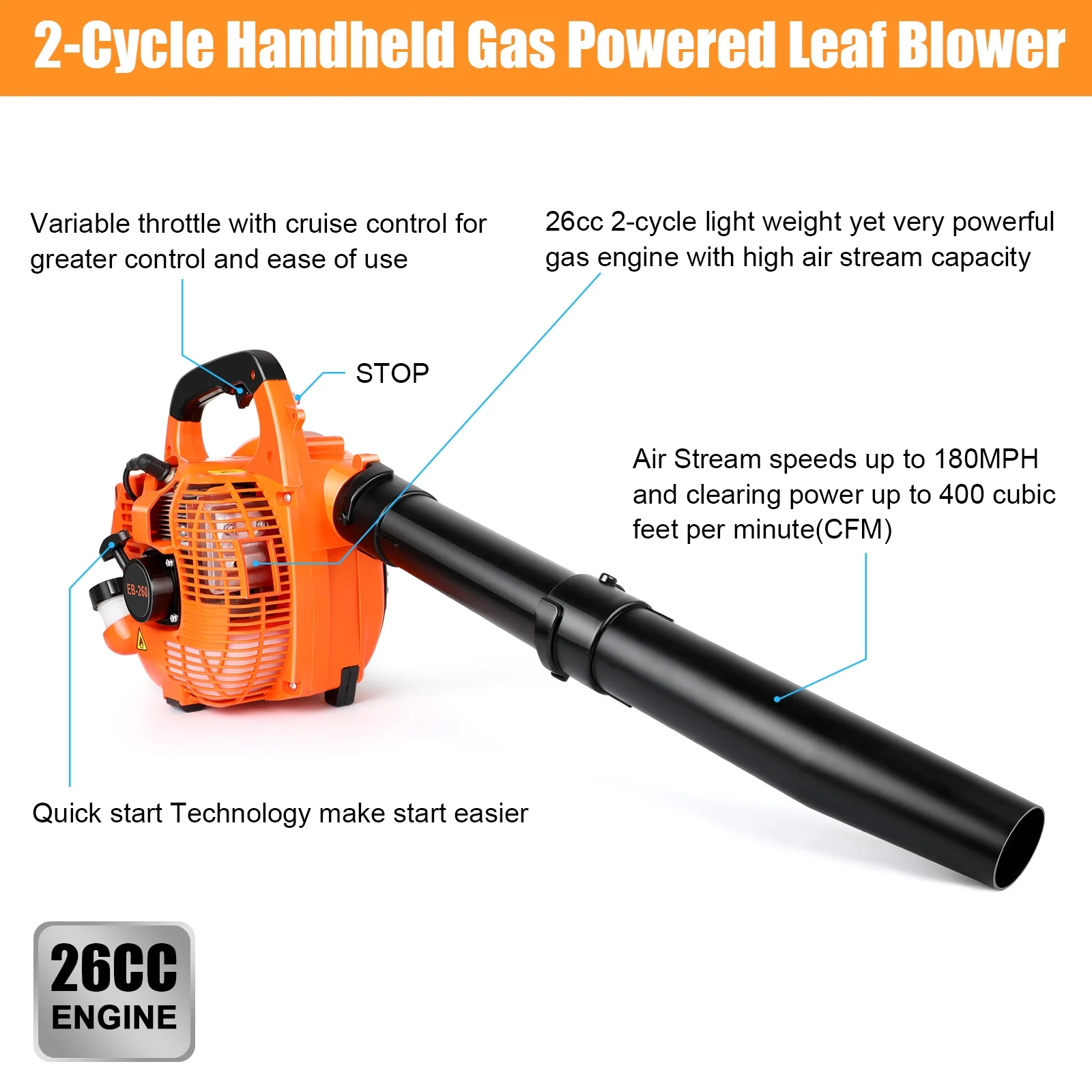 Material: Large air volume and gas powered design makes it labor-saving and powerful for high efficiency operation. It is made of ABS and metal material. The length of the outlet is adjustable, easy to start and operate.