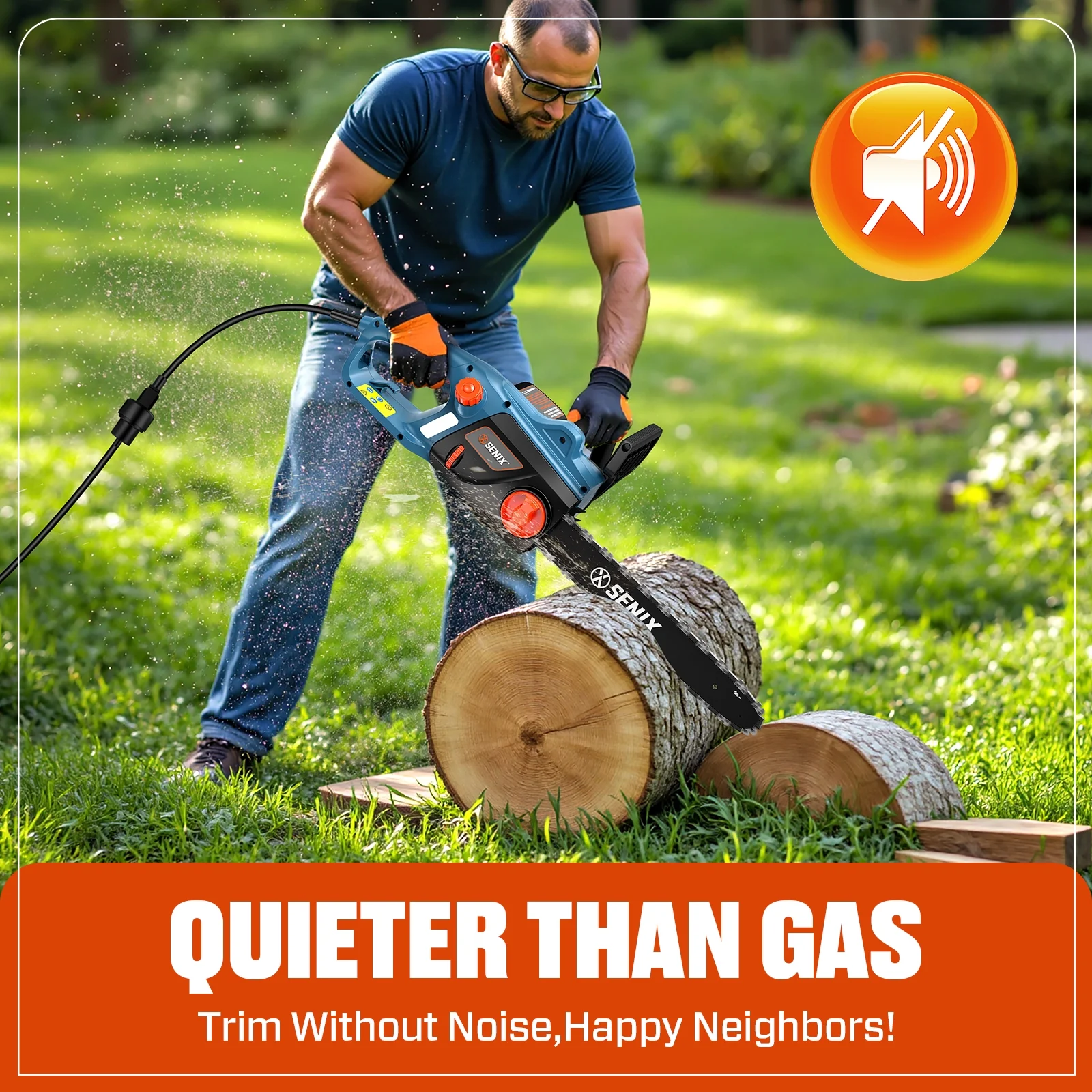 Simplify garden work with the SENIX CSE15-M 18-inch electric chainsaw, ideal for trimming branches and trees. It features an 18-inch bar, 3/8-inch pitch chain, and 14.5 m/s chain speed for aggressive, smooth cutting. The 120V 15-amp motor delivers powerful performance, while an automatic oiler with a 5.7-ounce tank ensures continuous bar and chain lubrication. Tool-less chain adjustment allows easy customization, and safety features include a trigger lock and automatic kickback brake. Includes a bar and chain cover for storage/transport safety.Backed by a 3-year limited warranty.