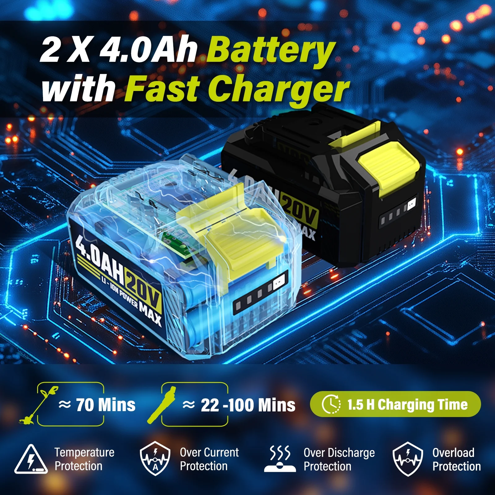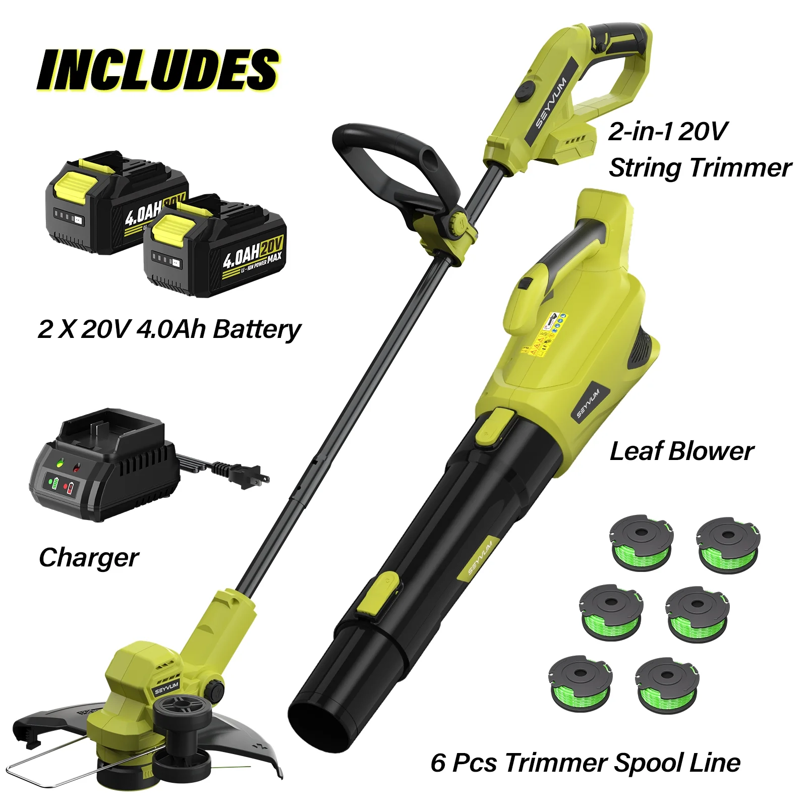 - 2 x 4.0Ah Batteries & Fast Charger: The Lawn Care Combo Kit includes two 4.0Ah lithium-ion batteries and a 1.5-hour fast charger. Get up to 70 minutes of weed wacker run time. The blower offers about 100 minutes at low speed and approximately 22 minutes on powerful high mode. Always ensure the battery is cool before charging