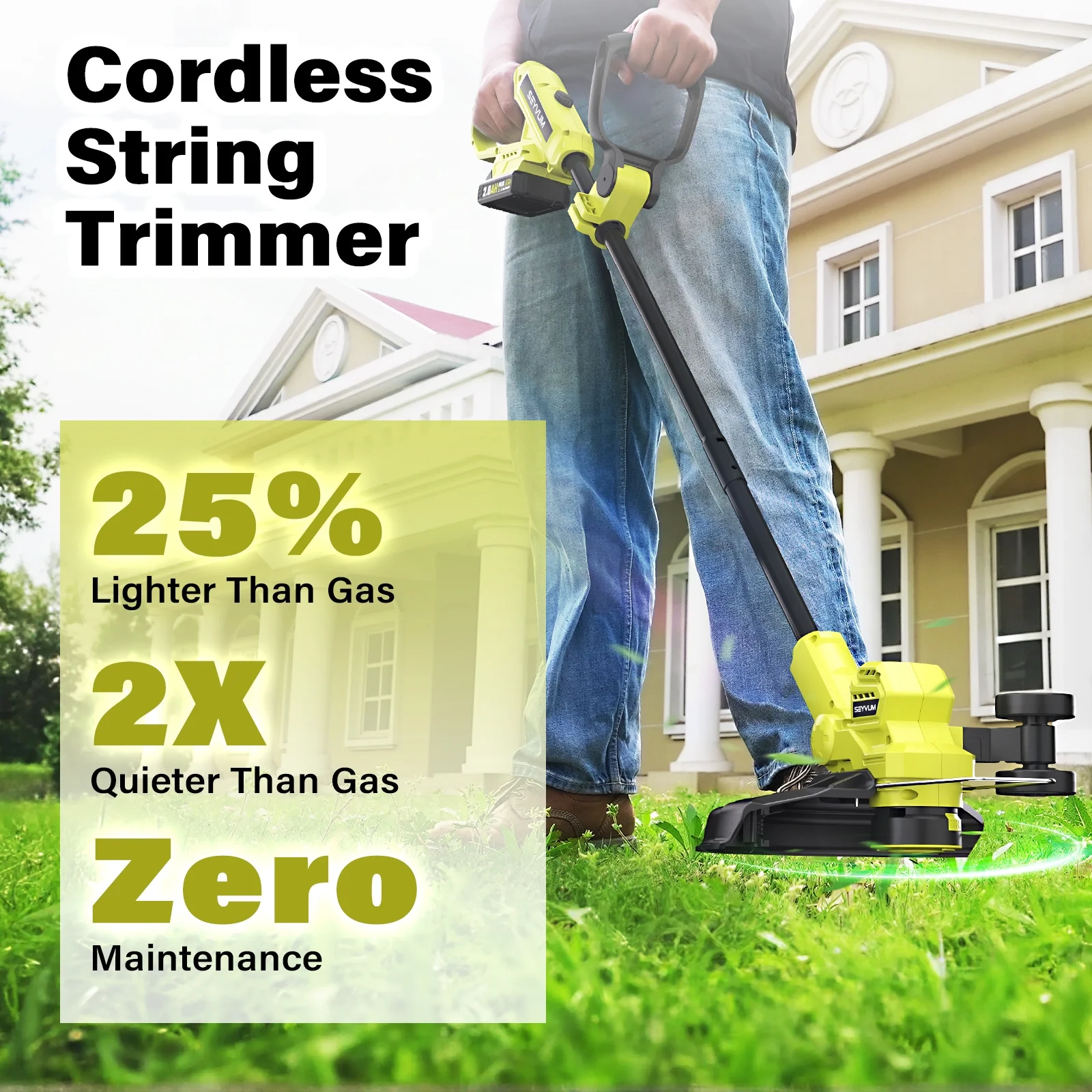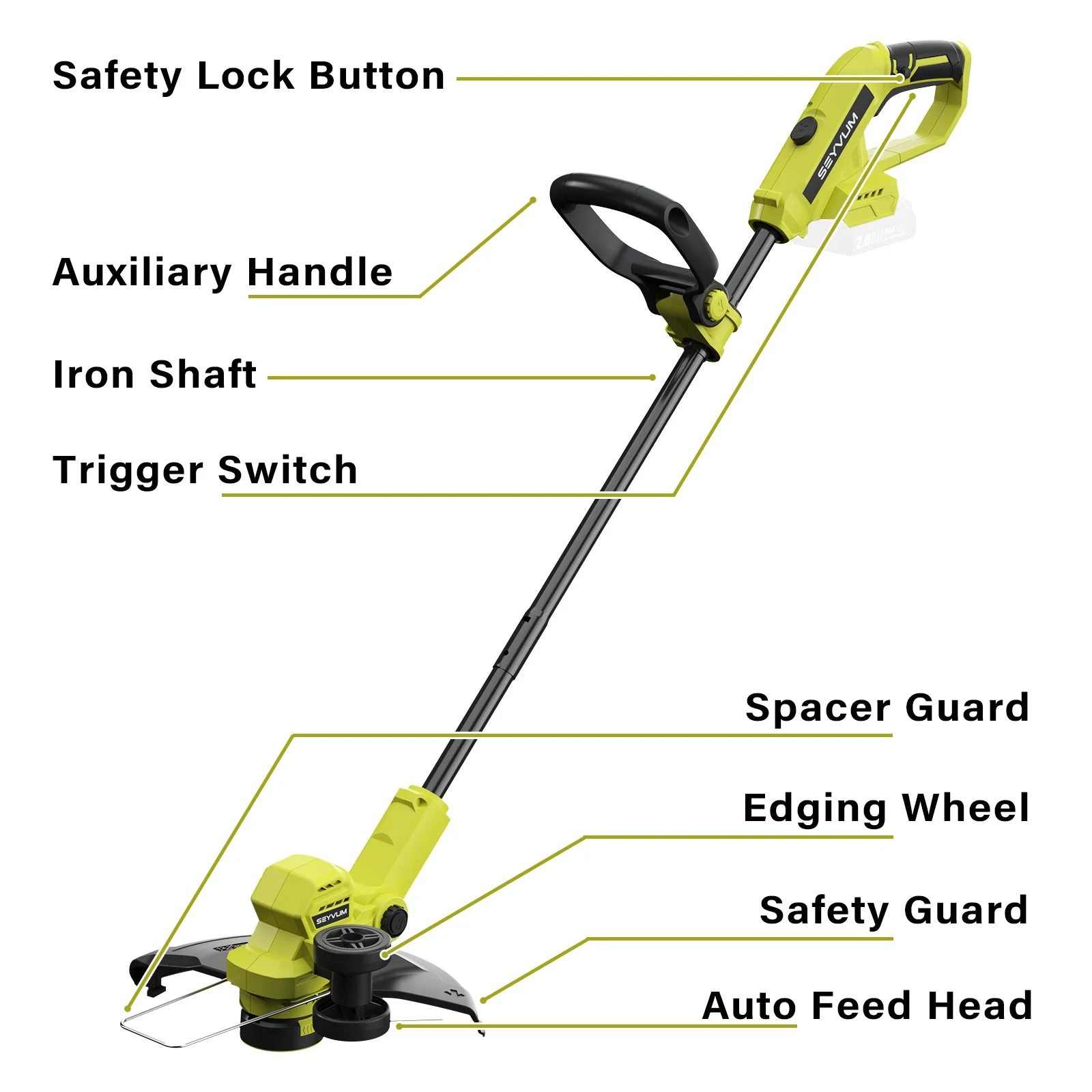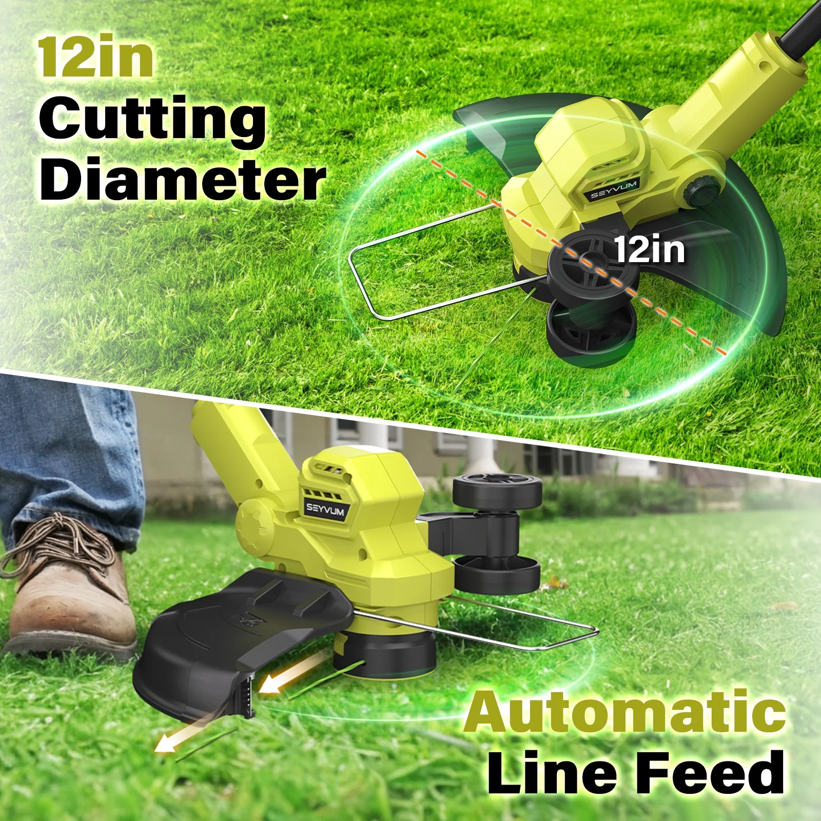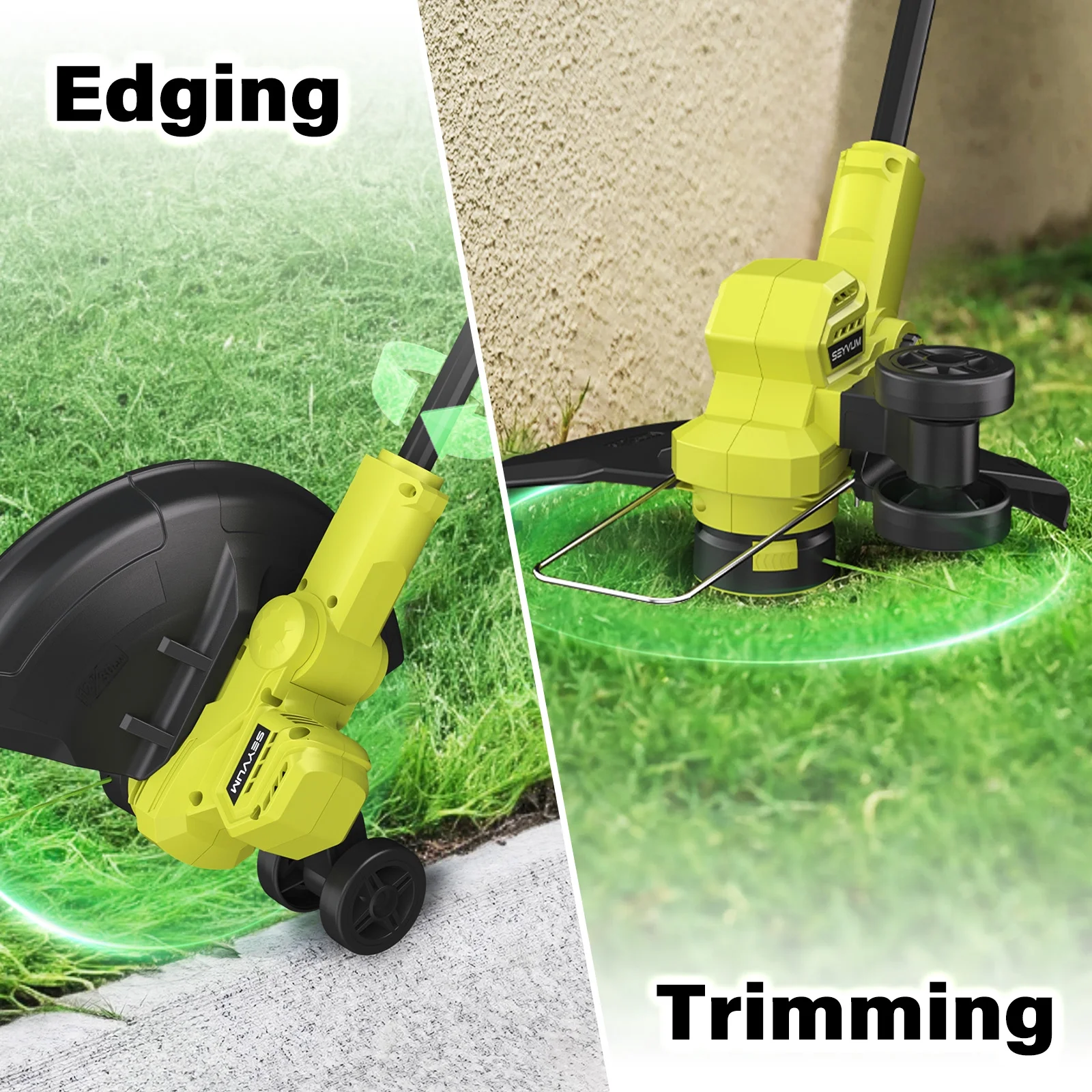 - Trimmer & Edger 2-in-1: This 2-in-1 grass trimmer as both a weed trimmer and a wheeled edger, easily switching between the two to handle various lawn care tasks. It also features a spacer guard that helps prevent accidental damage to your plants, landscaping elements, and garden decorations.